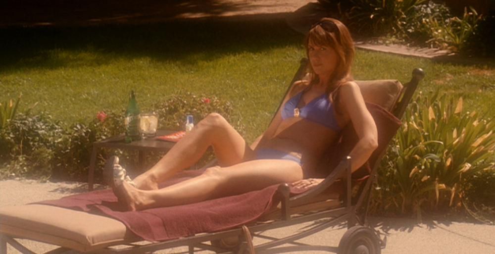 Kristen is lying back in a lounge chair by a pool in a purple bikini as a guy checks her out in a fantasy sequence and narrates it before rubbing her shoulders and starting to undo her bikini top.