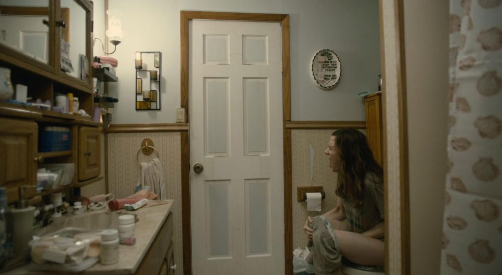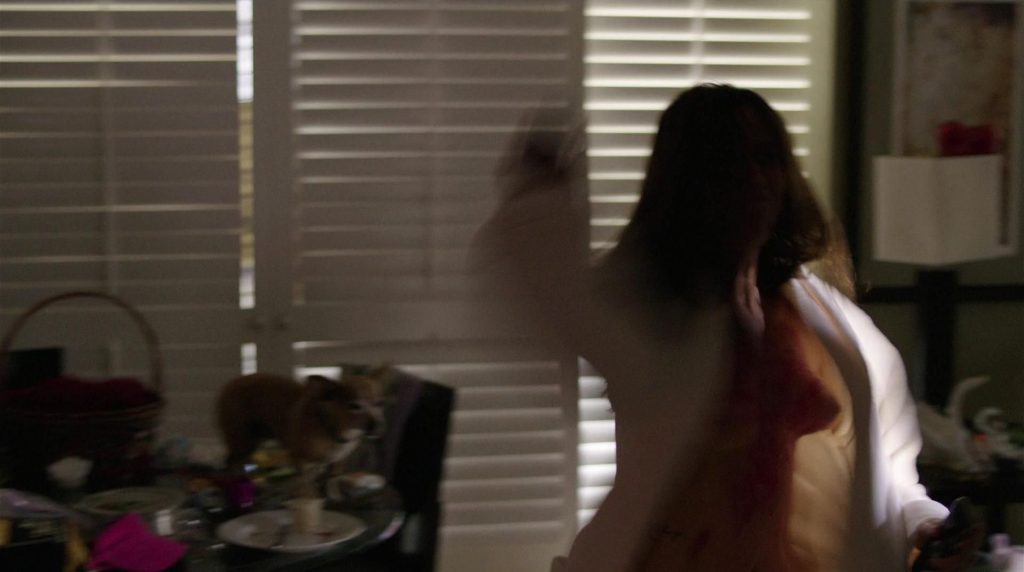 In a dimly lit shot, Kristen throws something in a fit of rage, and her robe flies open revealing her rack!