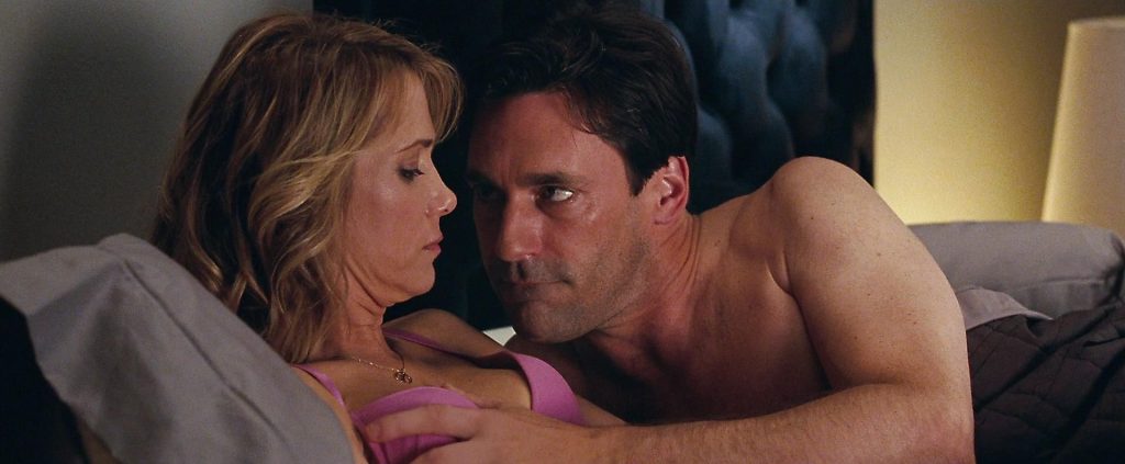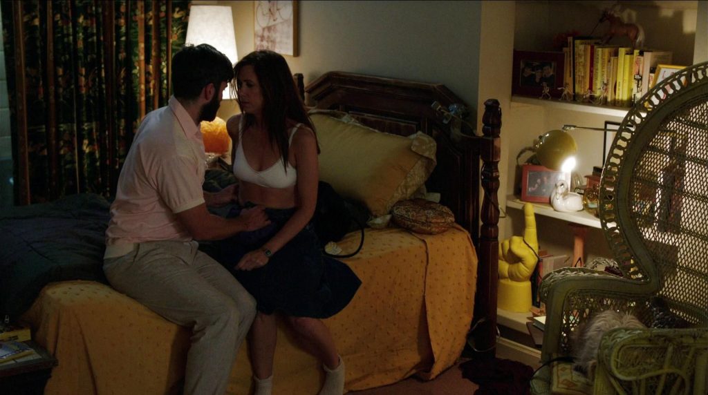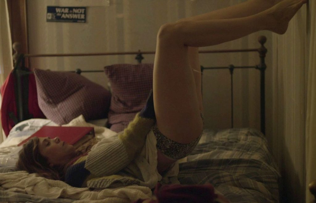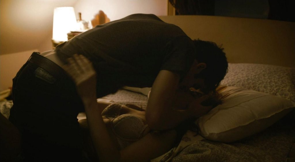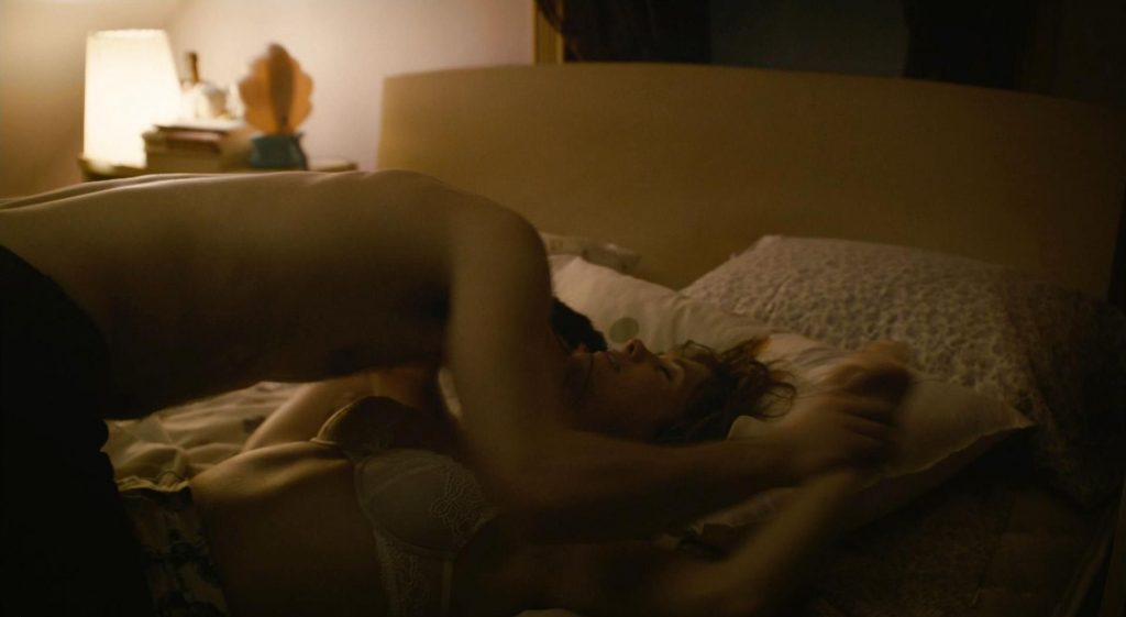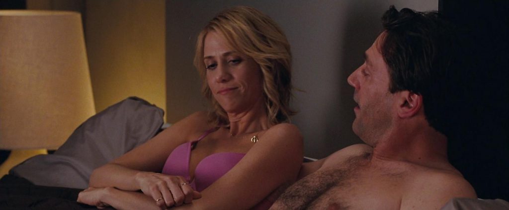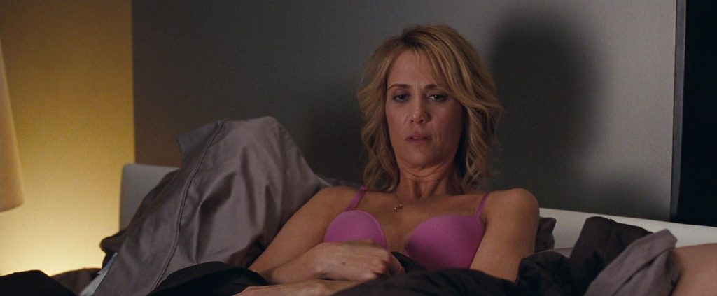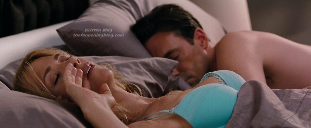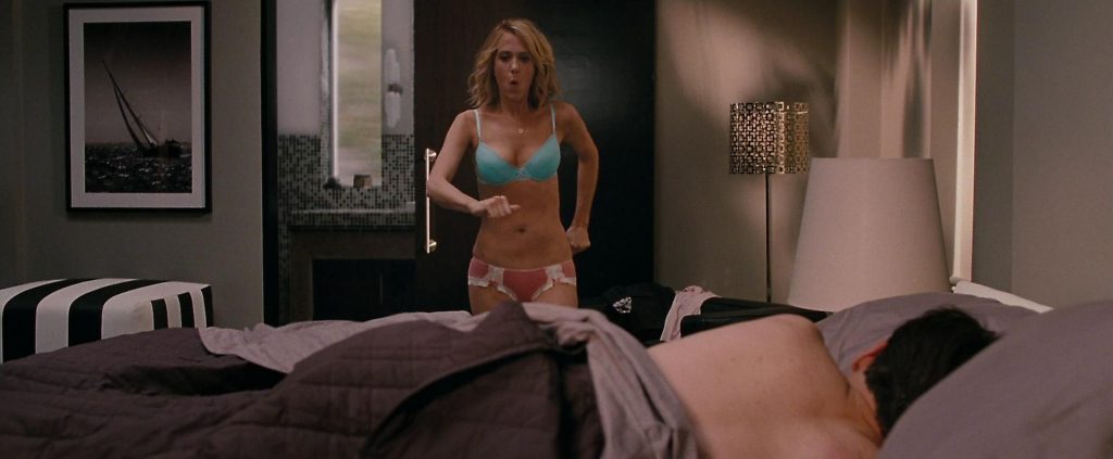 Kristen Wiig is having sex with a guy in bed while wearing a blue bra, showing some cleavage in a few different positions.