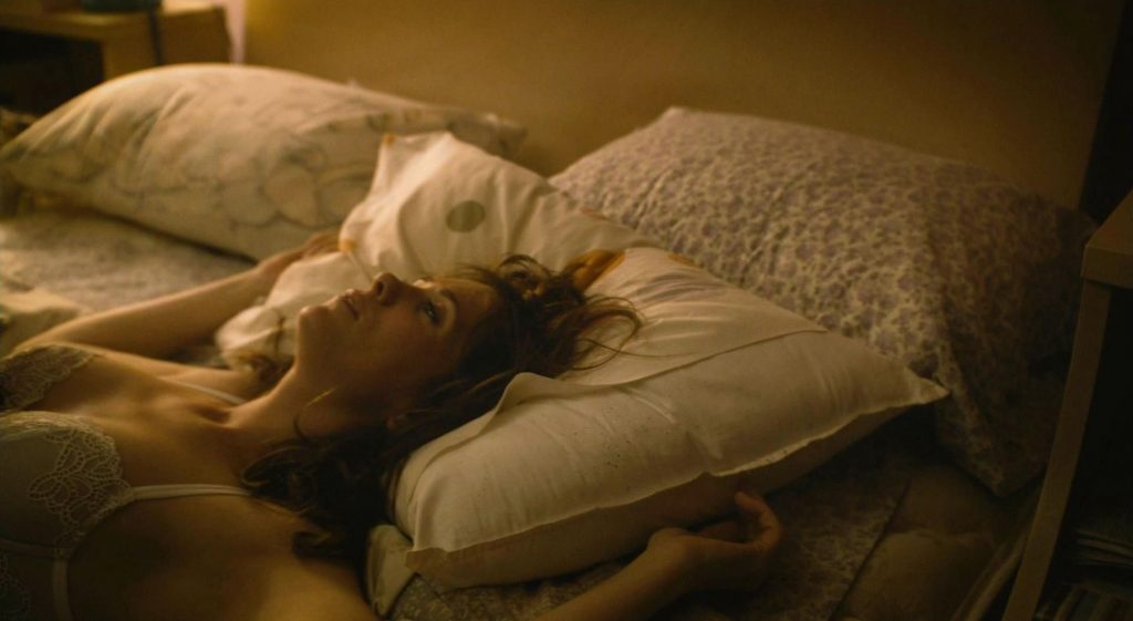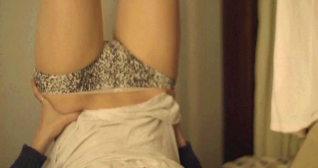 We then see Kristen the next morning as she walks out of the bathroom in the same bra and some pink panties, slipping into bed with the guy as he wakes up and they talk.
