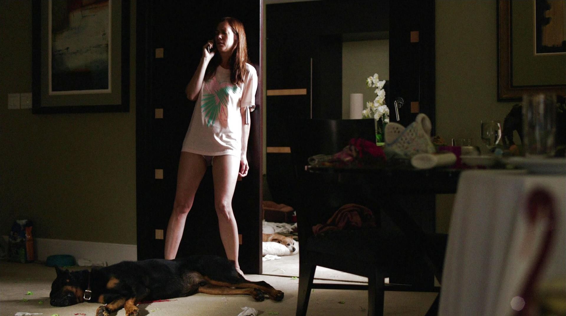 In a dimly lit shot, Kristen throws something in a fit of rage, and her robe flies open revealing her rack!