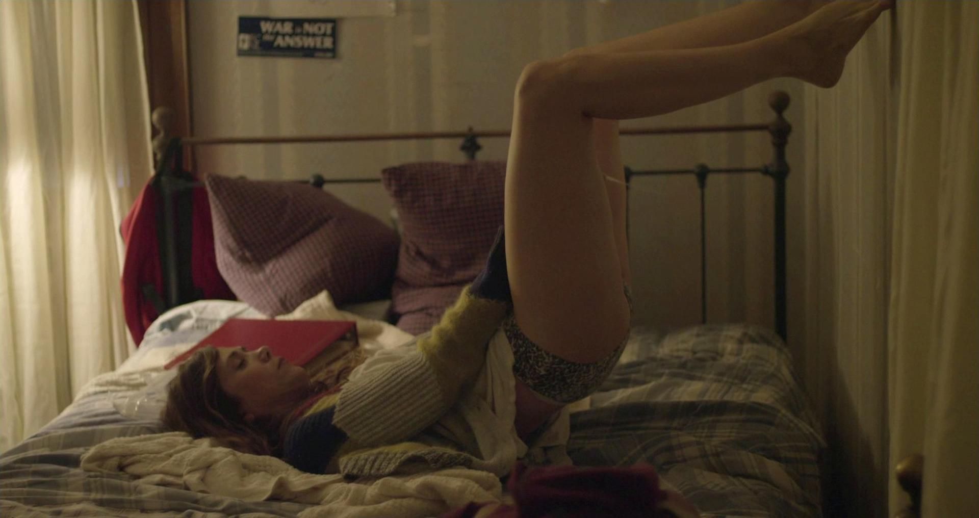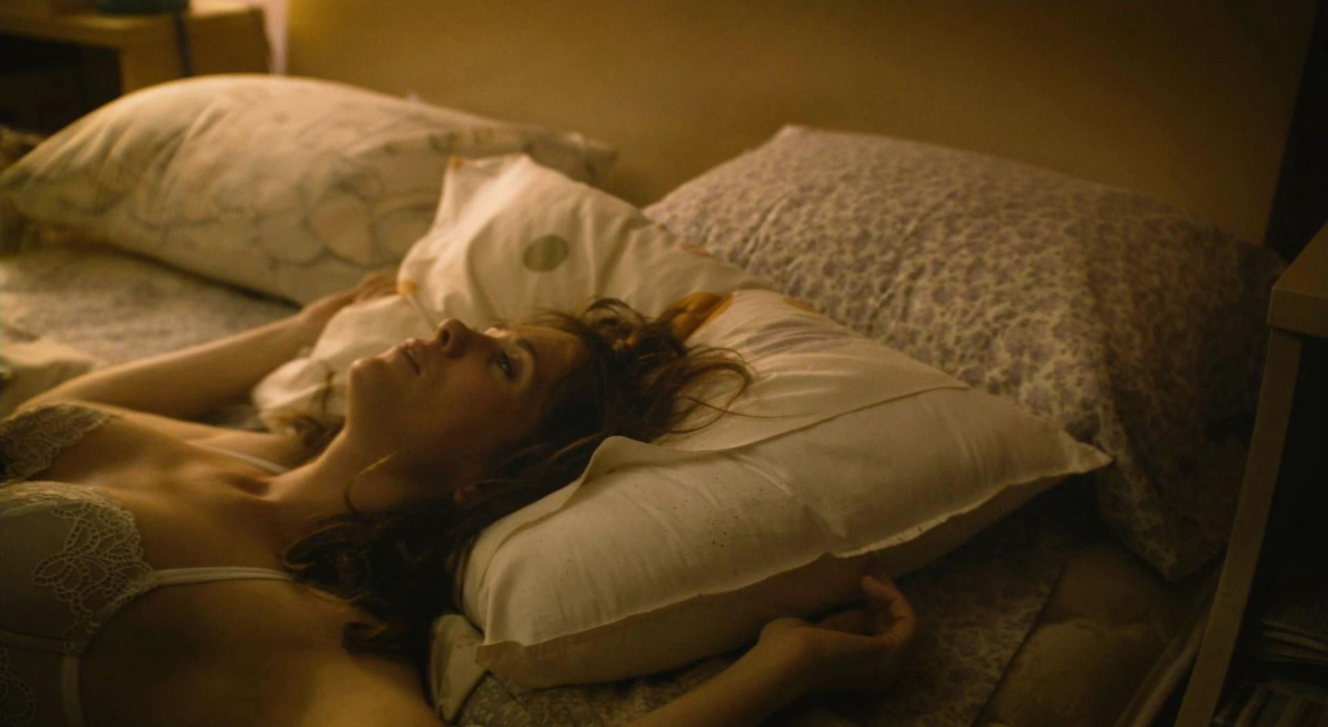 We then see Kristen the next morning as she walks out of the bathroom in the same bra and some pink panties, slipping into bed with the guy as he wakes up and they talk.