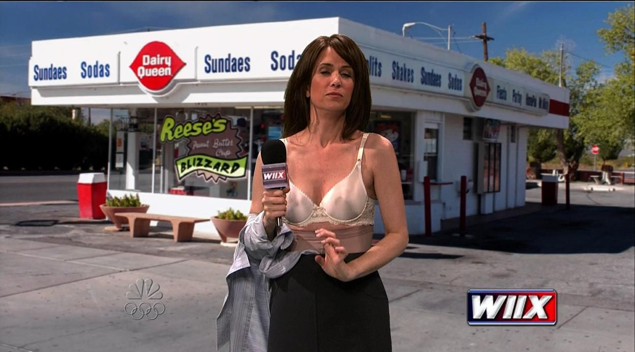 Kristen Wiig is wearing a purple bikini as she stands in front of a mirror and checks herself out. We then see her on a TV set pulling her dress open to reveal the same bikini underneath and then strutting around a little.