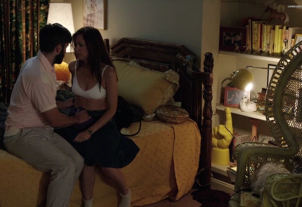 Kristen Wiig is having sex with a guy in bed while wearing a blue bra, showing some cleavage in a few different positions.