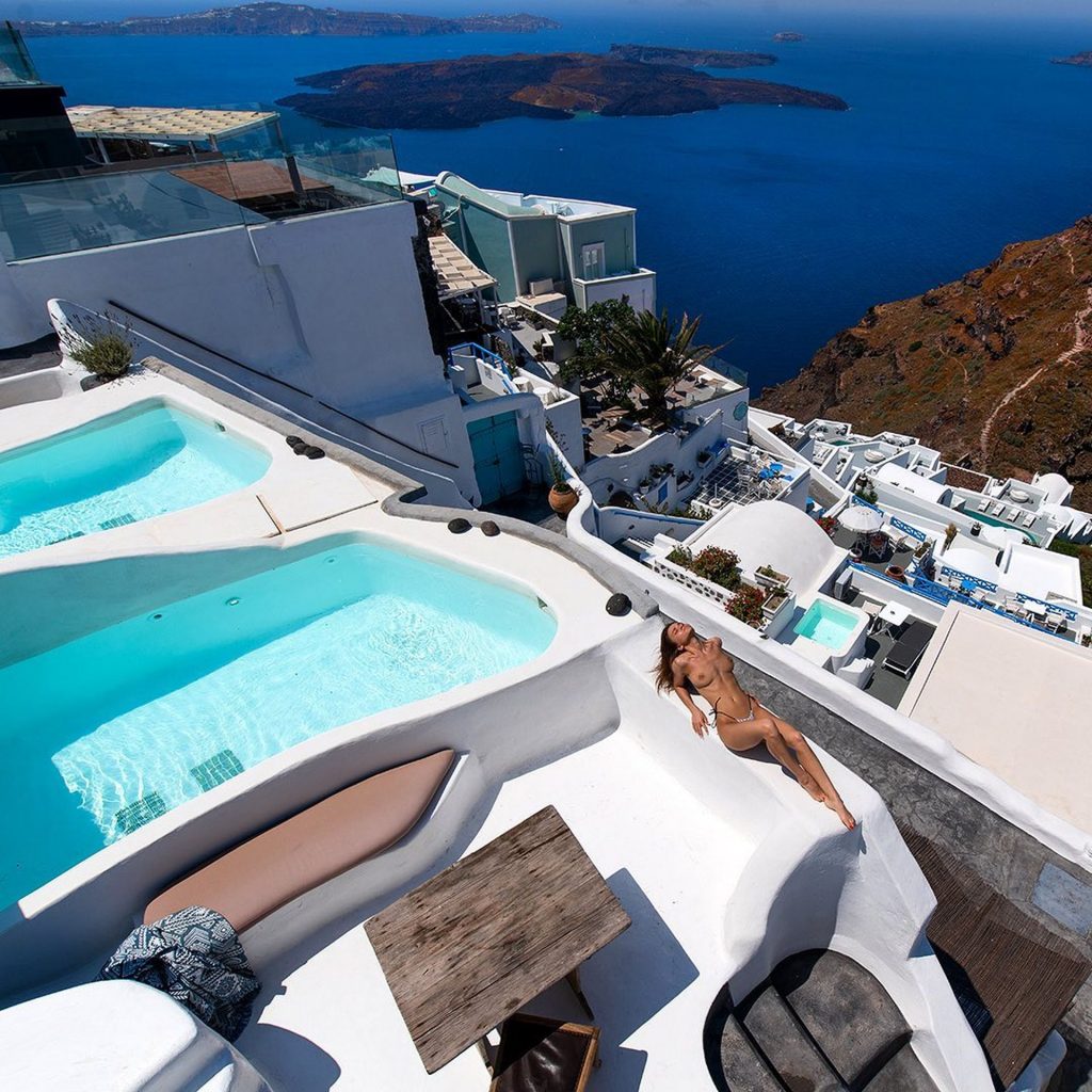 Российская модель Кристина Макарова, также известная как Kris Strange, позирует обнажённой на балконе на острове Санторини с фотографом Владимиром Николаевым, также известным как Vavaka (2020).