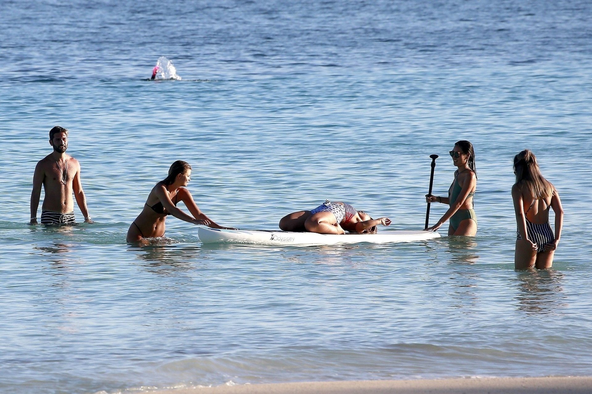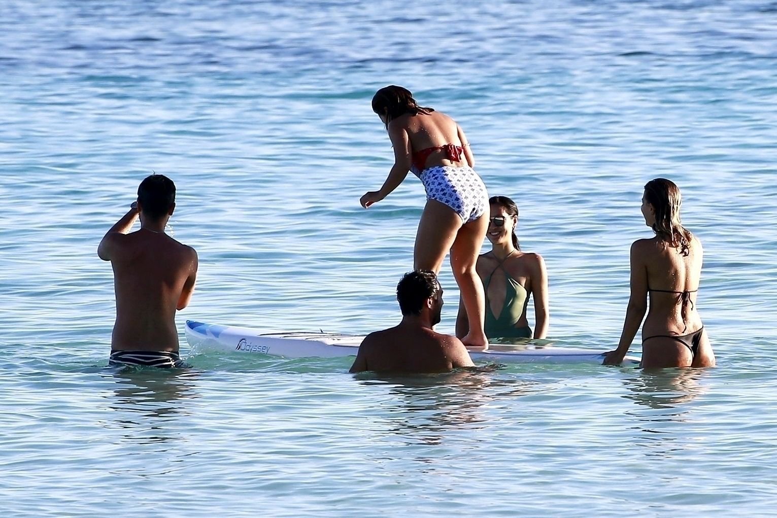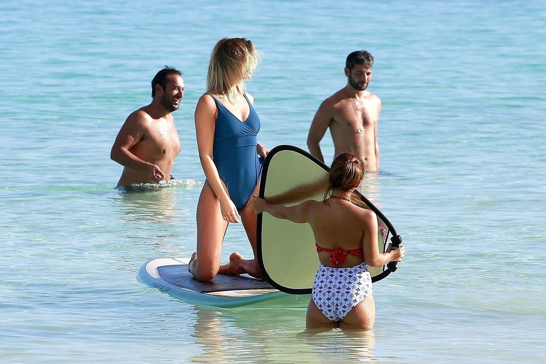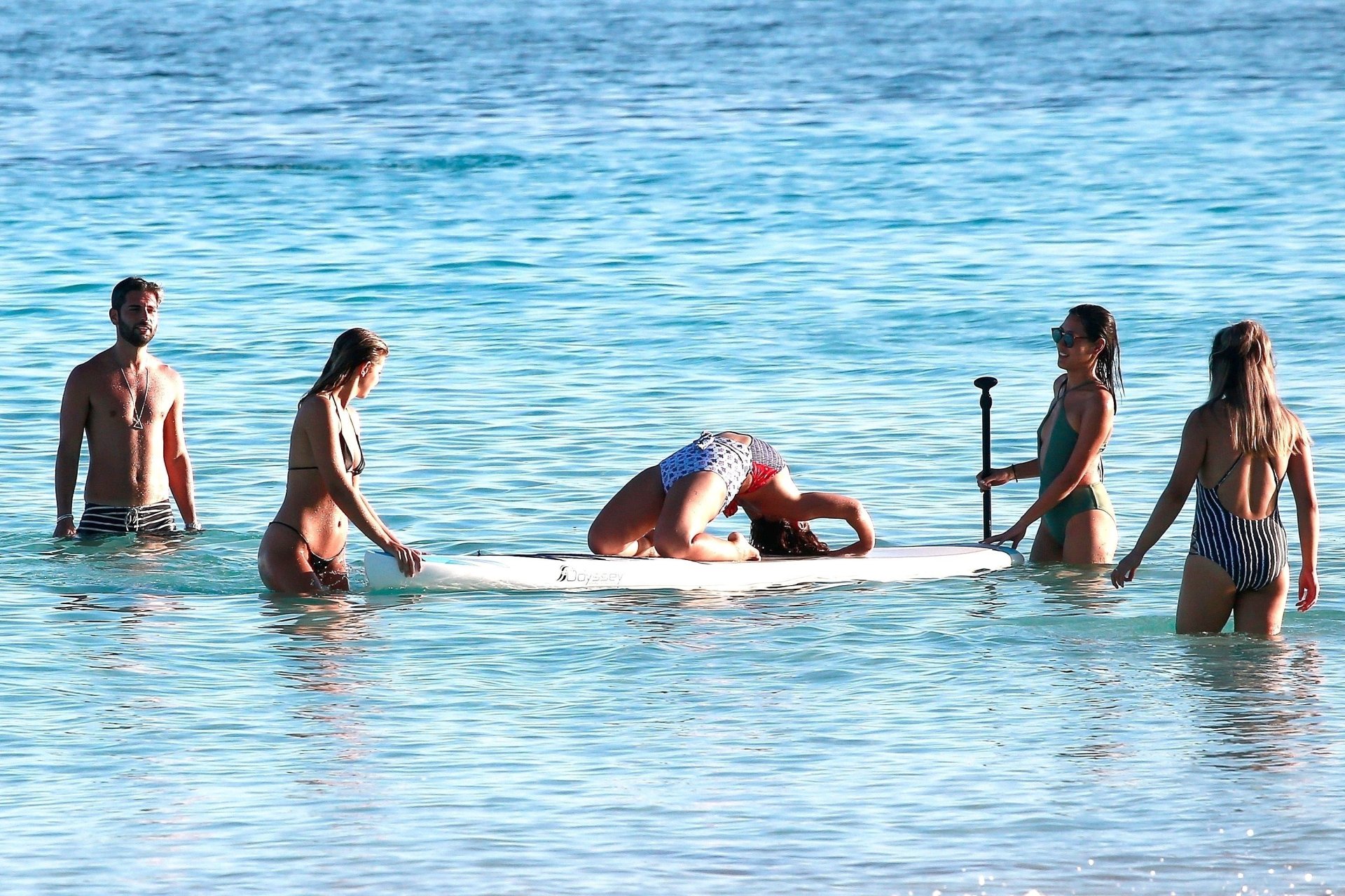 Кристина Мендонса отправляется на пляж для фотосессии в купальниках на прозрачных голубых водах Канкуна, 27.11.2017. 20-летняя австралийская модель примерила четыре разных наряда: два бикини и два цельных купальника, позируя на паддлборде.