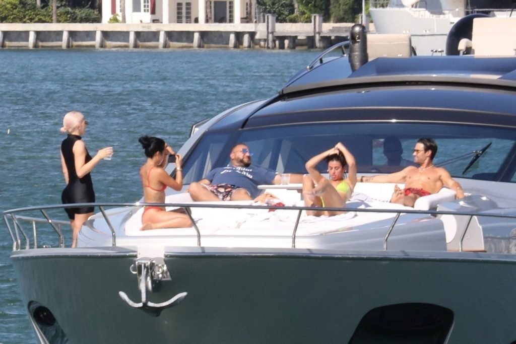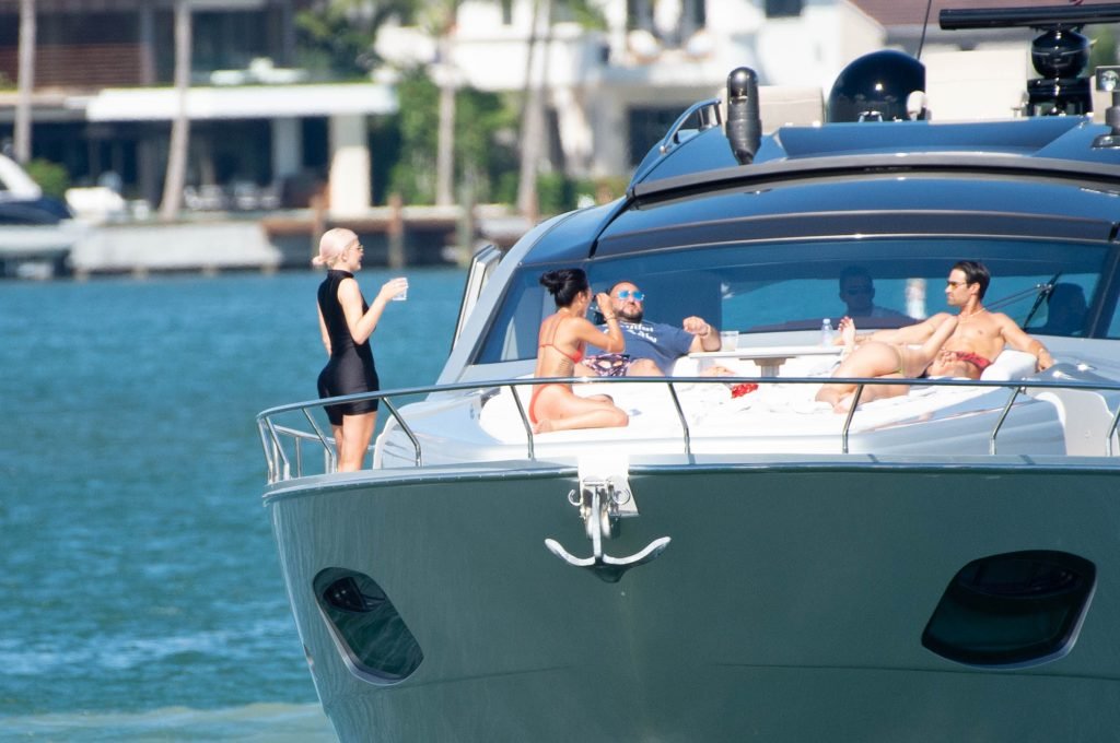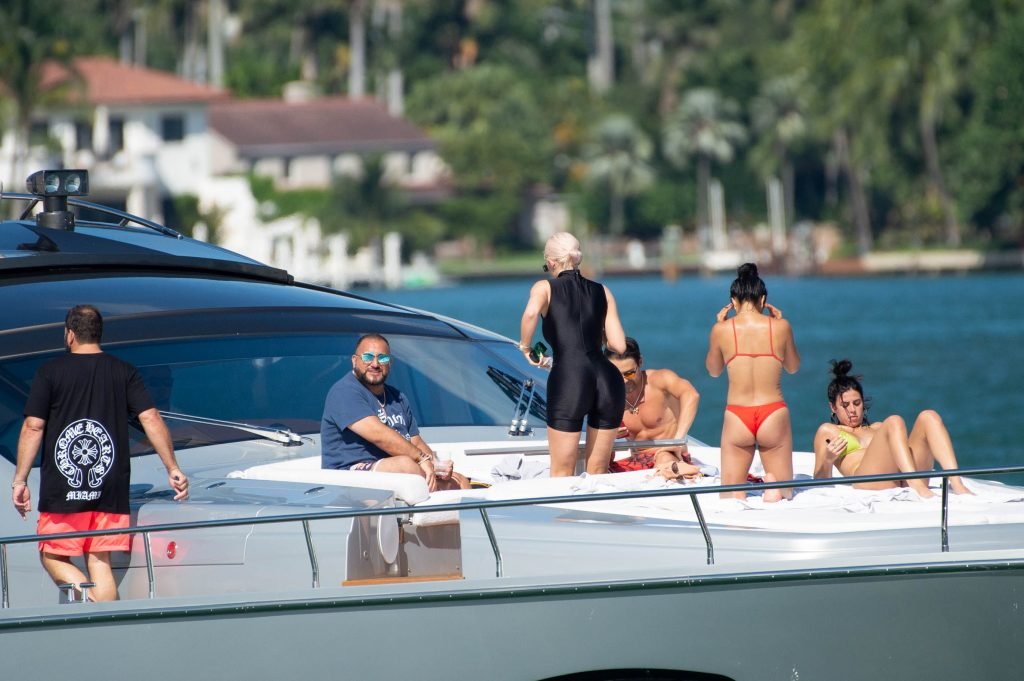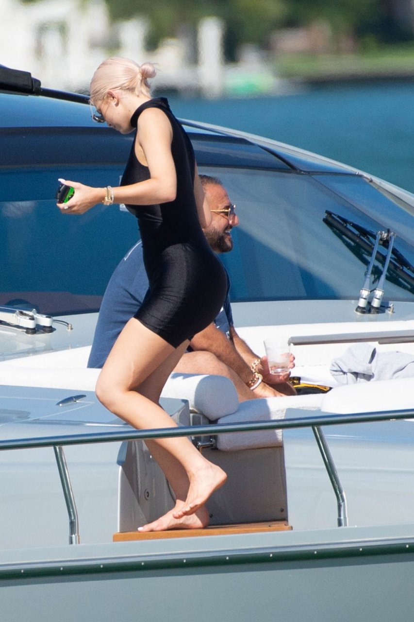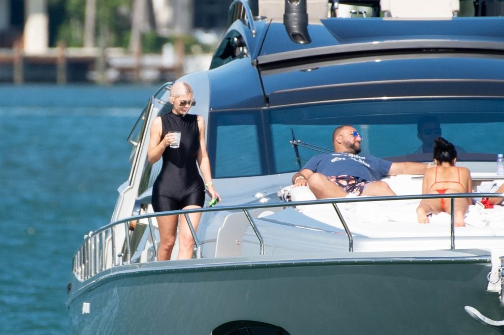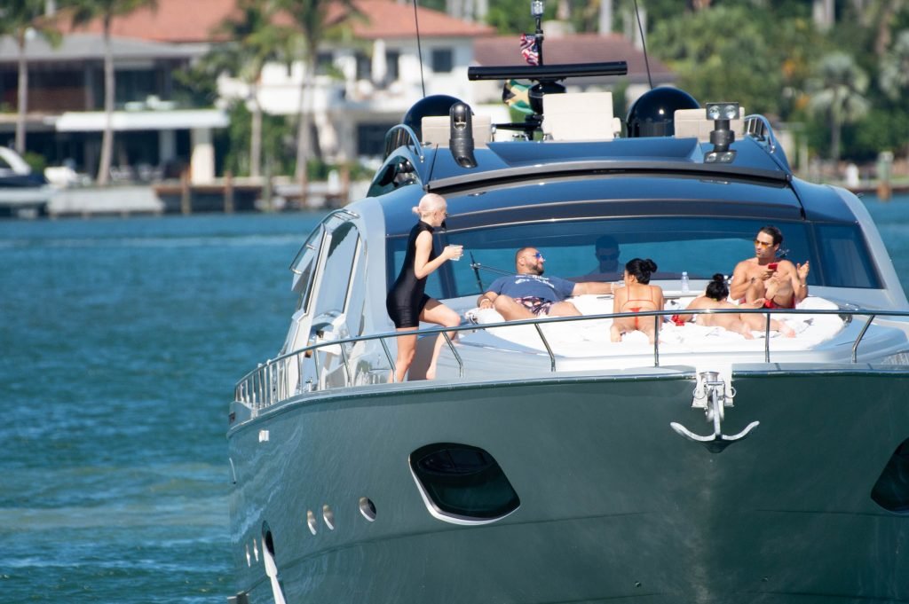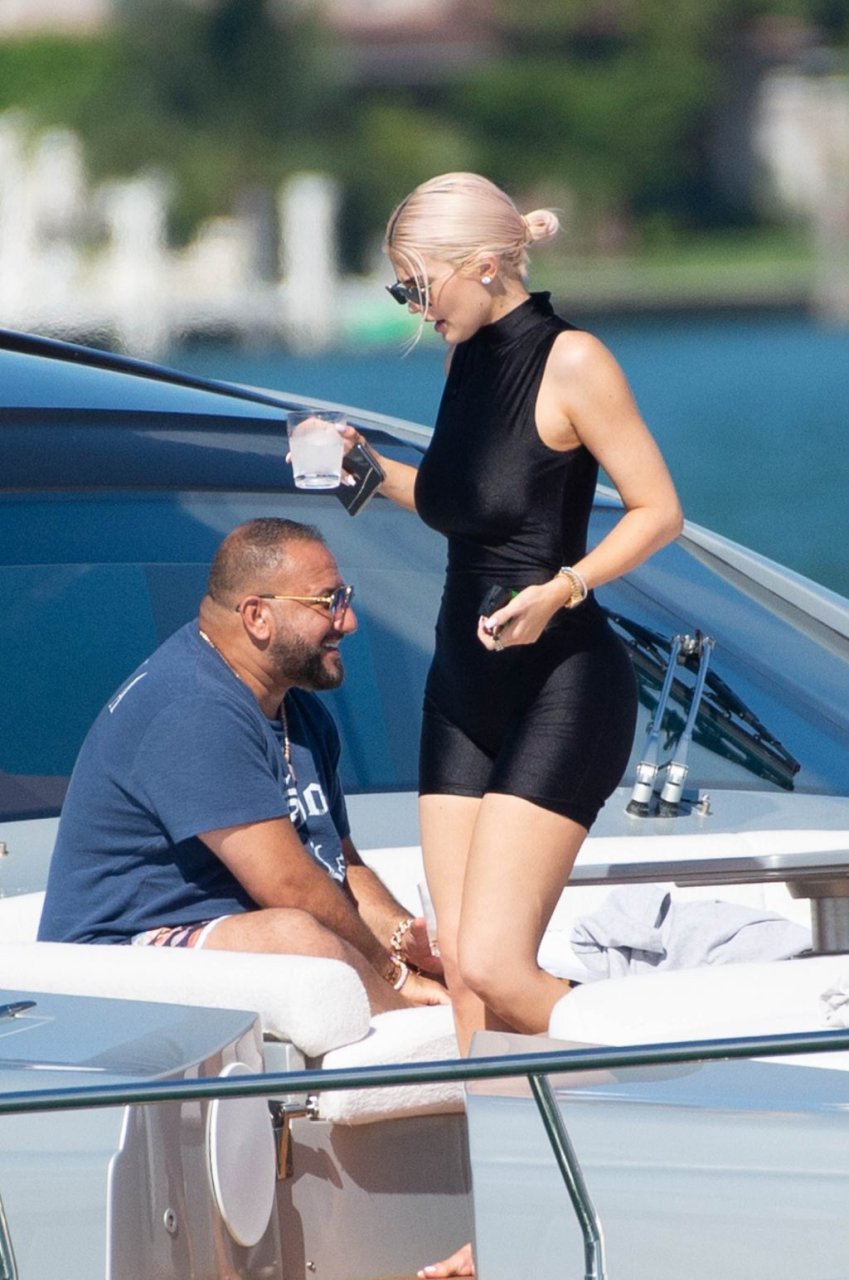 Kylie Jenner (21) садится на борт The Groot со своей дочерью Сторм и лучшей подругой Джордин Вудс в Майами-Бич, 01.10.2018. Кайли видно, как она берет ребенка на борт, а затем наслаждается солнцем и едой с друзьями, демонстрируя свои формы в черном цельном купальнике.