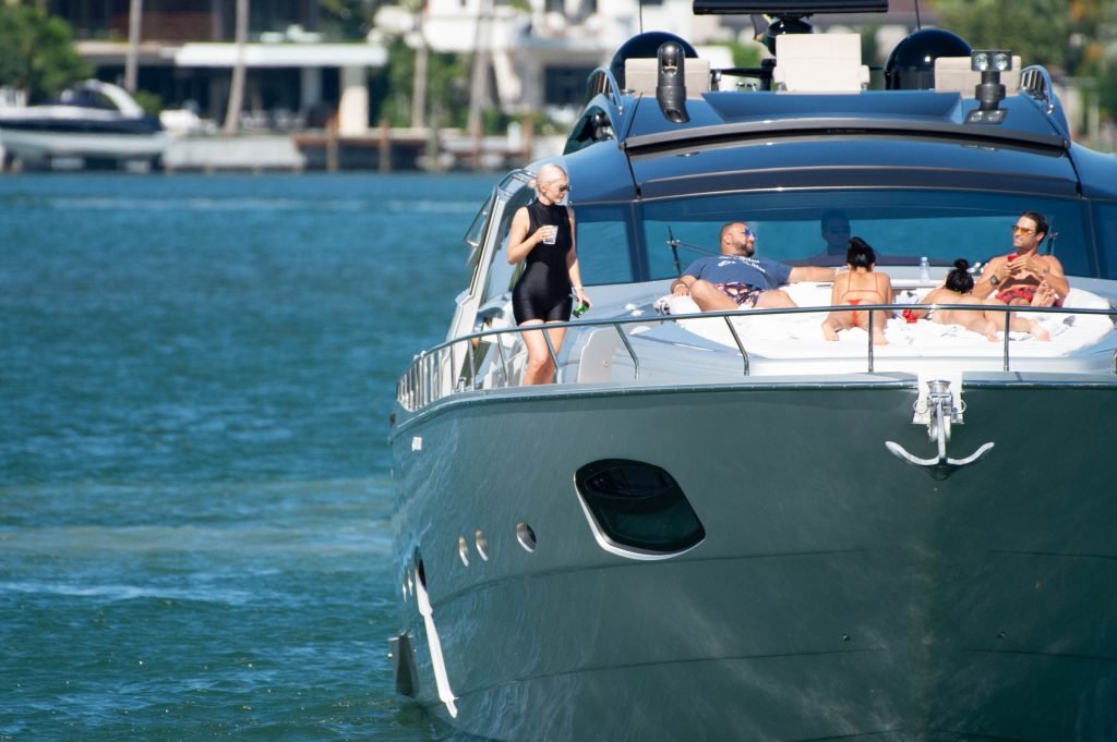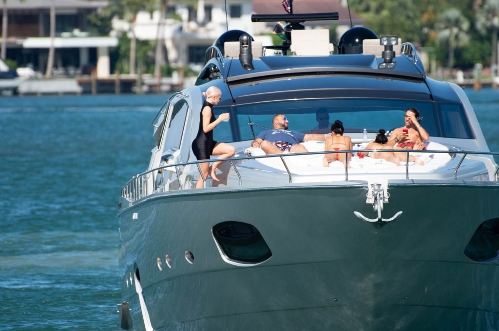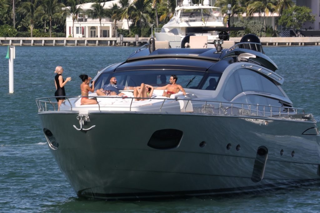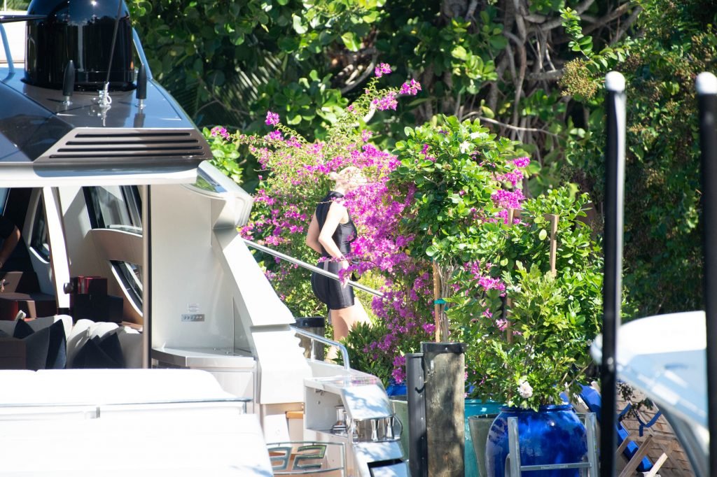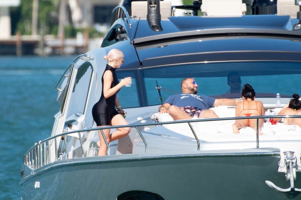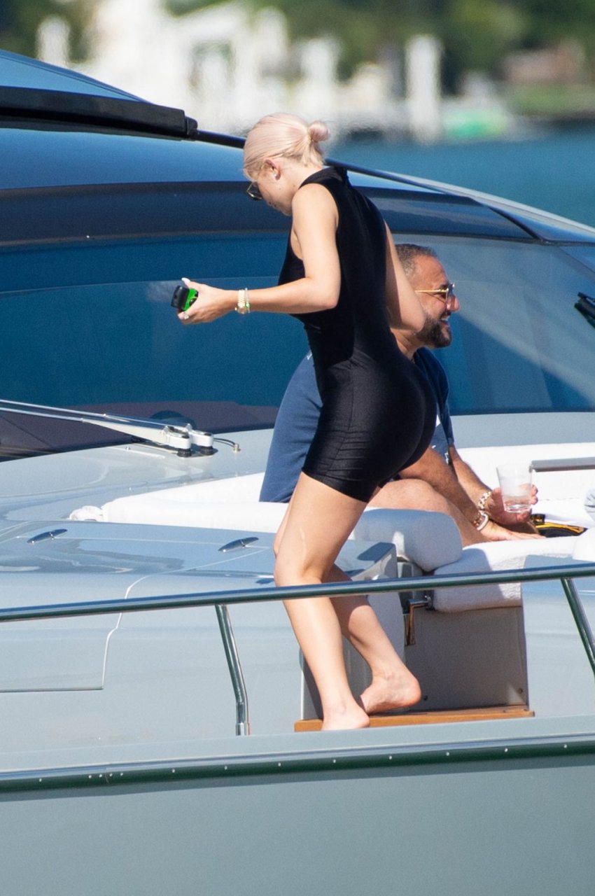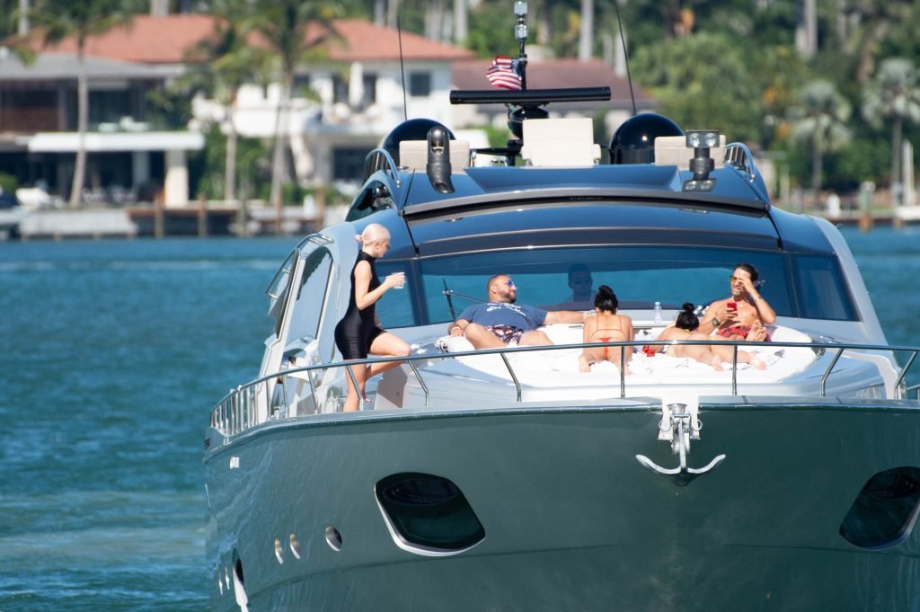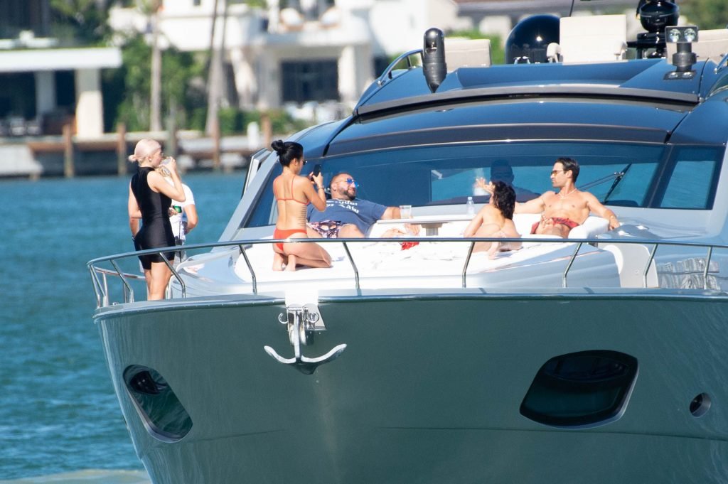 Kylie Jenner (21) садится на борт The Groot со своей дочерью Сторм и лучшей подругой Джордин Вудс в Майами-Бич, 01.10.2018. Кайли видно, как она берет ребенка на борт, а затем наслаждается солнцем и едой с друзьями, демонстрируя свои формы в черном цельном купальнике.