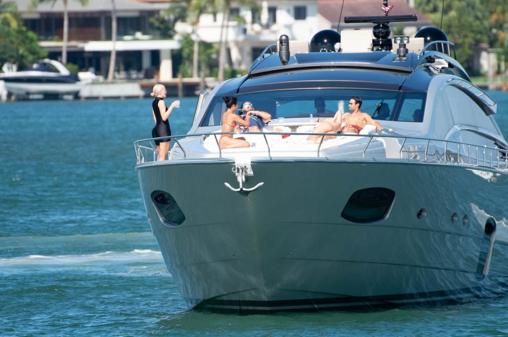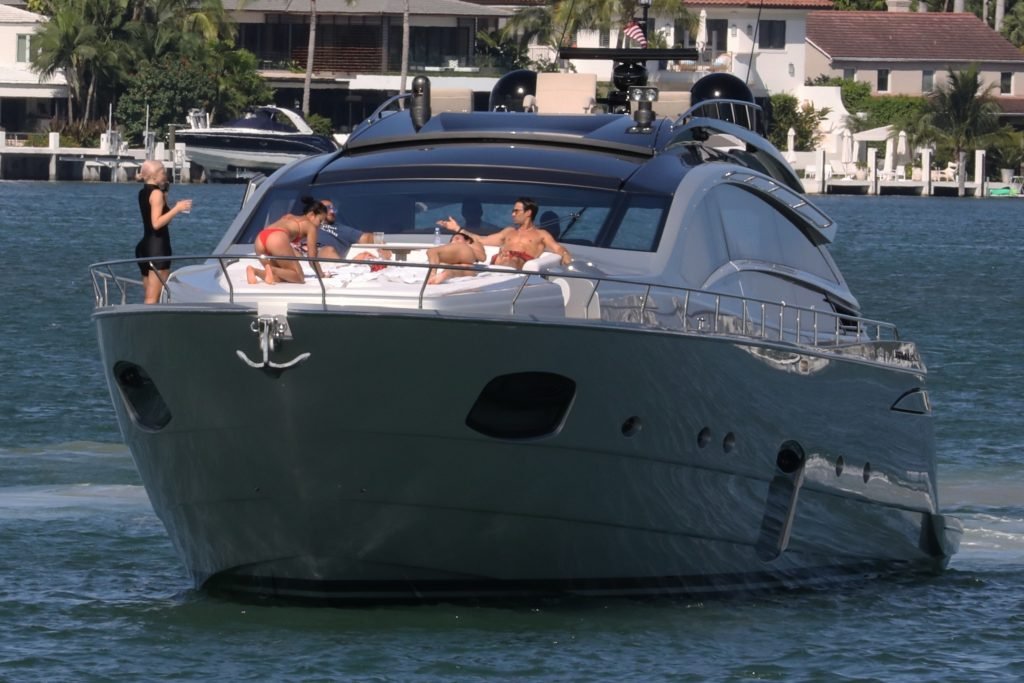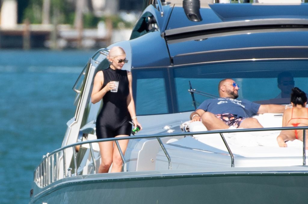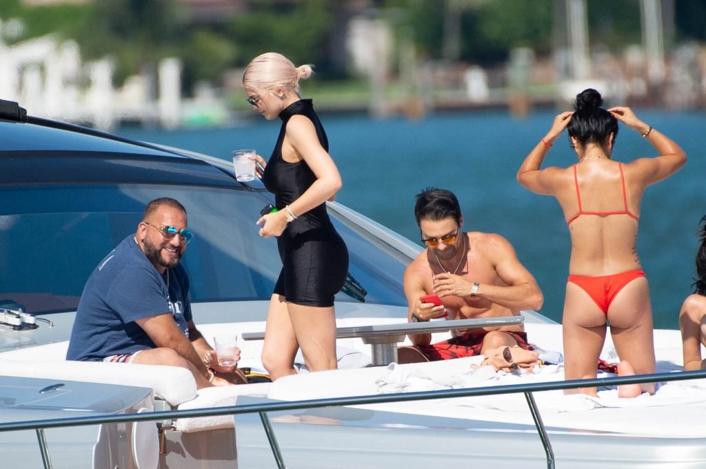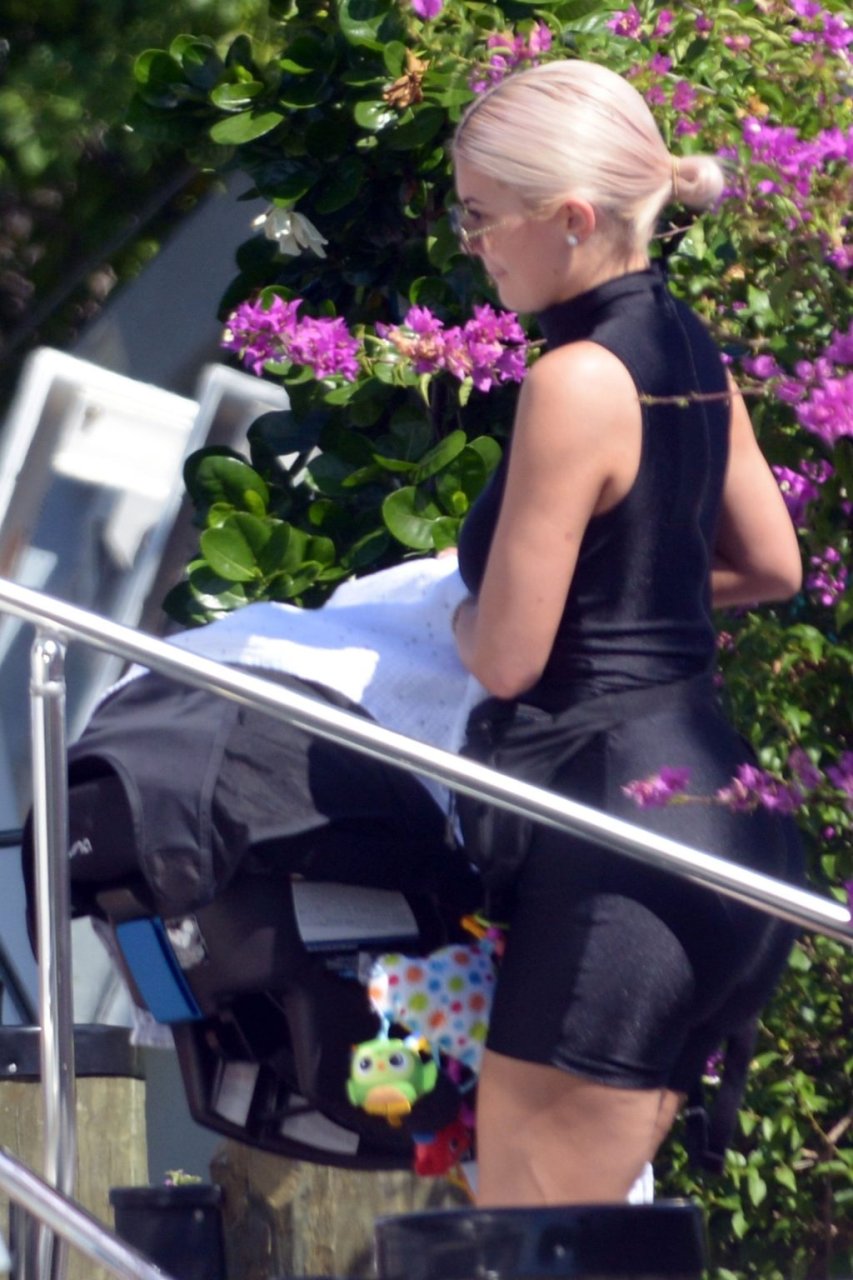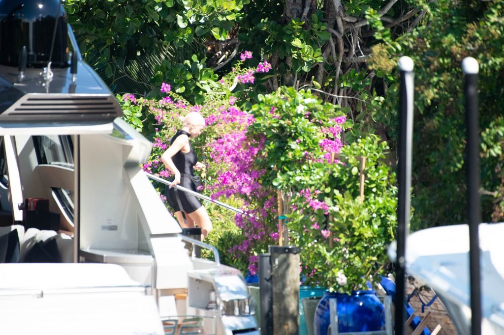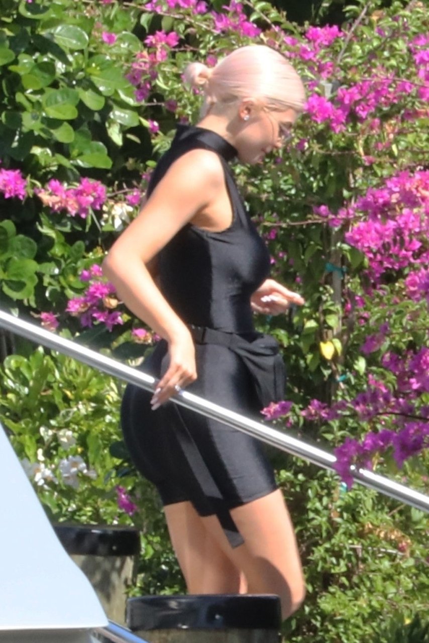 Kylie Jenner (21) садится на борт The Groot со своей дочерью Сторм и лучшей подругой Джордин Вудс в Майами-Бич, 01.10.2018. Кайли видно, как она берет ребенка на борт, а затем наслаждается солнцем и едой с друзьями, демонстрируя свои формы в черном цельном купальнике.