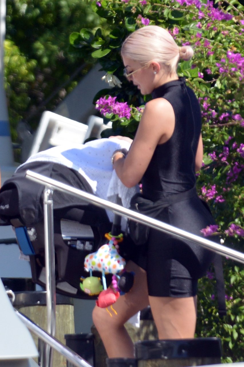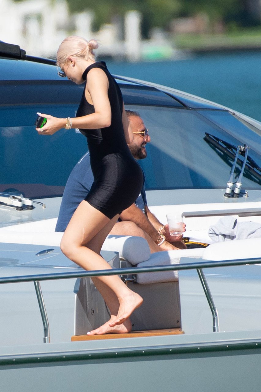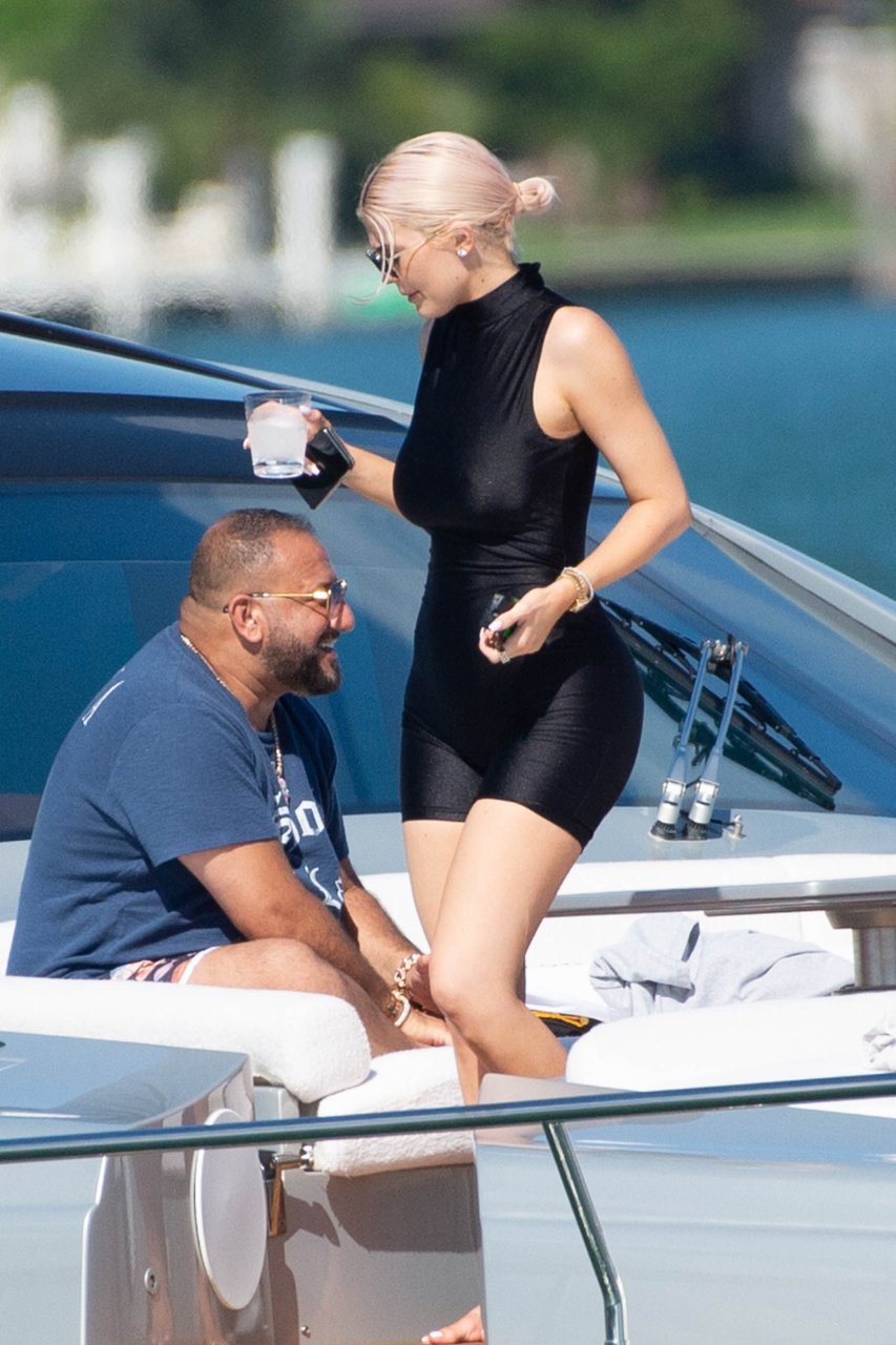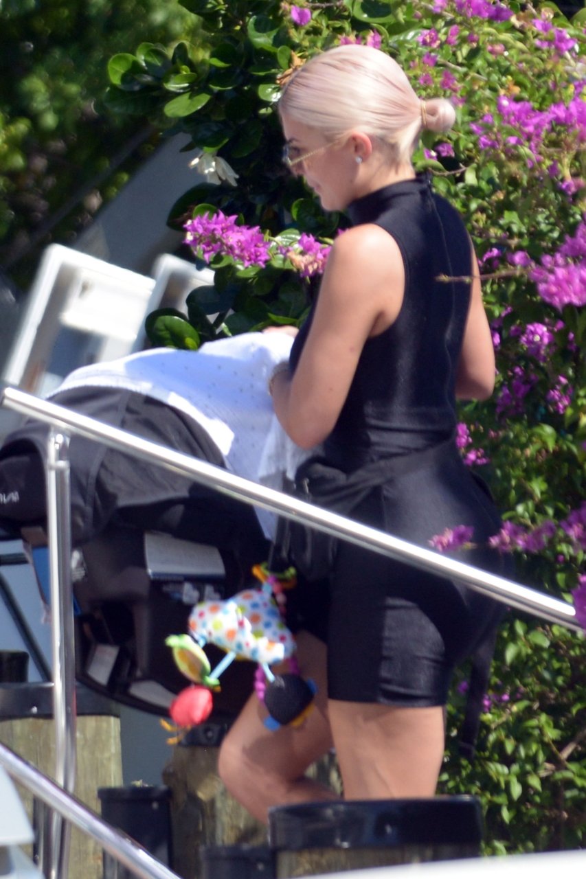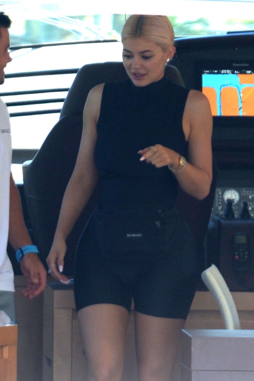 Kylie Jenner (21) садится на борт The Groot со своей дочерью Сторм и лучшей подругой Джордин Вудс в Майами-Бич, 01.10.2018. Кайли видно, как она берет ребенка на борт, а затем наслаждается солнцем и едой с друзьями, демонстрируя свои формы в черном цельном купальнике.