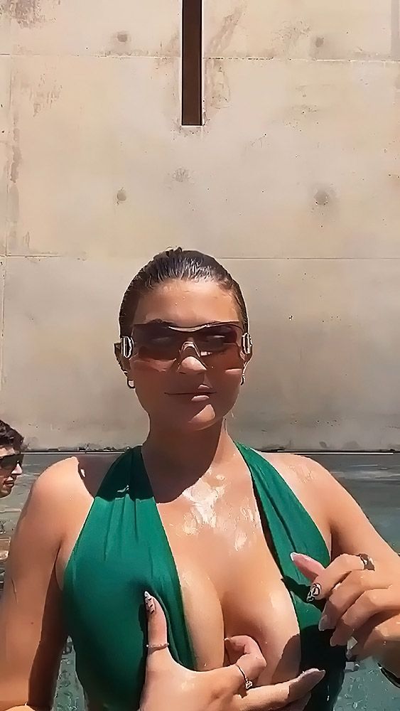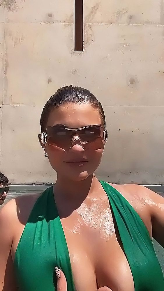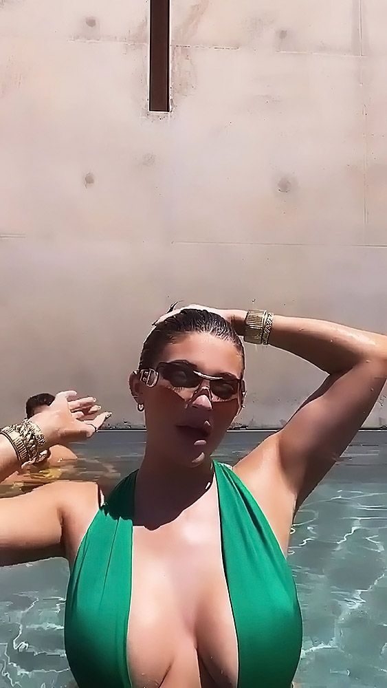 And now, folks, the newest Kylie Jenner bikini photos! She is seen posing in a skimpy bikini in a pool! She emerges out of the water as wet drops drip from her curves! Her slutty face is getting me hard!