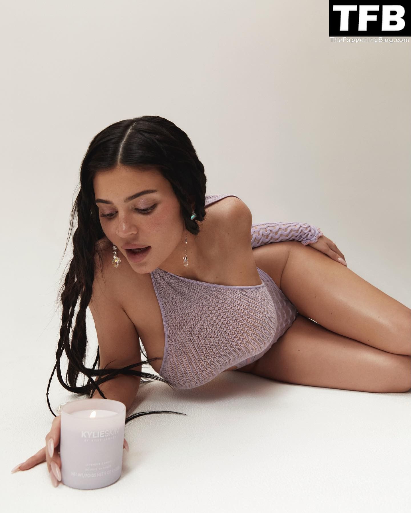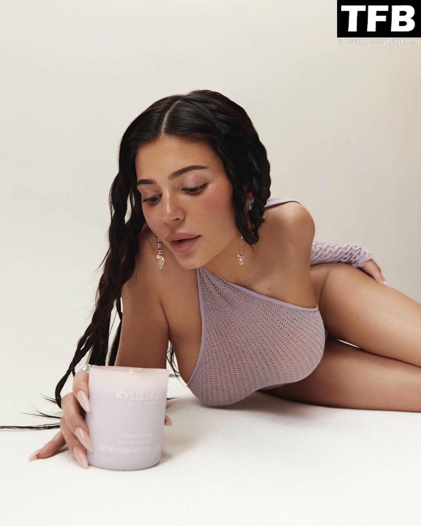 Модель Кайли Дженнер демонстрирует пышные формы в откровенном боди, продвигая свою новую лавандовую коллекцию Kylie Skin (май 2022).