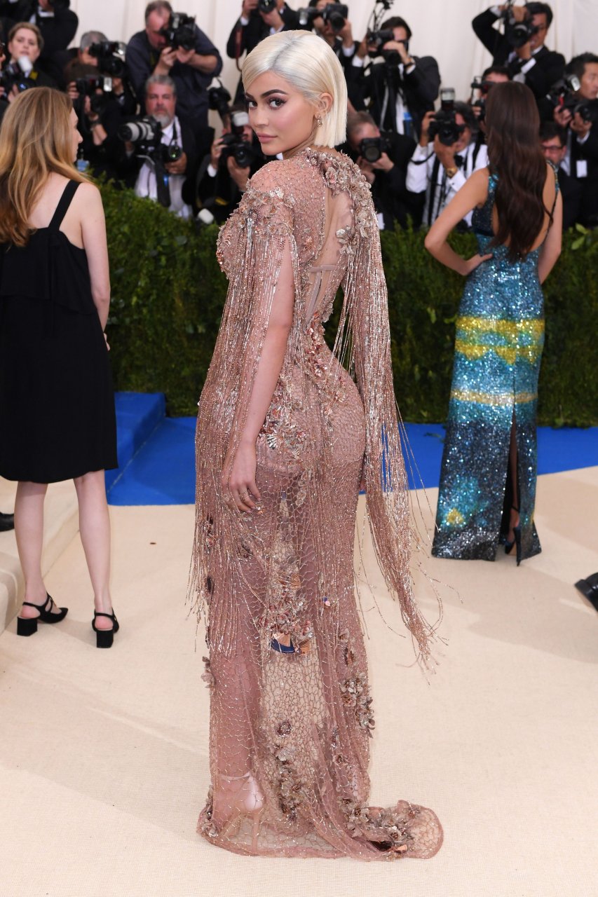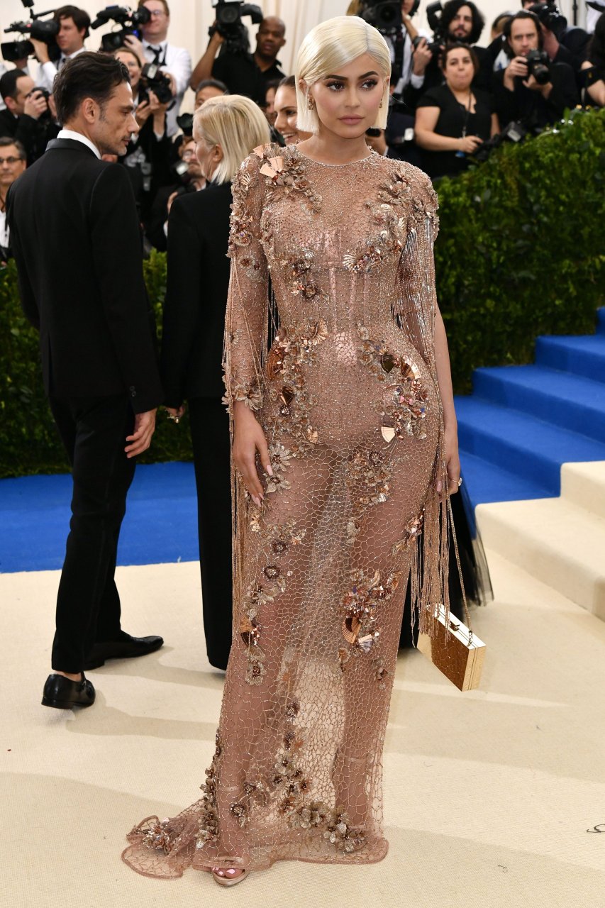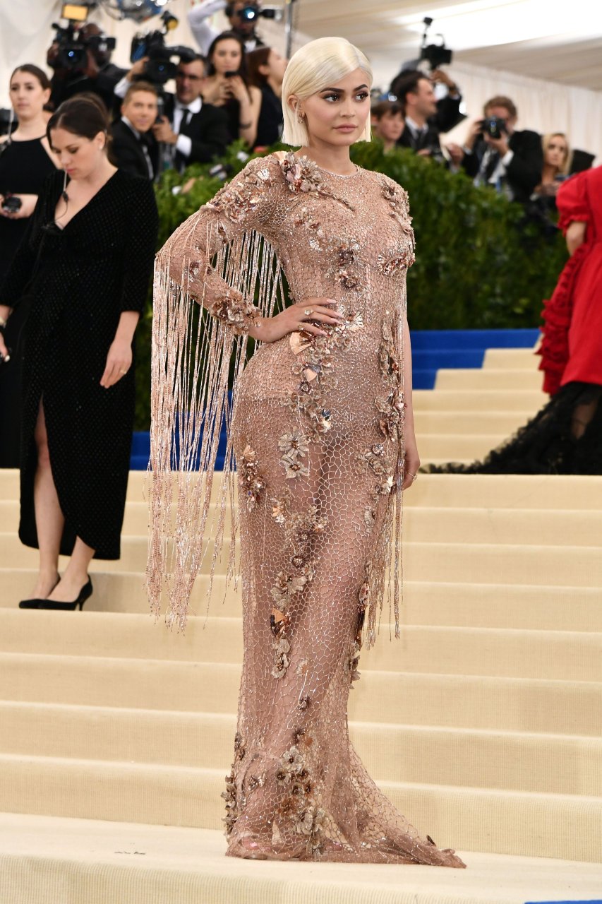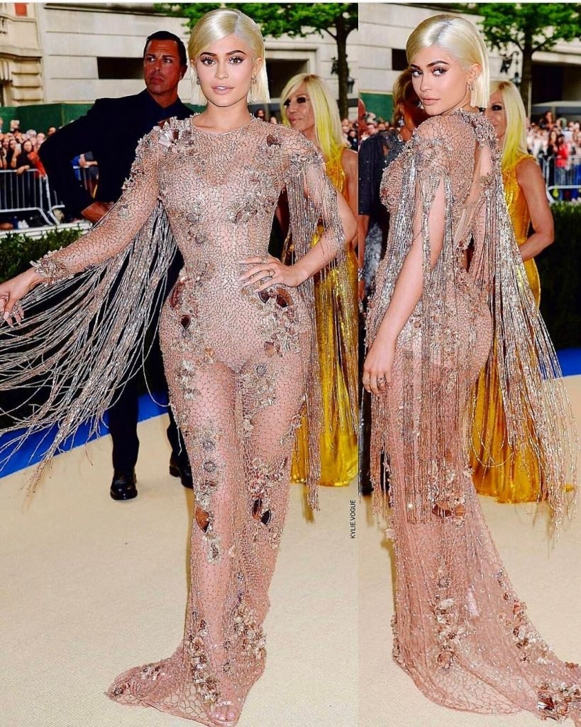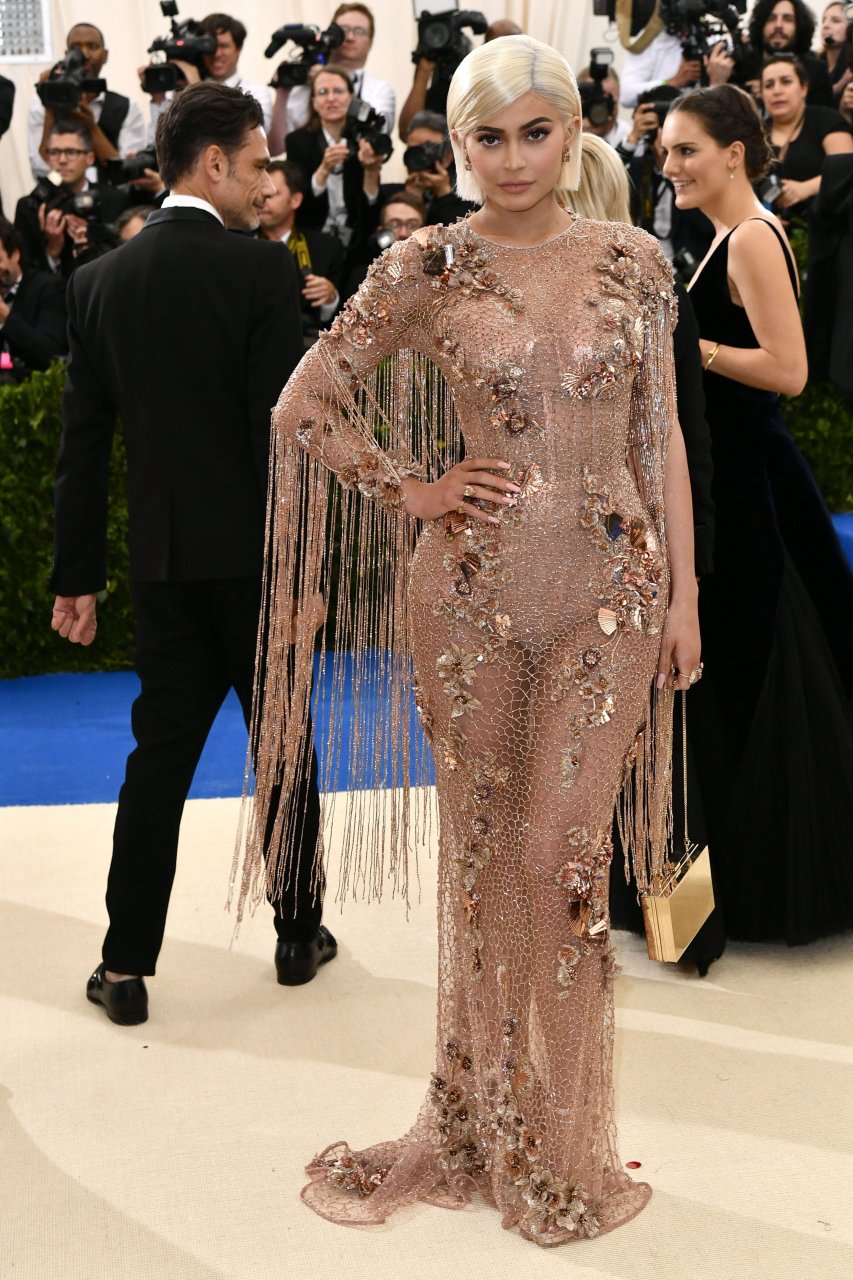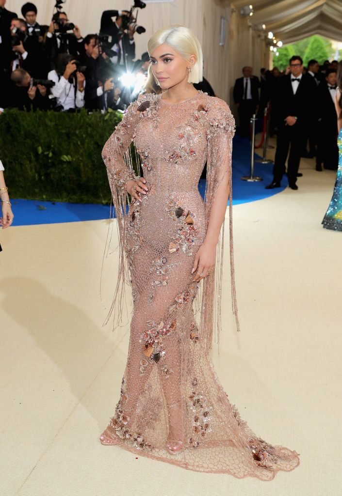 Кайли Дженнер в прозрачном нюдовом платье Versace на Met Gala 2017 в Нью-Йорке, 01.05.2017. Кайли Дженнер — американская актриса, дизайнер, модель, телезвезда, светская львица. Возраст – 19.