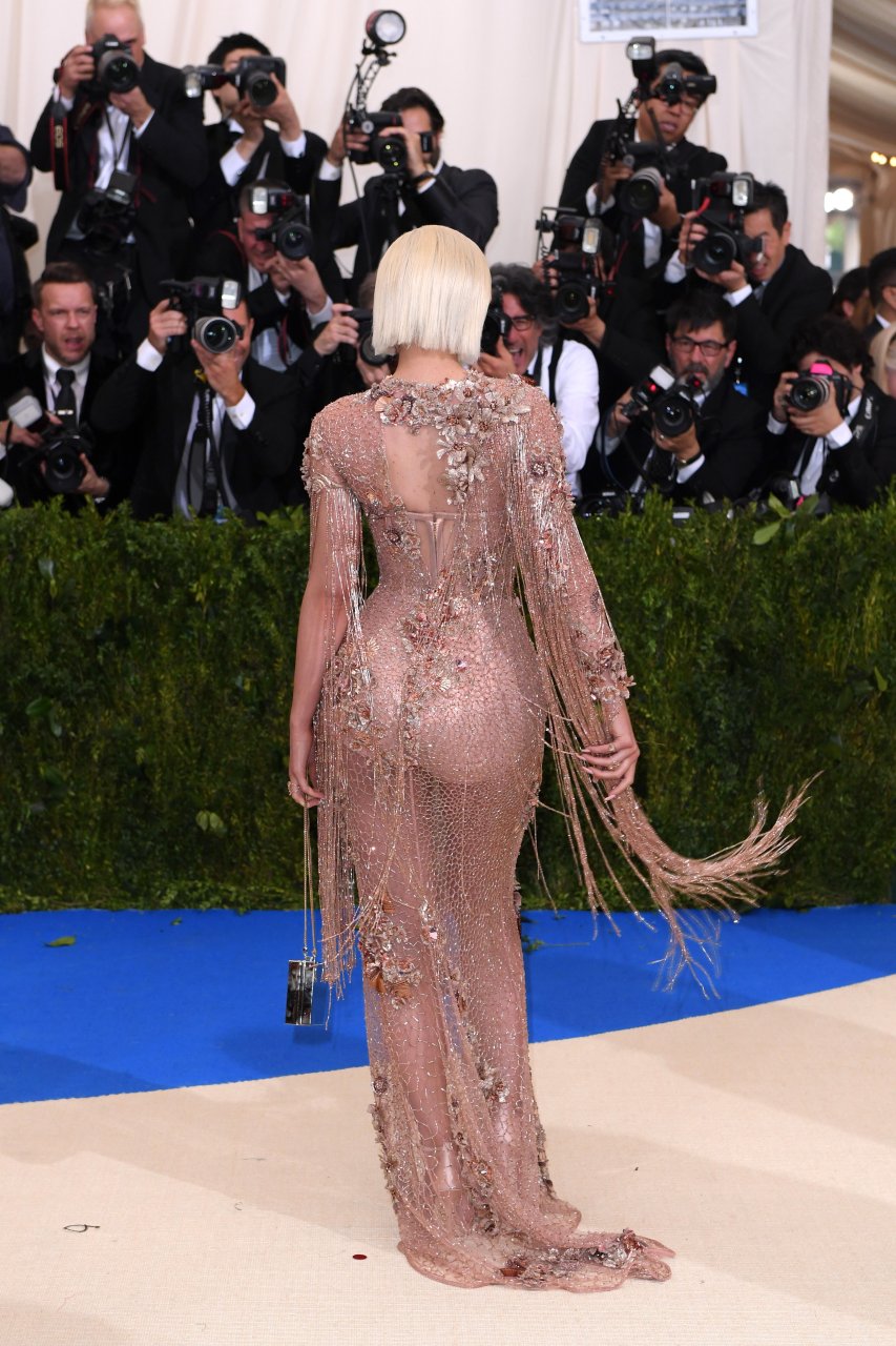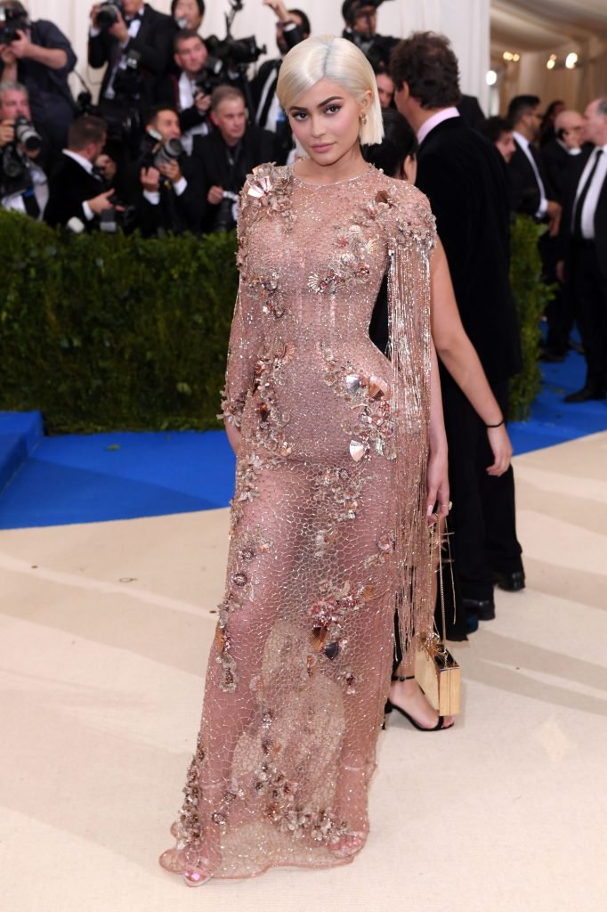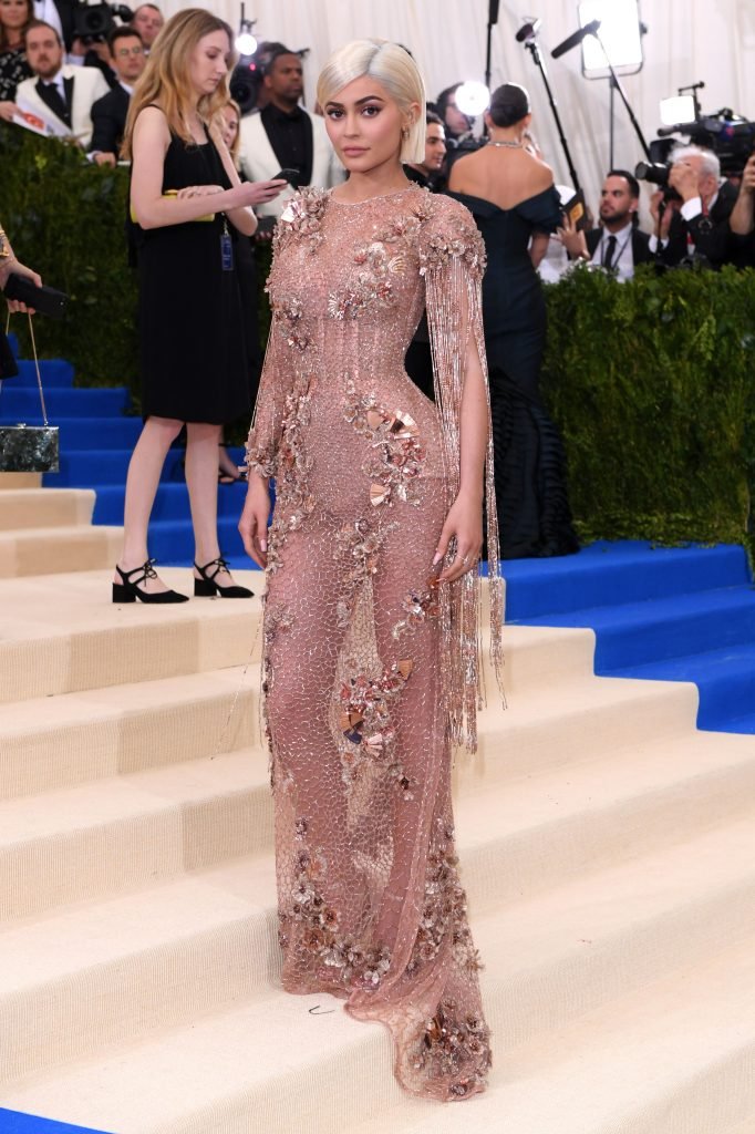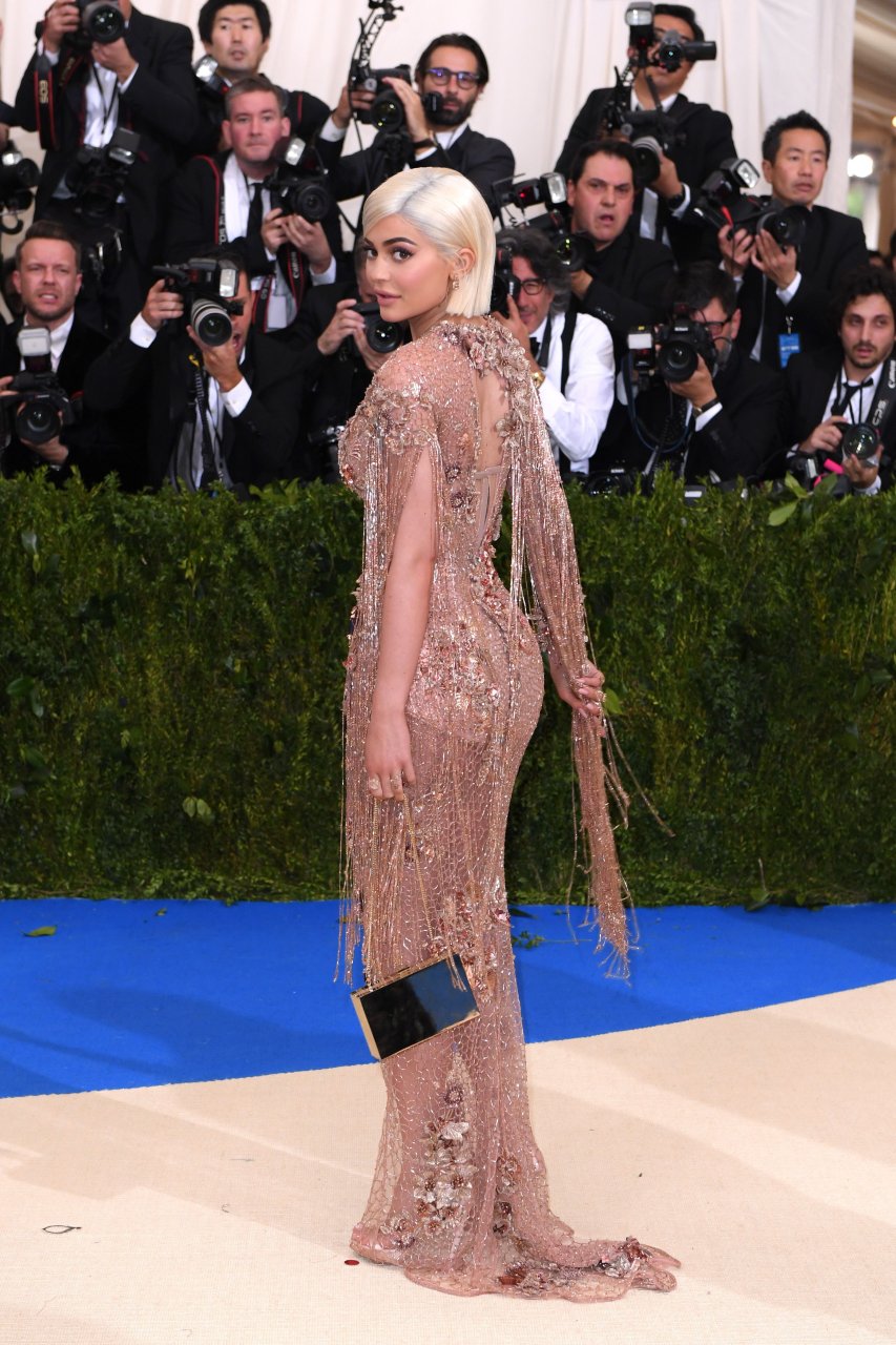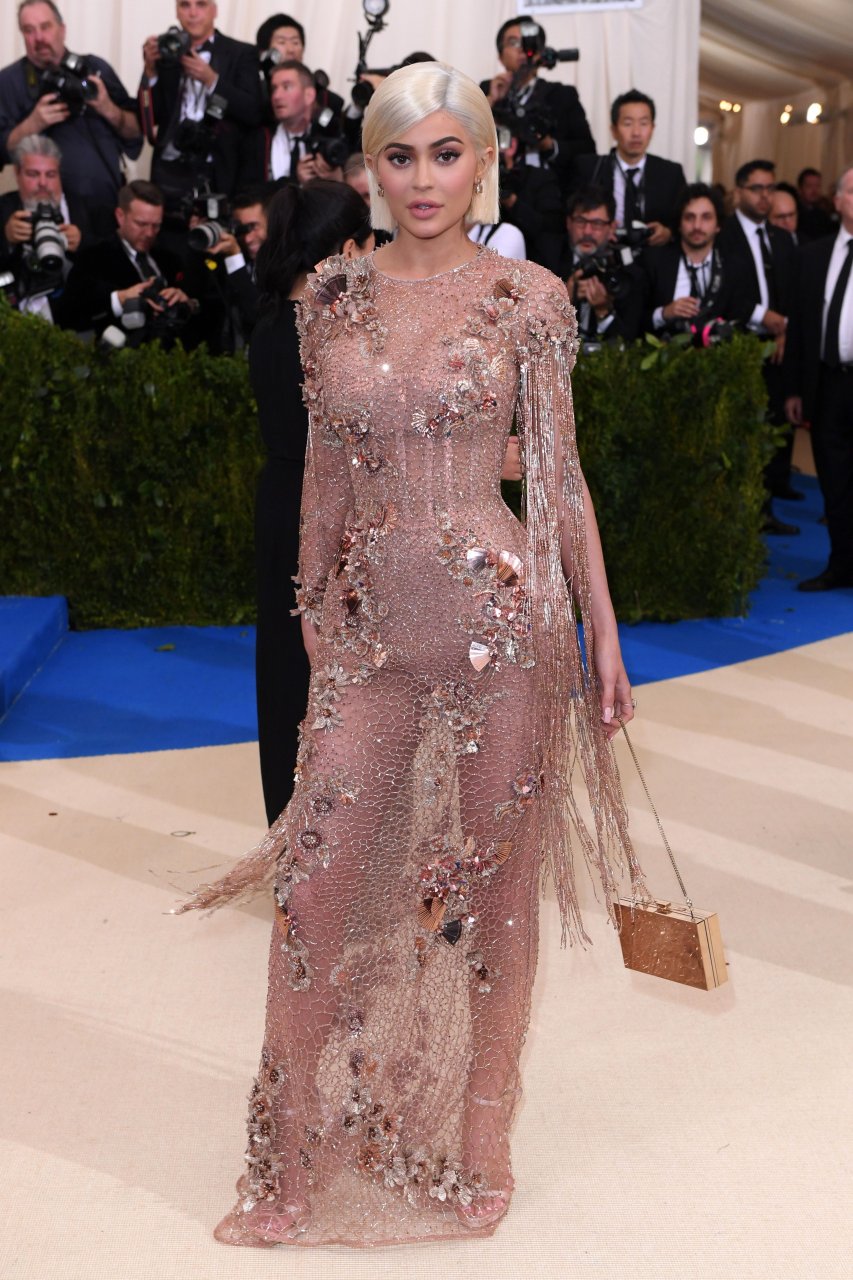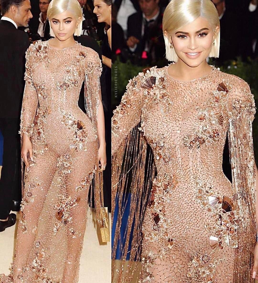 Кайли Дженнер в прозрачном нюдовом платье Versace на Met Gala 2017 в Нью-Йорке, 01.05.2017. Кайли Дженнер — американская актриса, дизайнер, модель, телезвезда, светская львица. Возраст – 19.