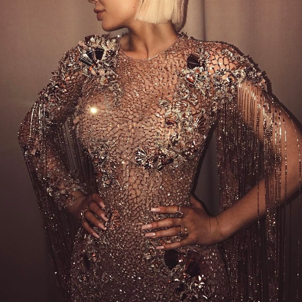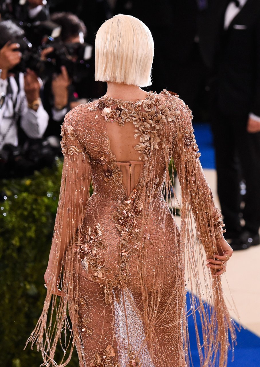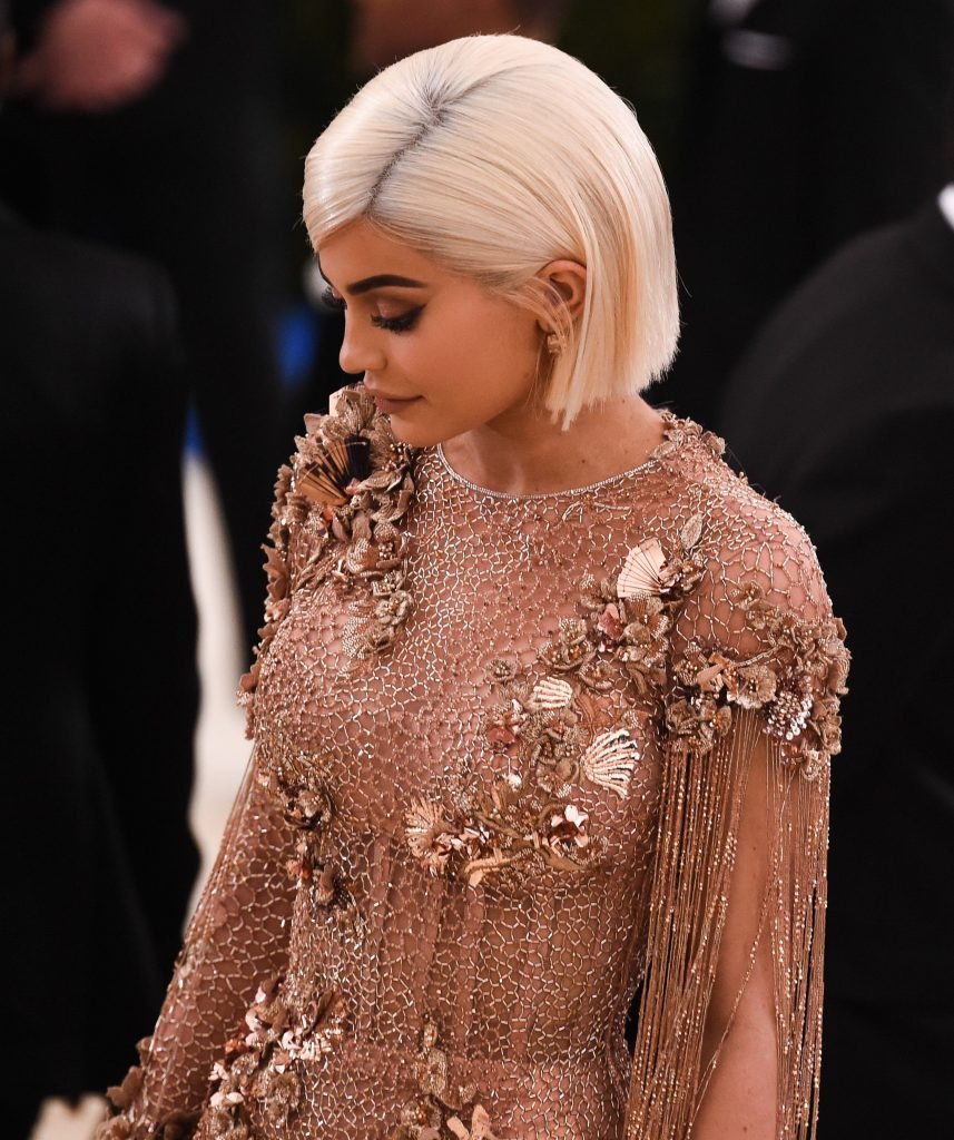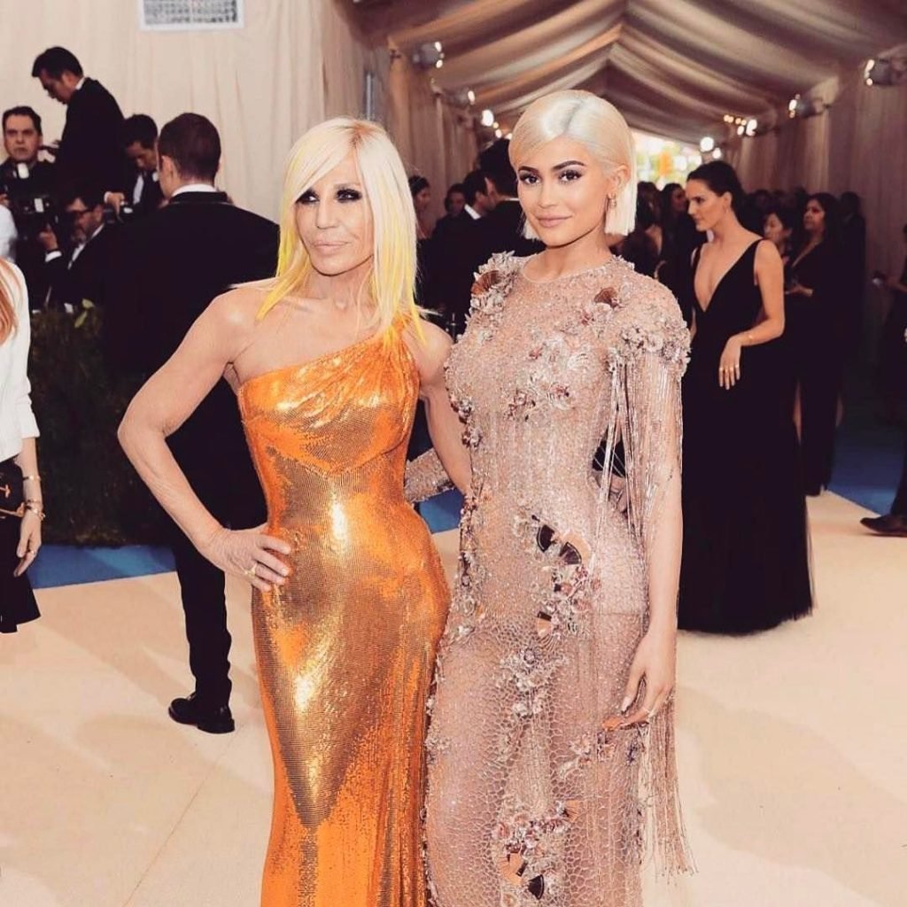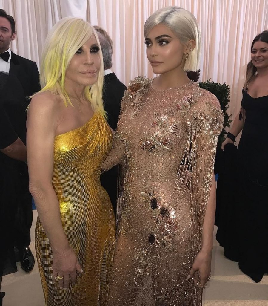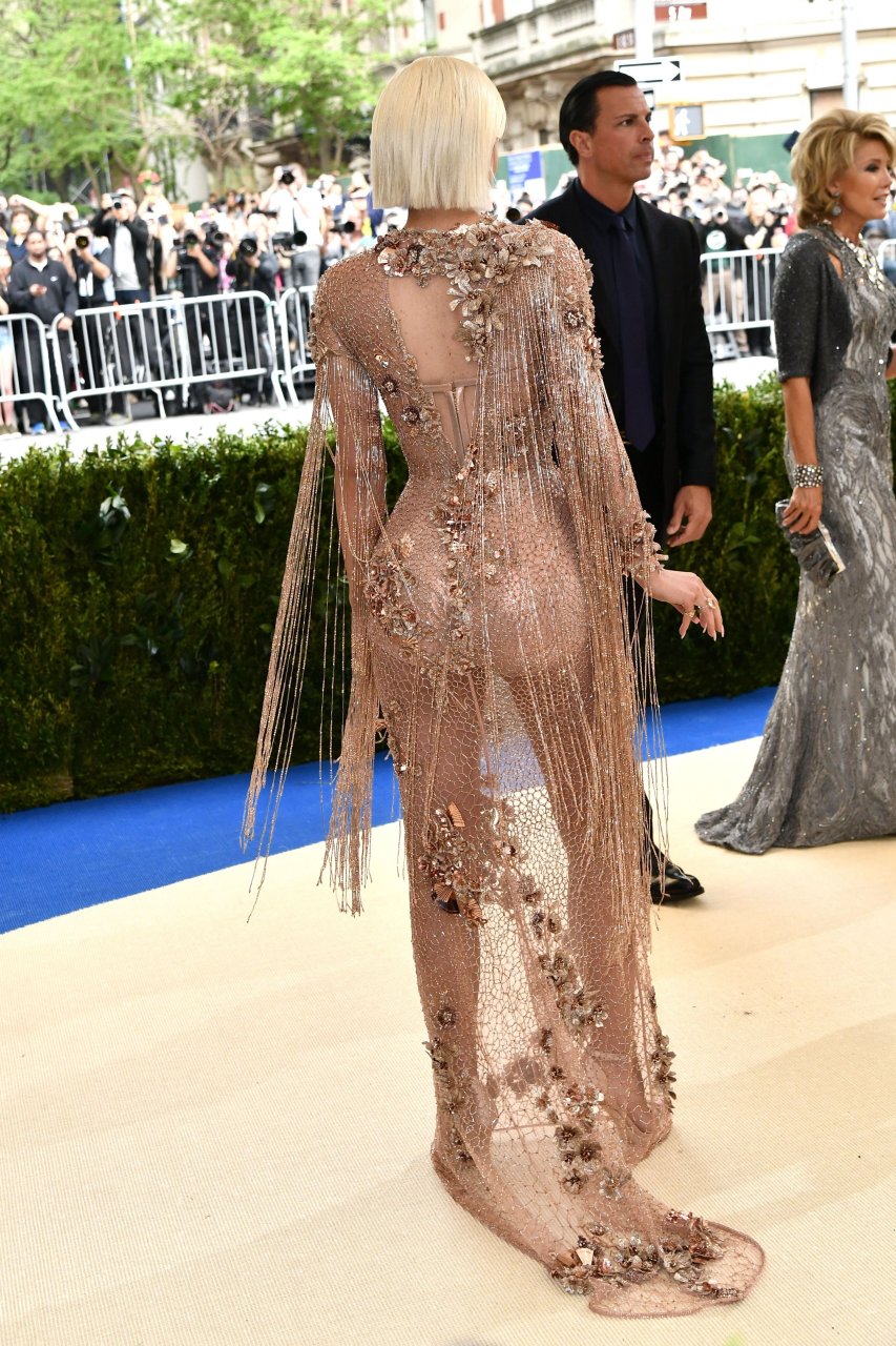 Кайли Дженнер в прозрачном нюдовом платье Versace на Met Gala 2017 в Нью-Йорке, 01.05.2017. Кайли Дженнер — американская актриса, дизайнер, модель, телезвезда, светская львица. Возраст – 19.