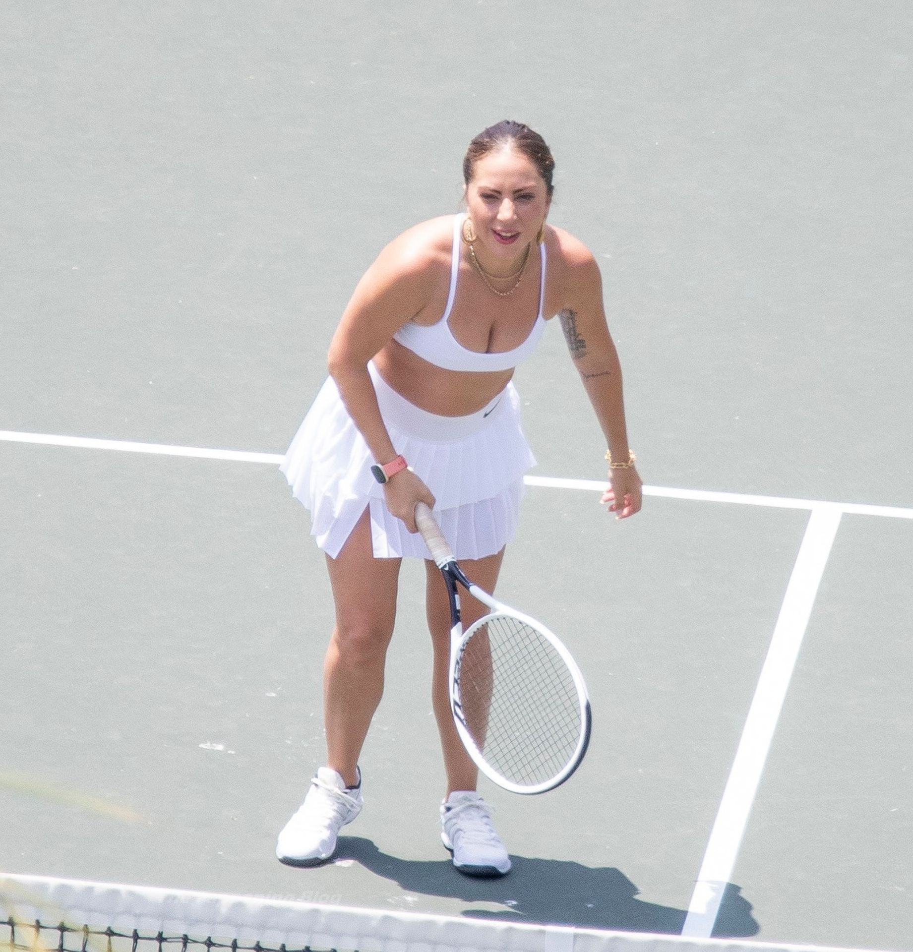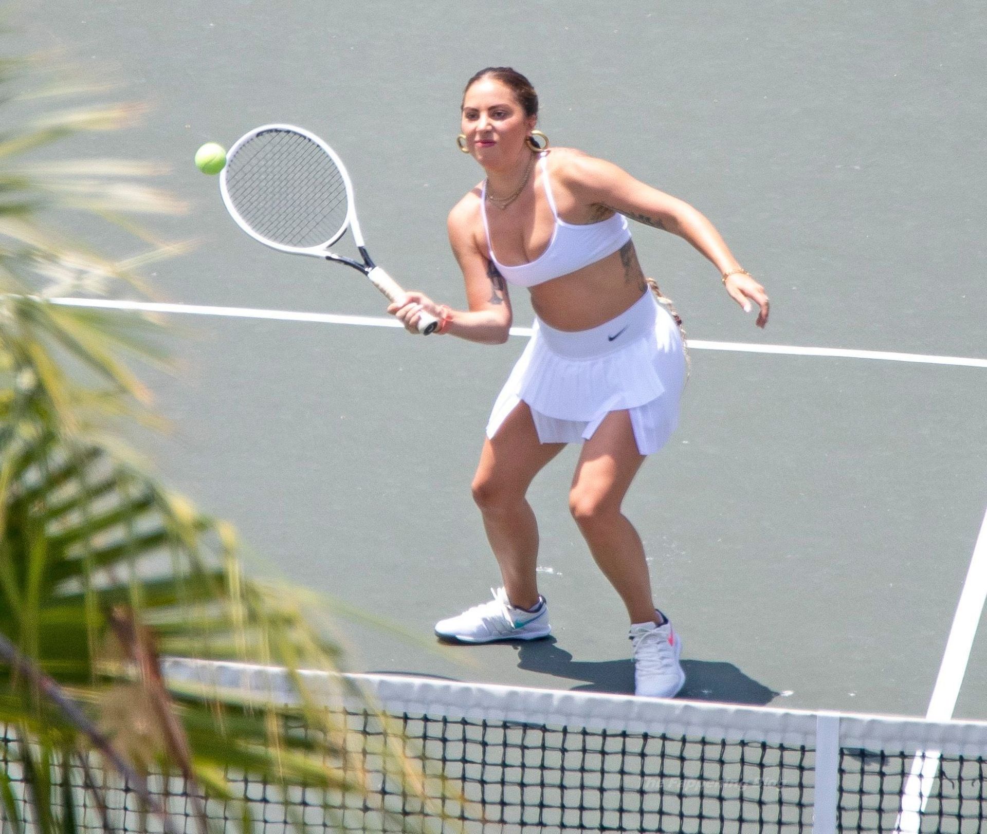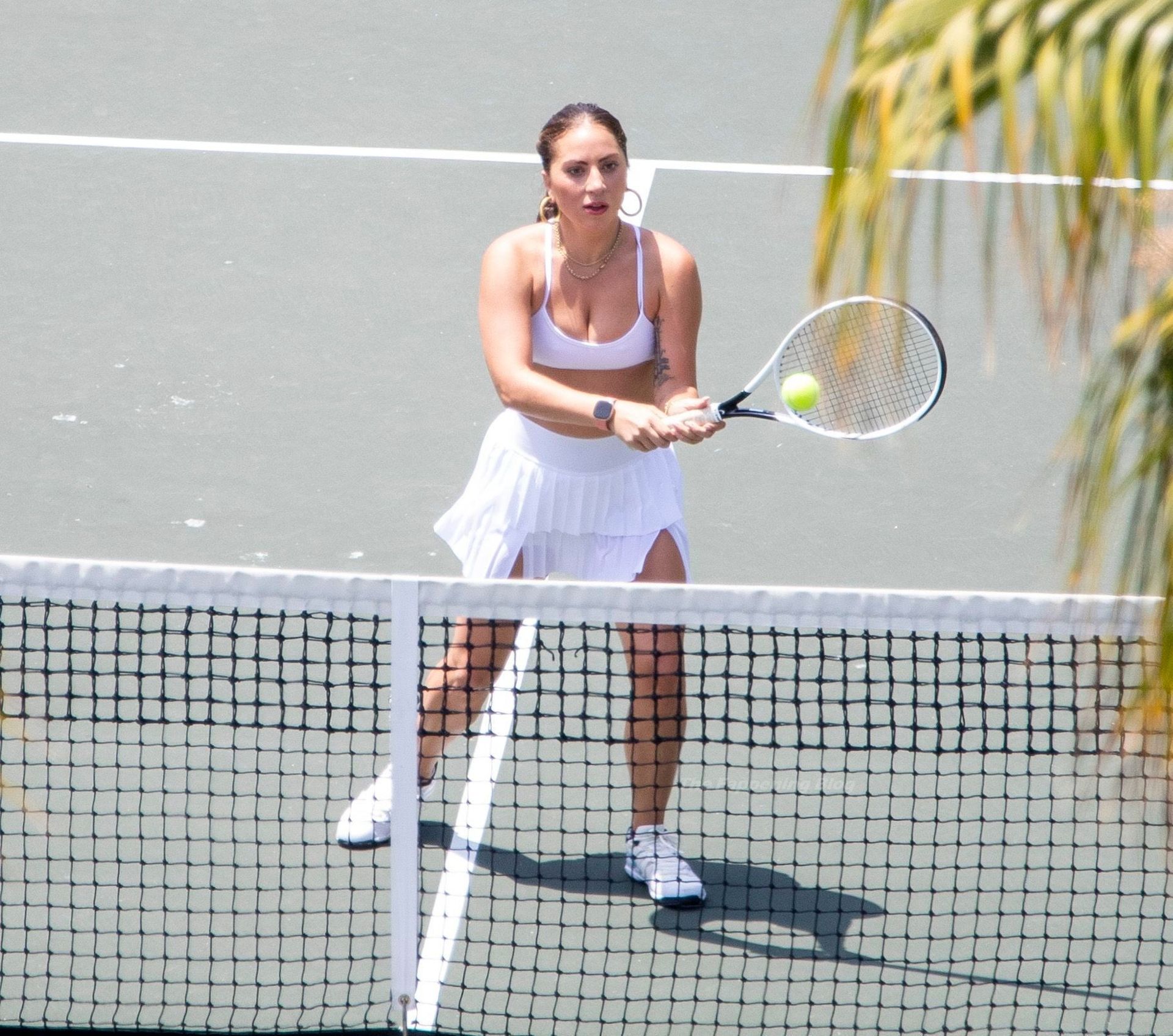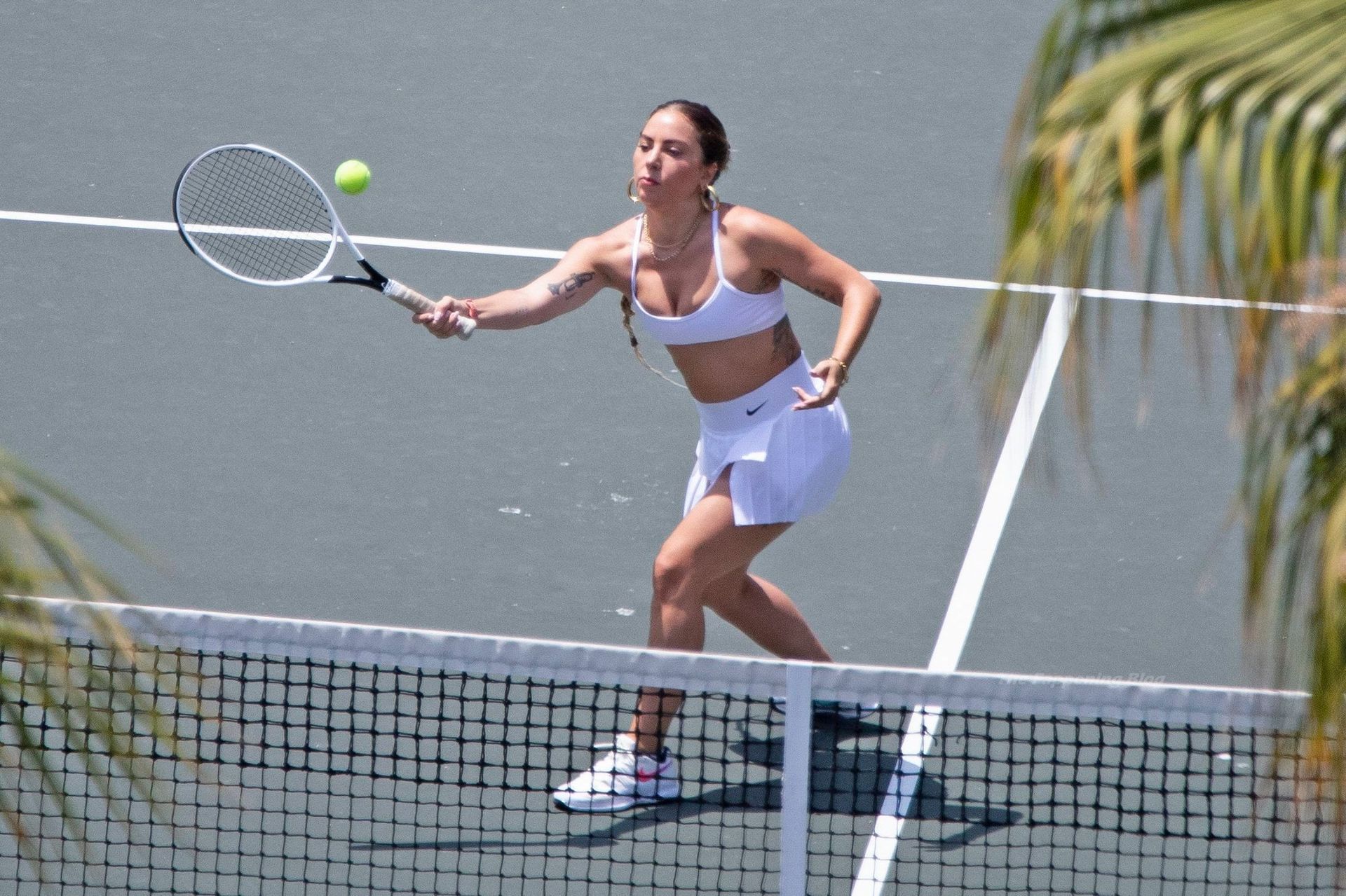 Певица Леди Гага демонстрирует спортивные навыки во время уроков тенниса во время уикенда с её женихом Майклом Полански, 25.07.2021.