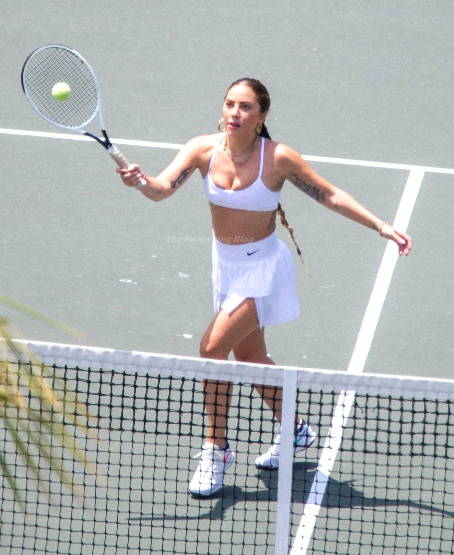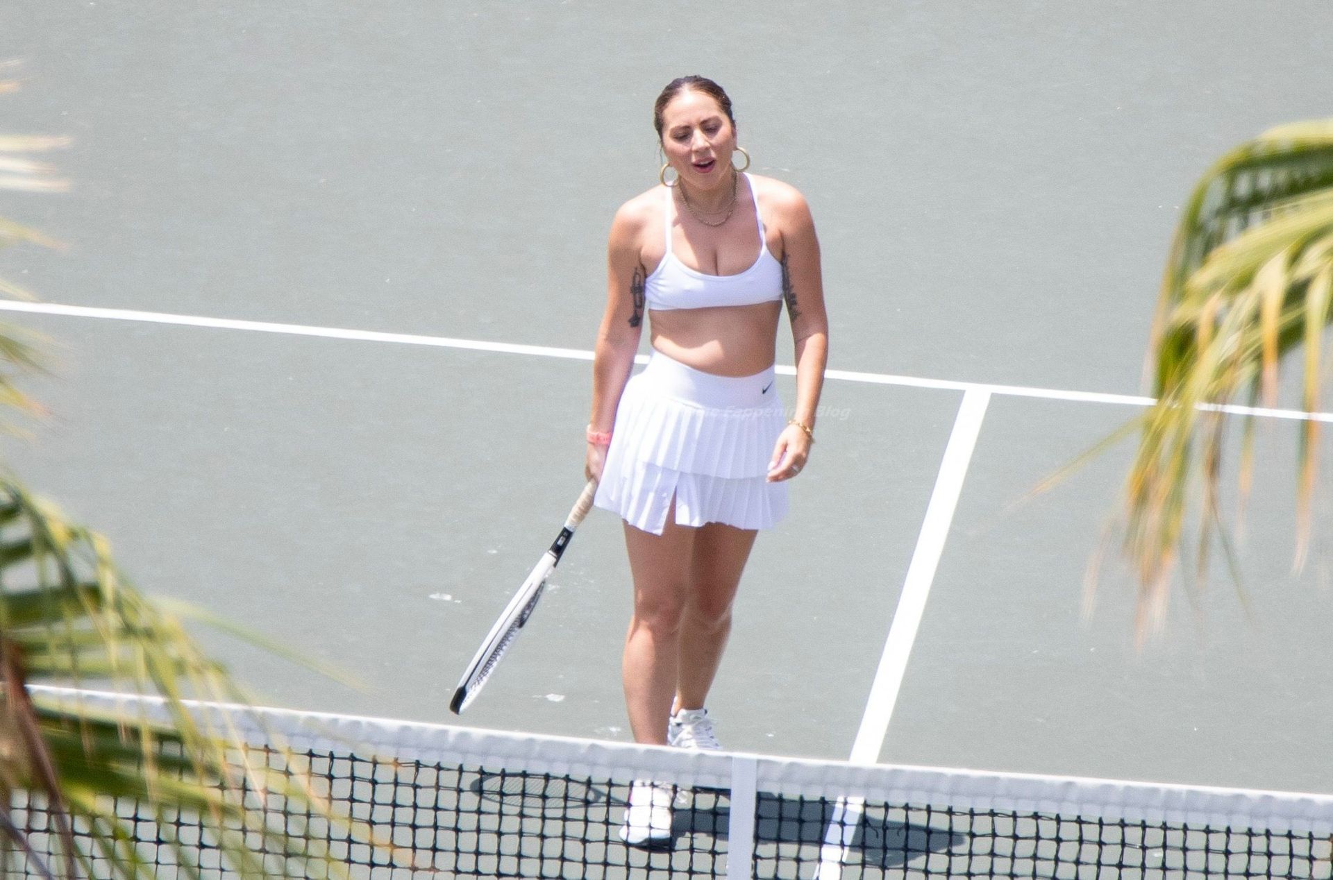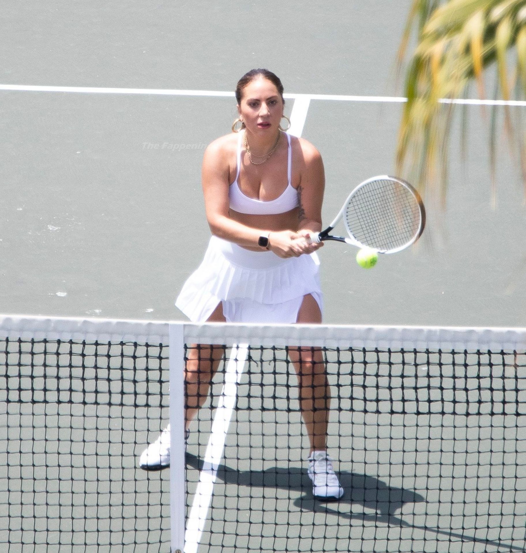 Певица Леди Гага демонстрирует спортивные навыки во время уроков тенниса во время уикенда с её женихом Майклом Полански, 25.07.2021.