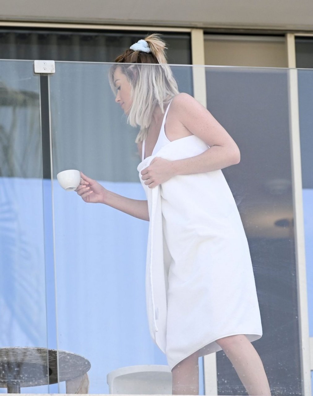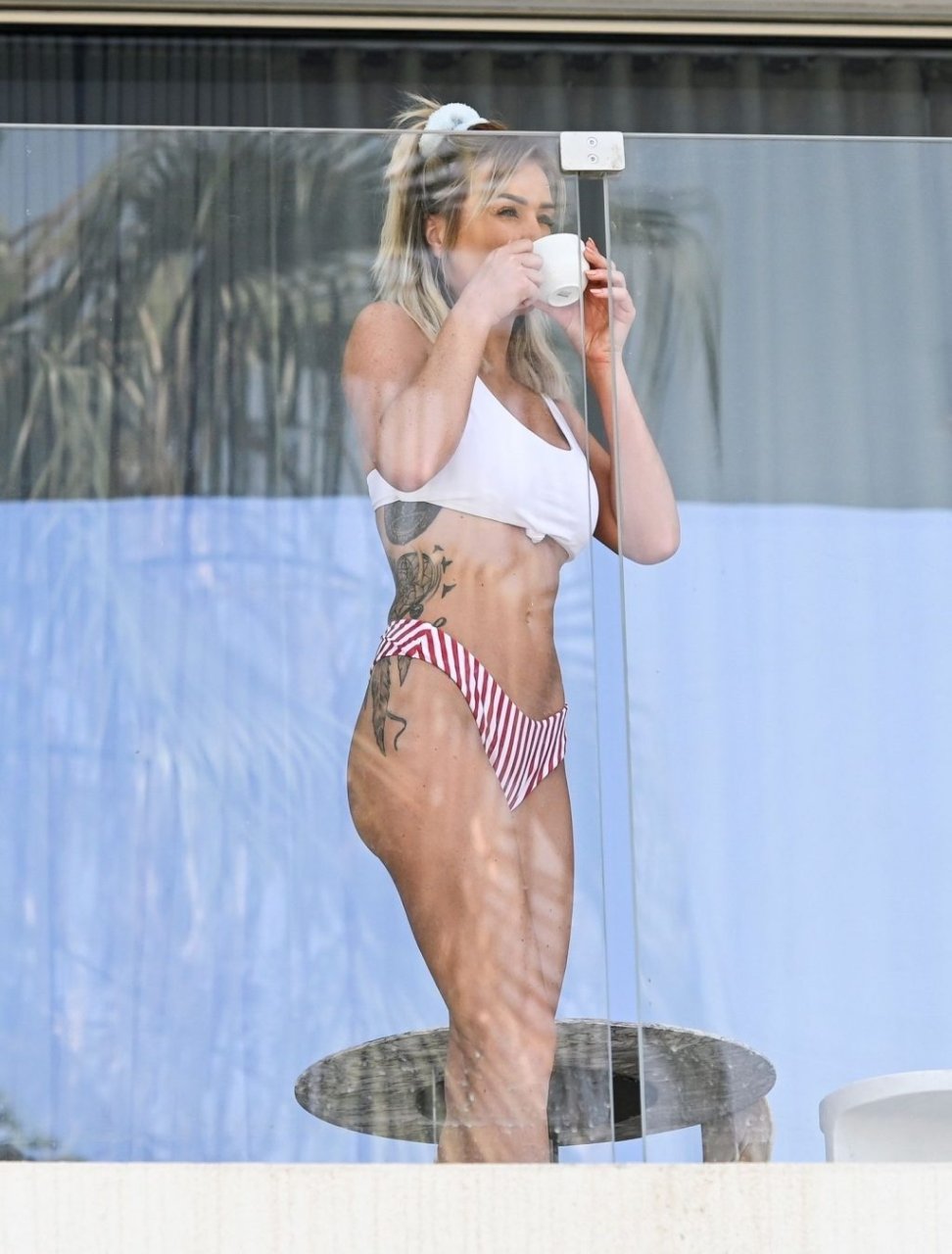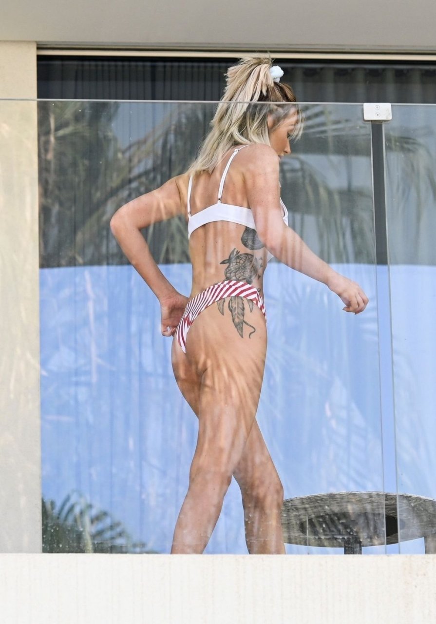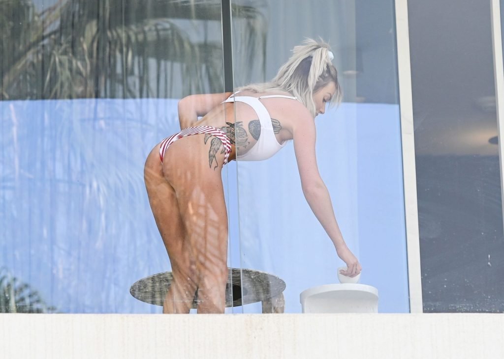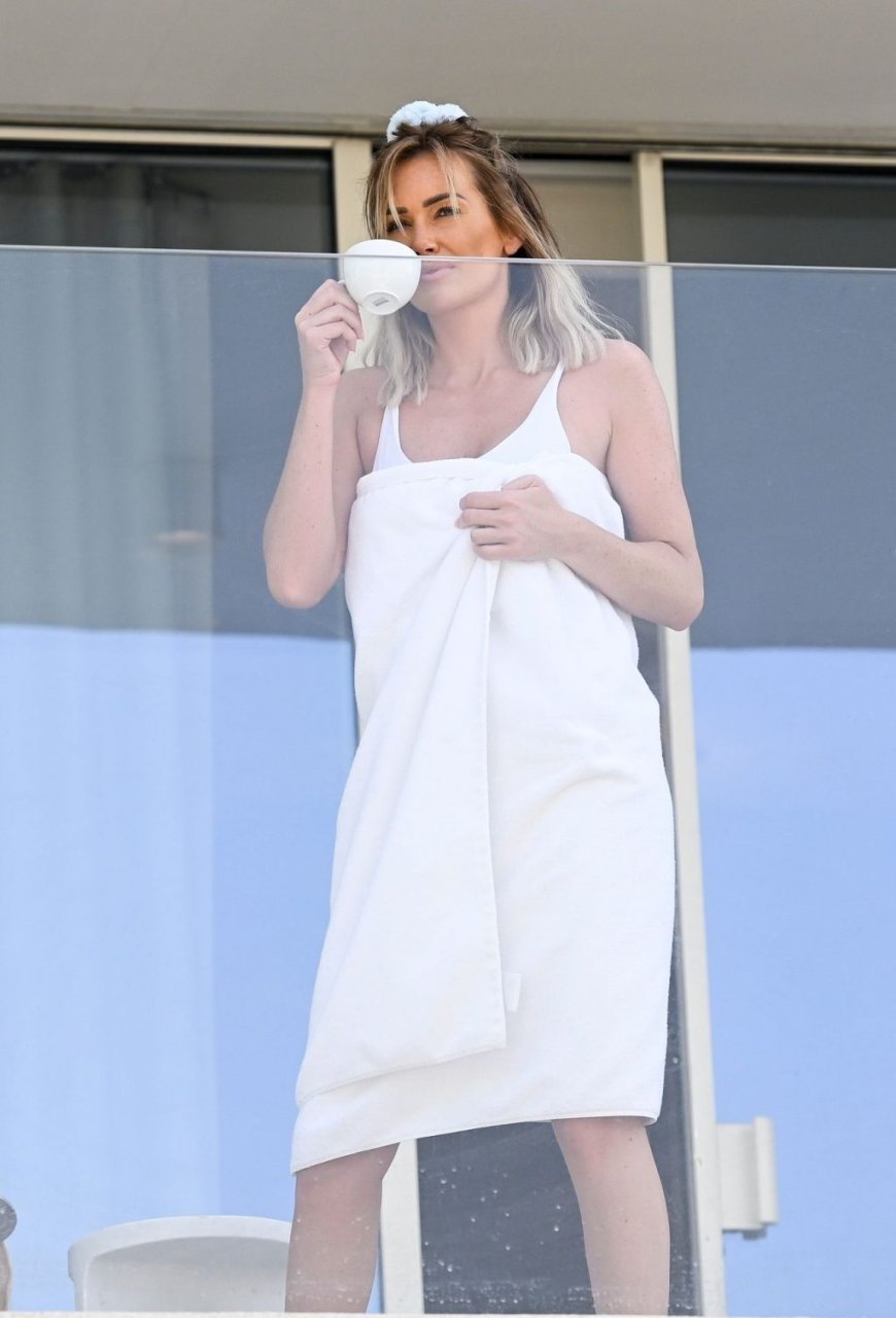 Бывшая участница шоу “Love Island”, шотландская красавица Лаура Андерсон наслаждается солнцем в Эмиратах, потягивая чай на балконе в сексуальном бикини и с белым полотенцем во время отпуска в Дубае, 07/02/2019.