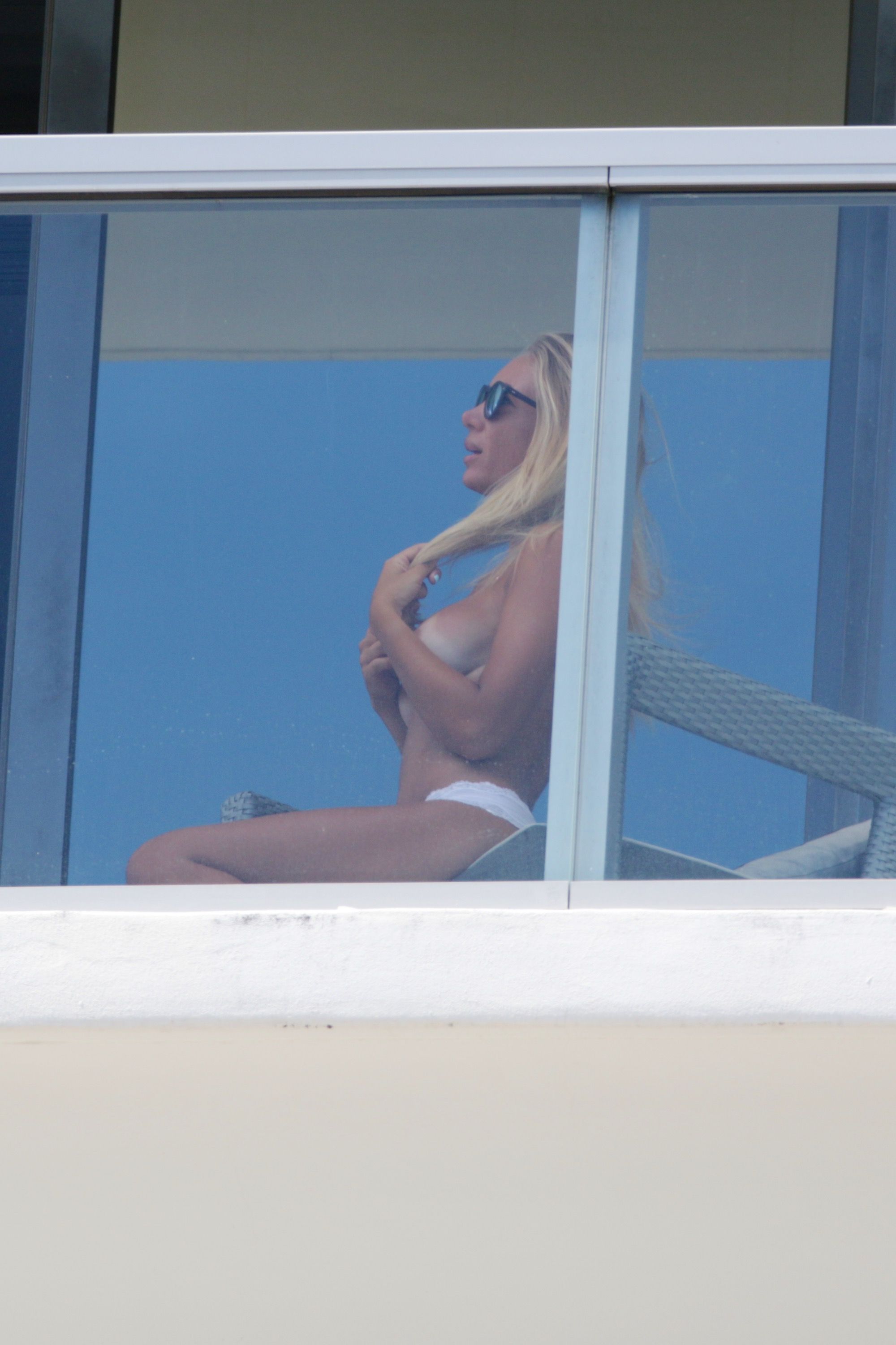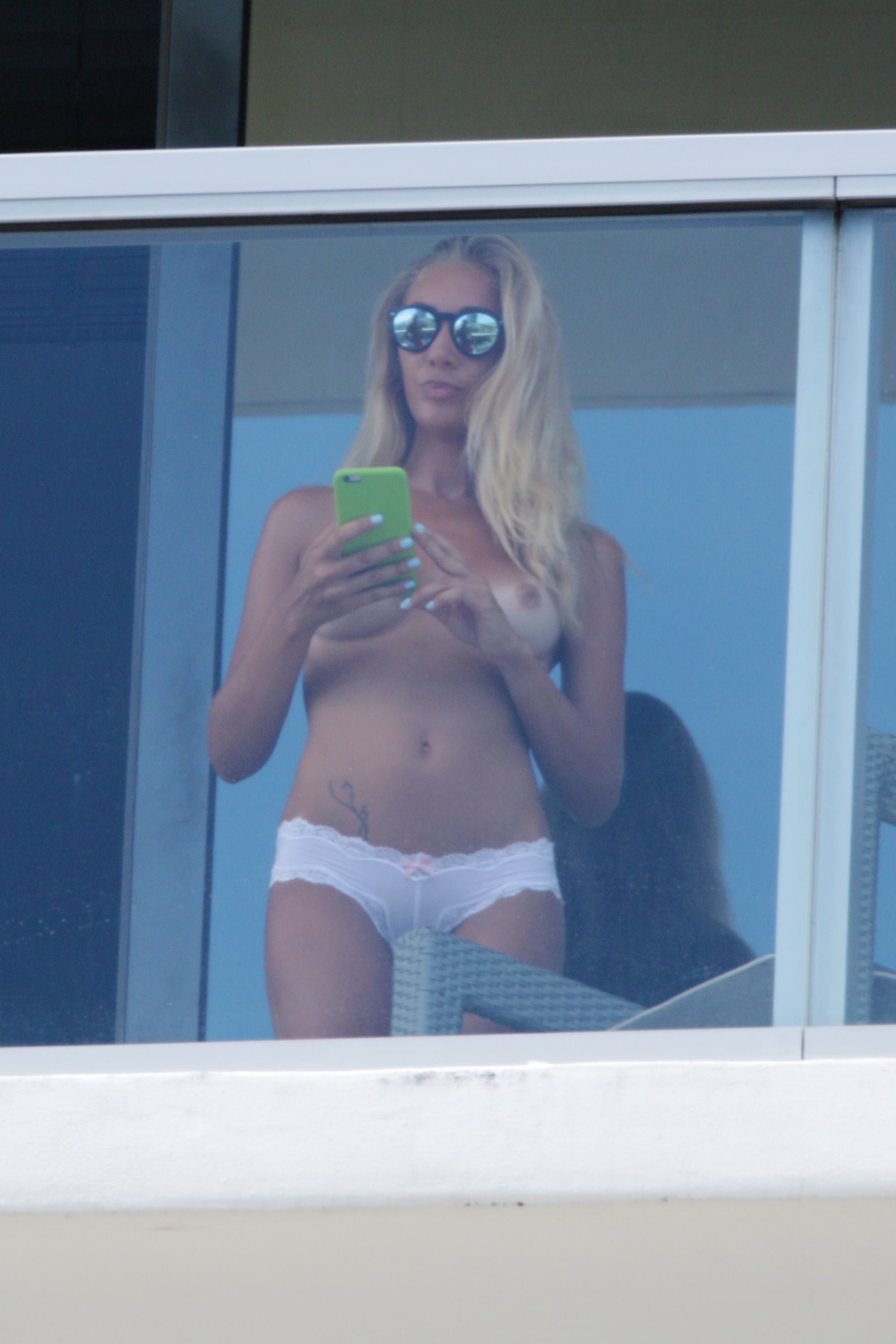 Новые папарацци фото Лауры Кремаски топлес на балконе её отеля в Майами-Бич 18.08.15. Поймана! Лаура Кремаски — итальянская модель.