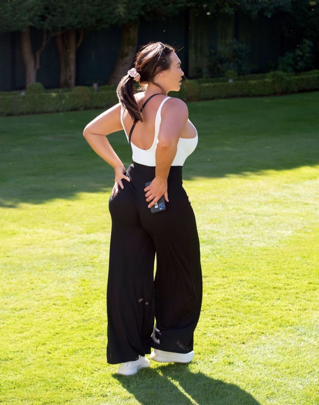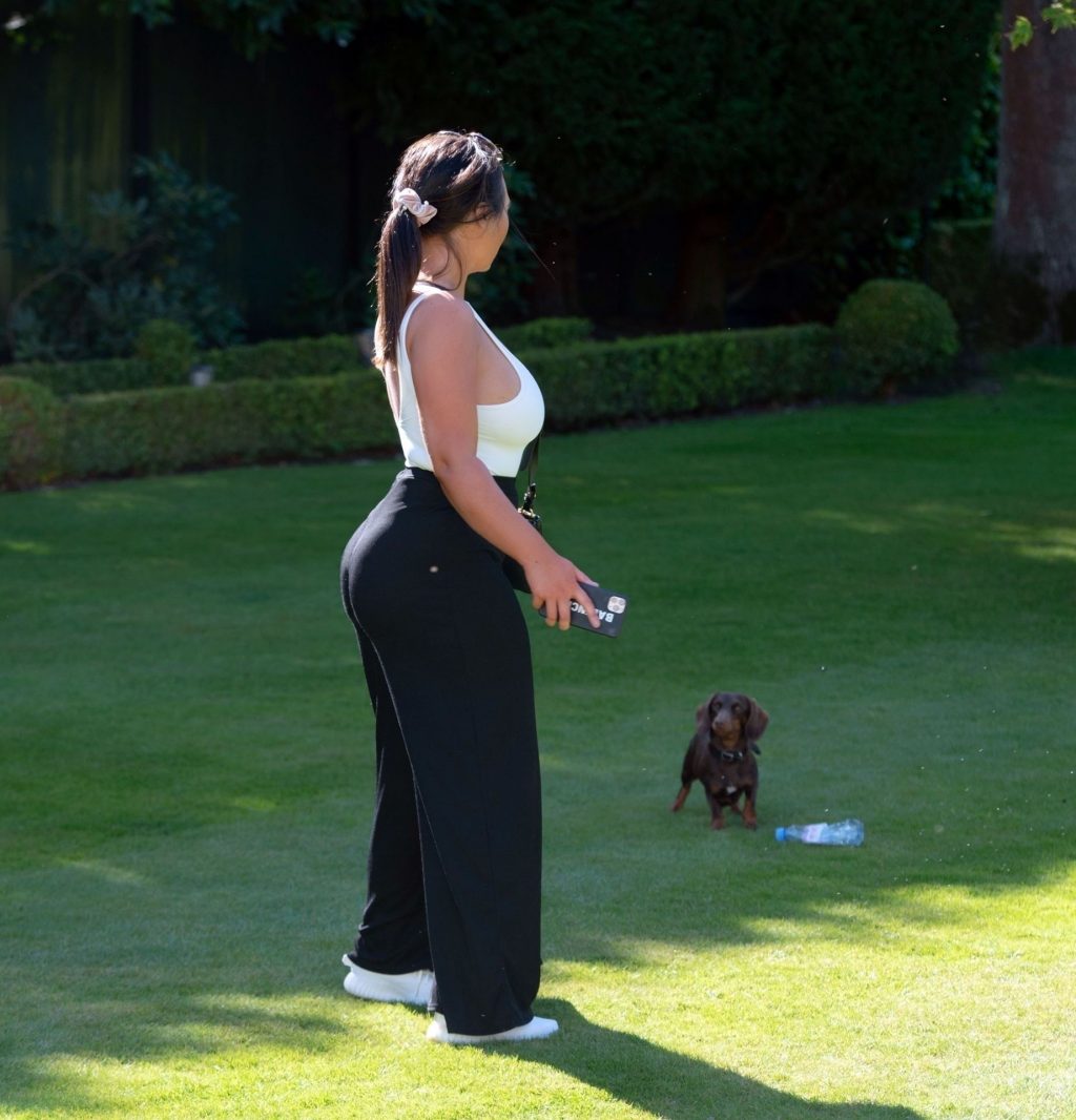 Лорен Гуджер замечена в своем местном парке в Эссексе, 20.05.2020. Звезда TOWIE одета в белую майку и черные брюки, играя с таксой.
