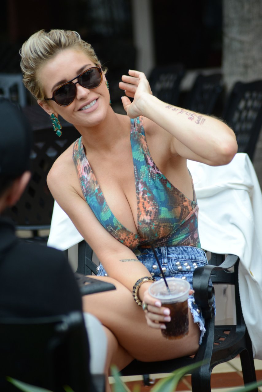 Модель Home Shopping Network Лорен Хаббард замечена во время прогулки и шопинга в Майами, 12.02.2018. Двойник Шэрон Стоун была в компании своего партнера/парня. Выглядит потрясающе в коротких джинсовых шортах и топе с глубоким вырезом, который едва сдерживает её естественную грудь.