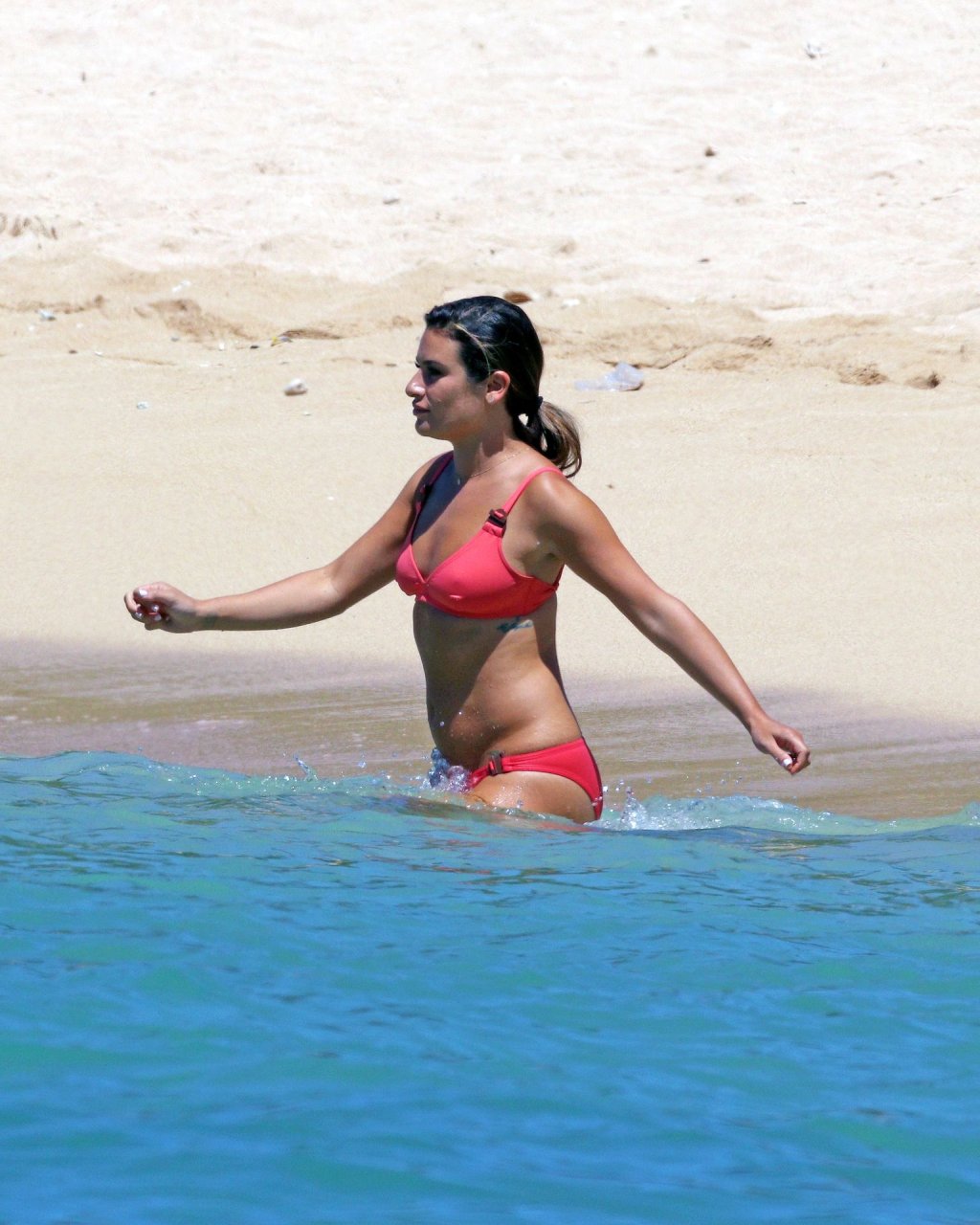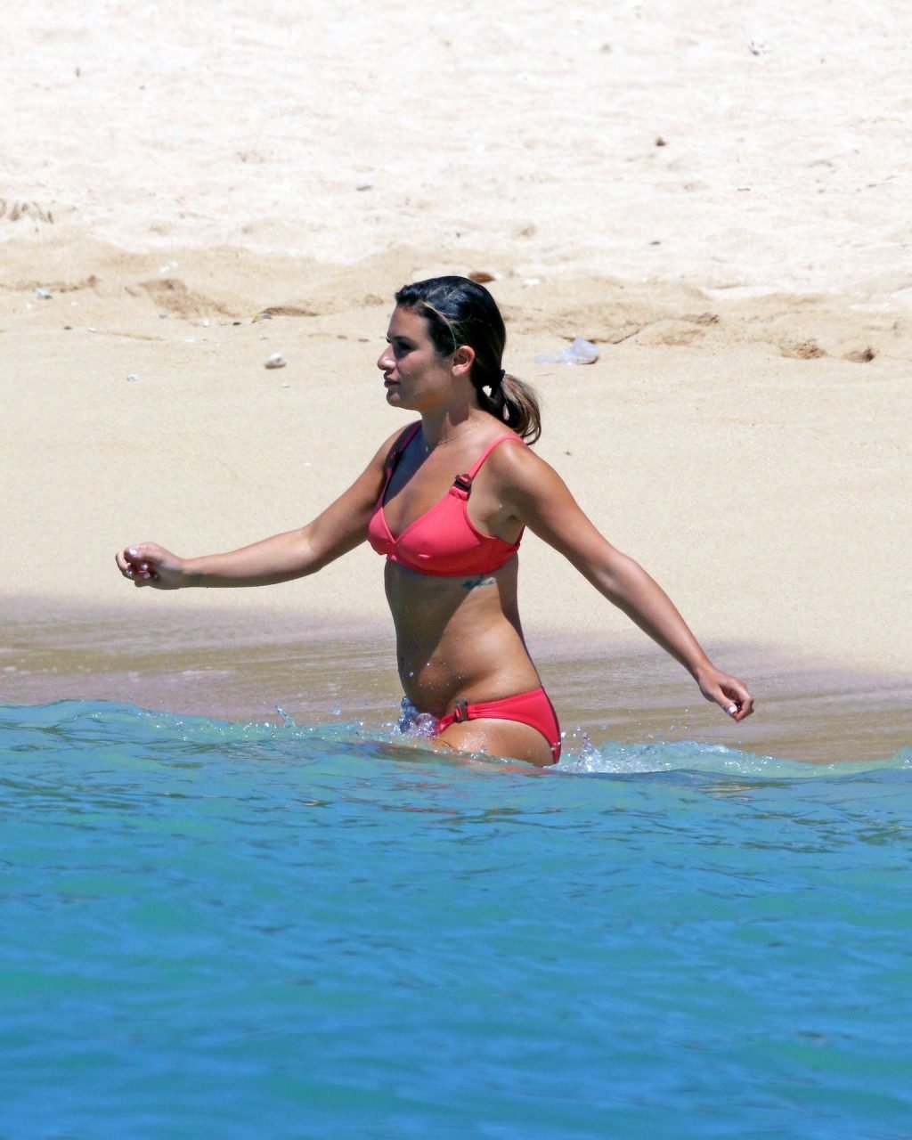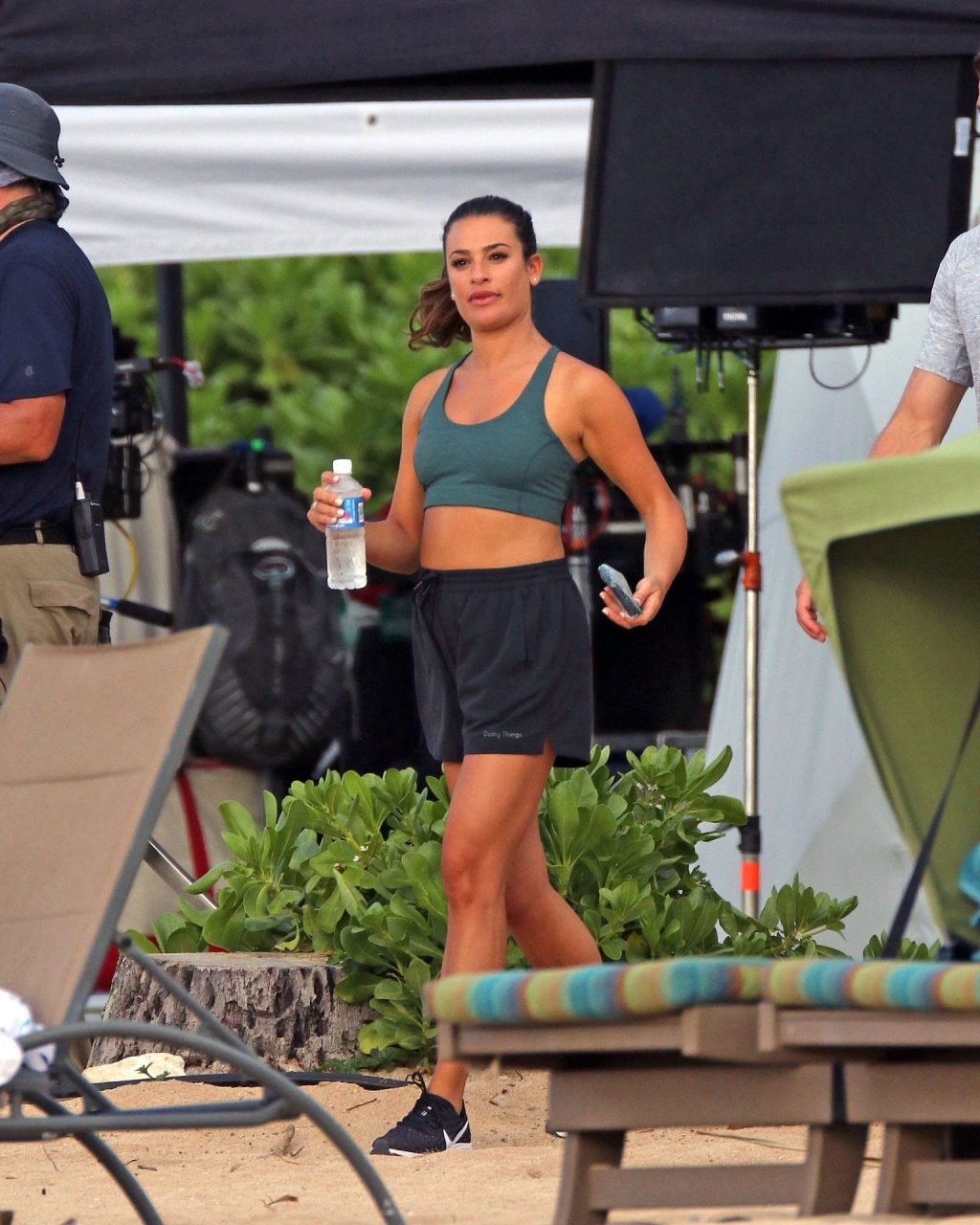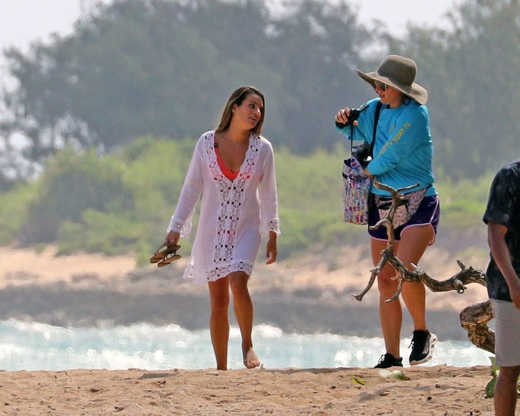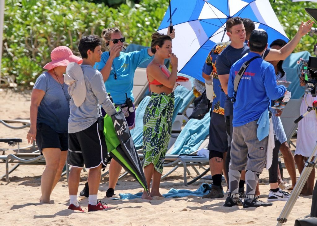 Лиа Мишель в ярко-розовом бикини на съемочной площадке на Гавайях, 16.08.2019. 32-летняя бывшая звезда “Хор” была замечена за едой между дублями.