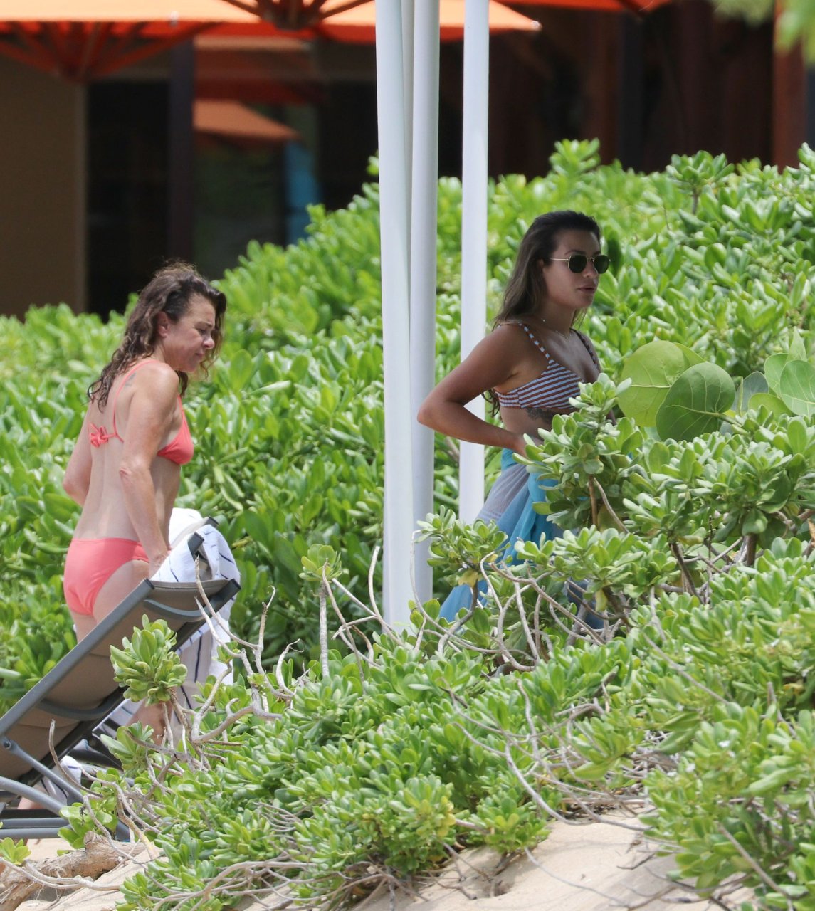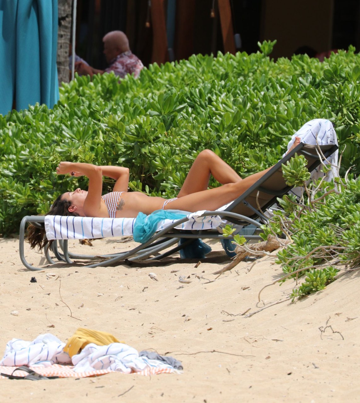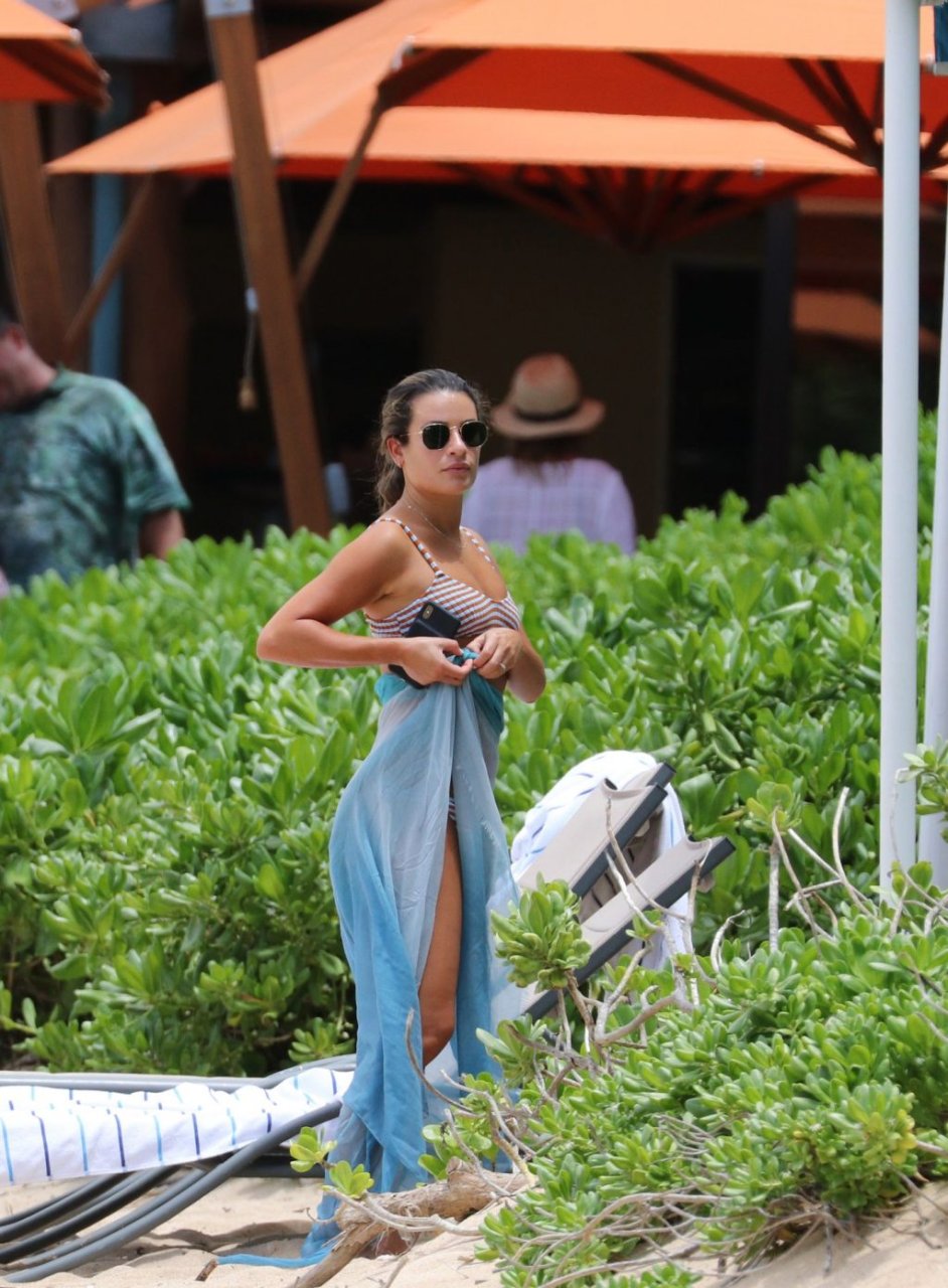 Лиа Мишель замечена во время купания в океане на Гавайях, 07.08.2019. 32-летняя актриса затем наслаждалась загаром, надев соломенную шляпу и оранжево-белый полосатый двухсекционный купальник.