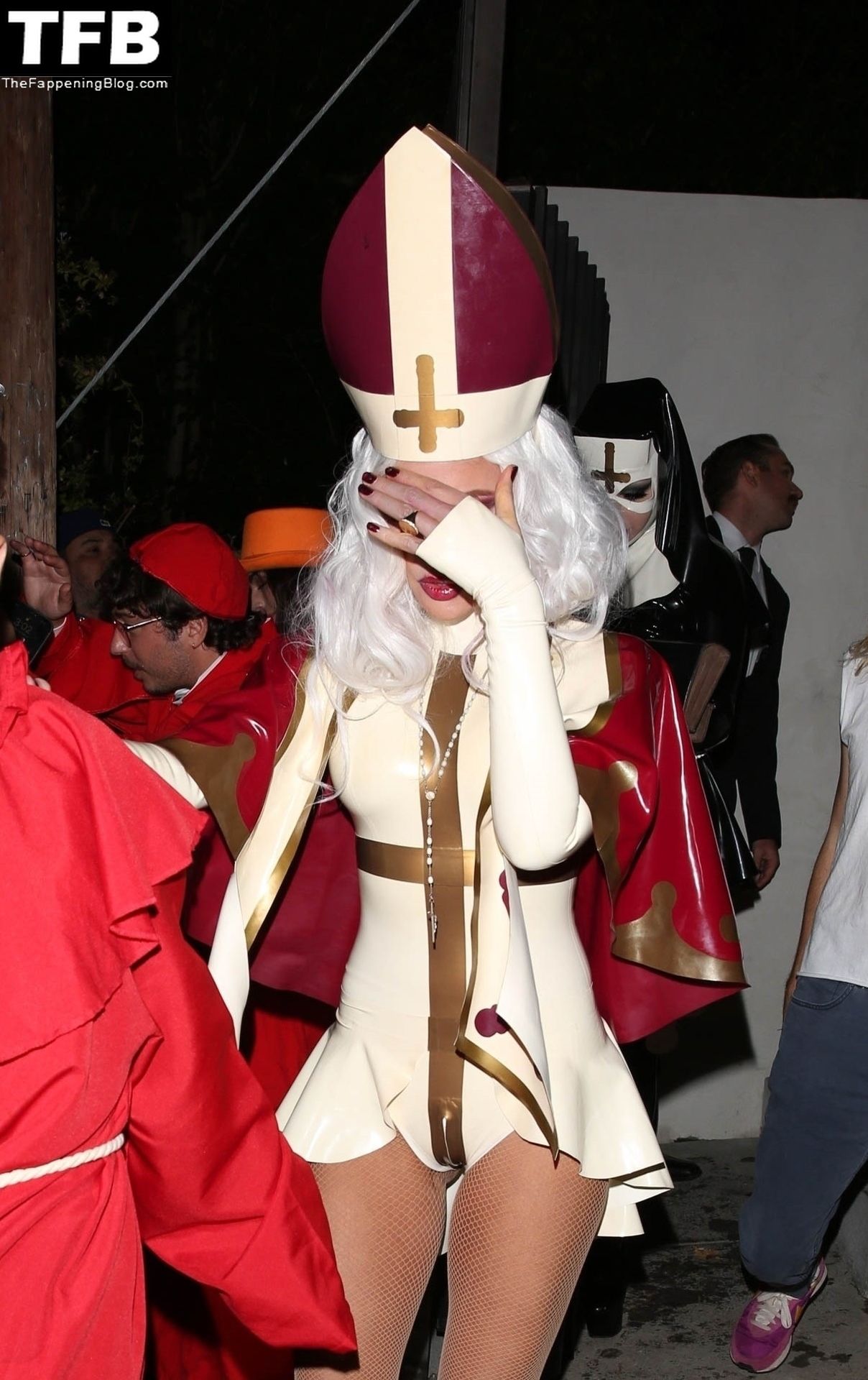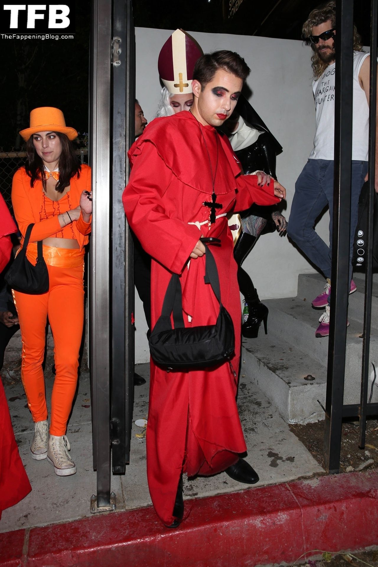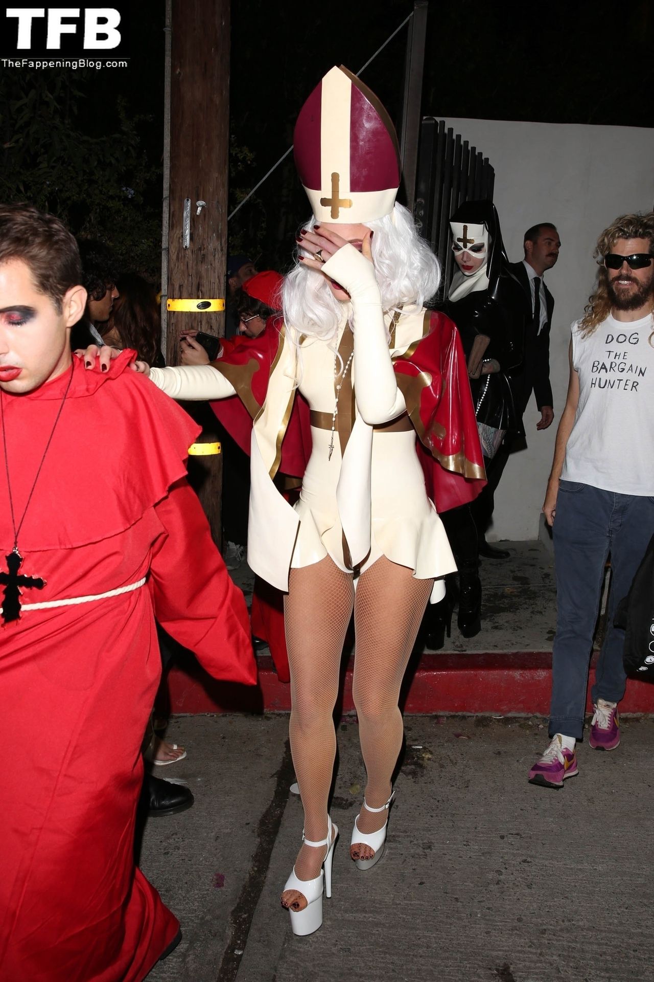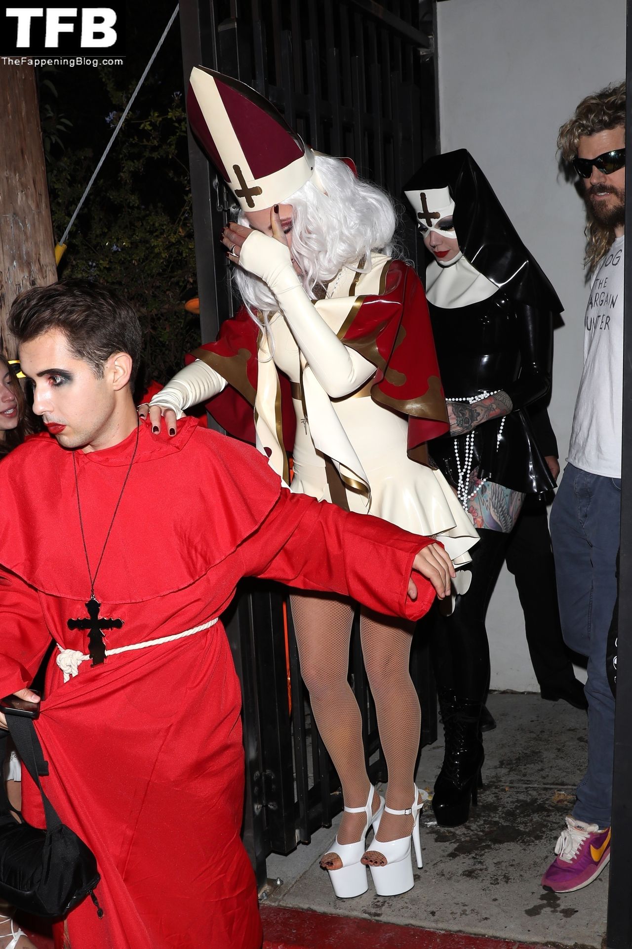 Звезда Фаппенинга и актриса Кейт Бекинсейл наряжается папой, когда она и друзья покидают вечеринку на Хэллоуин в Вест-Голливуде, 31.10.2021.