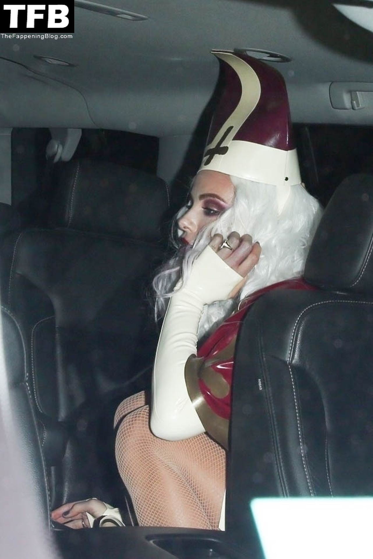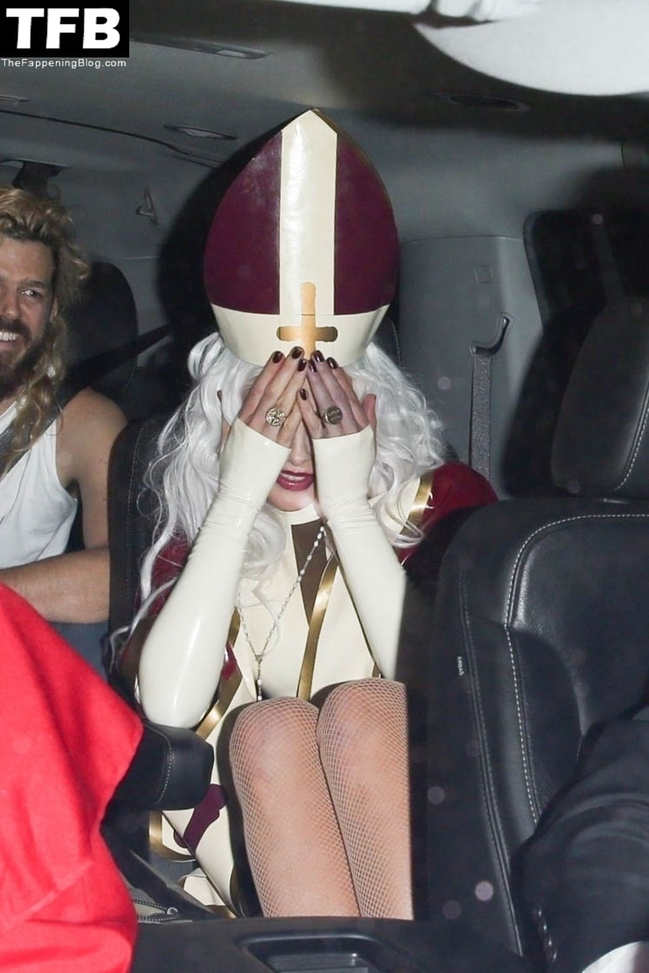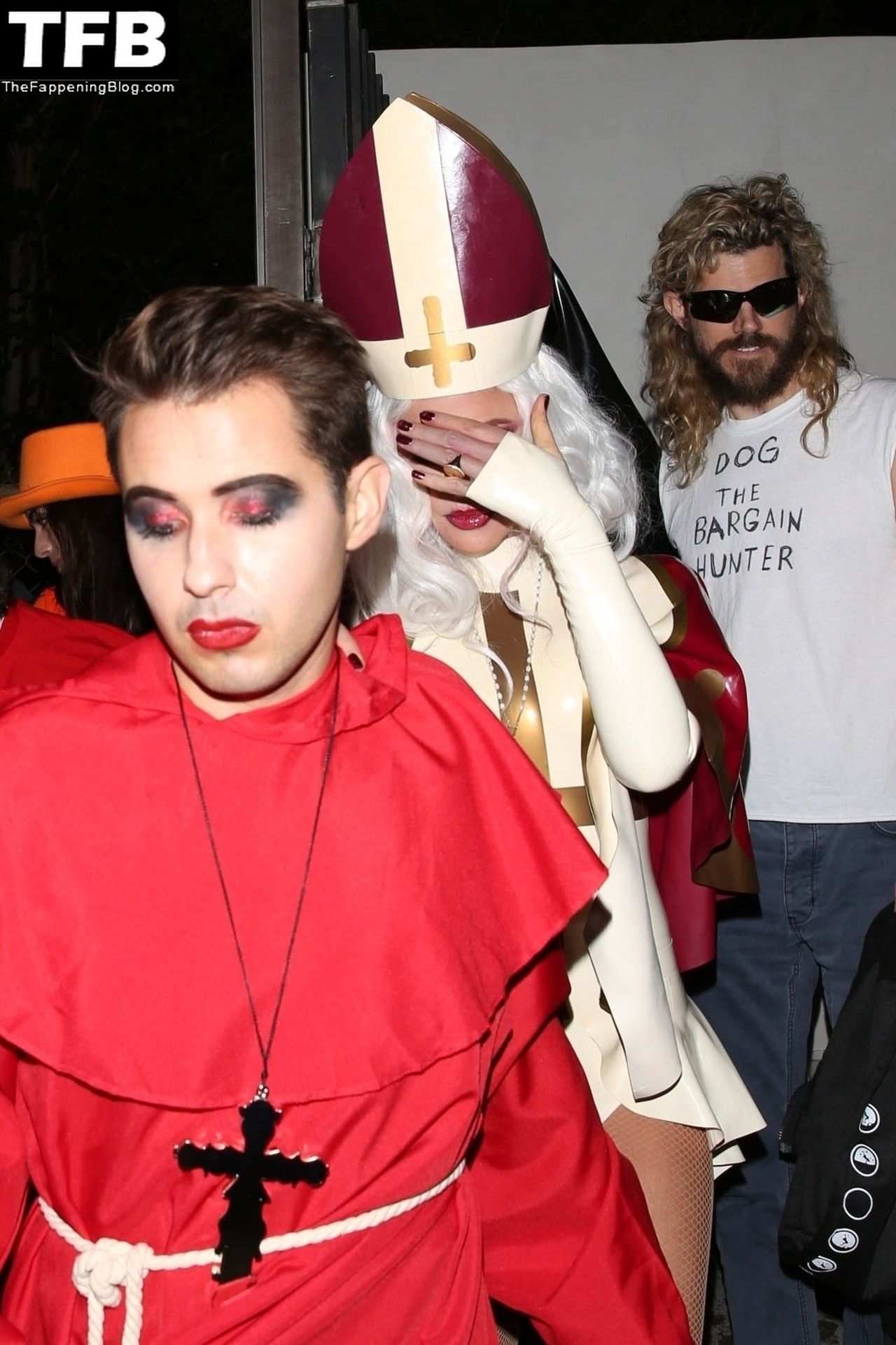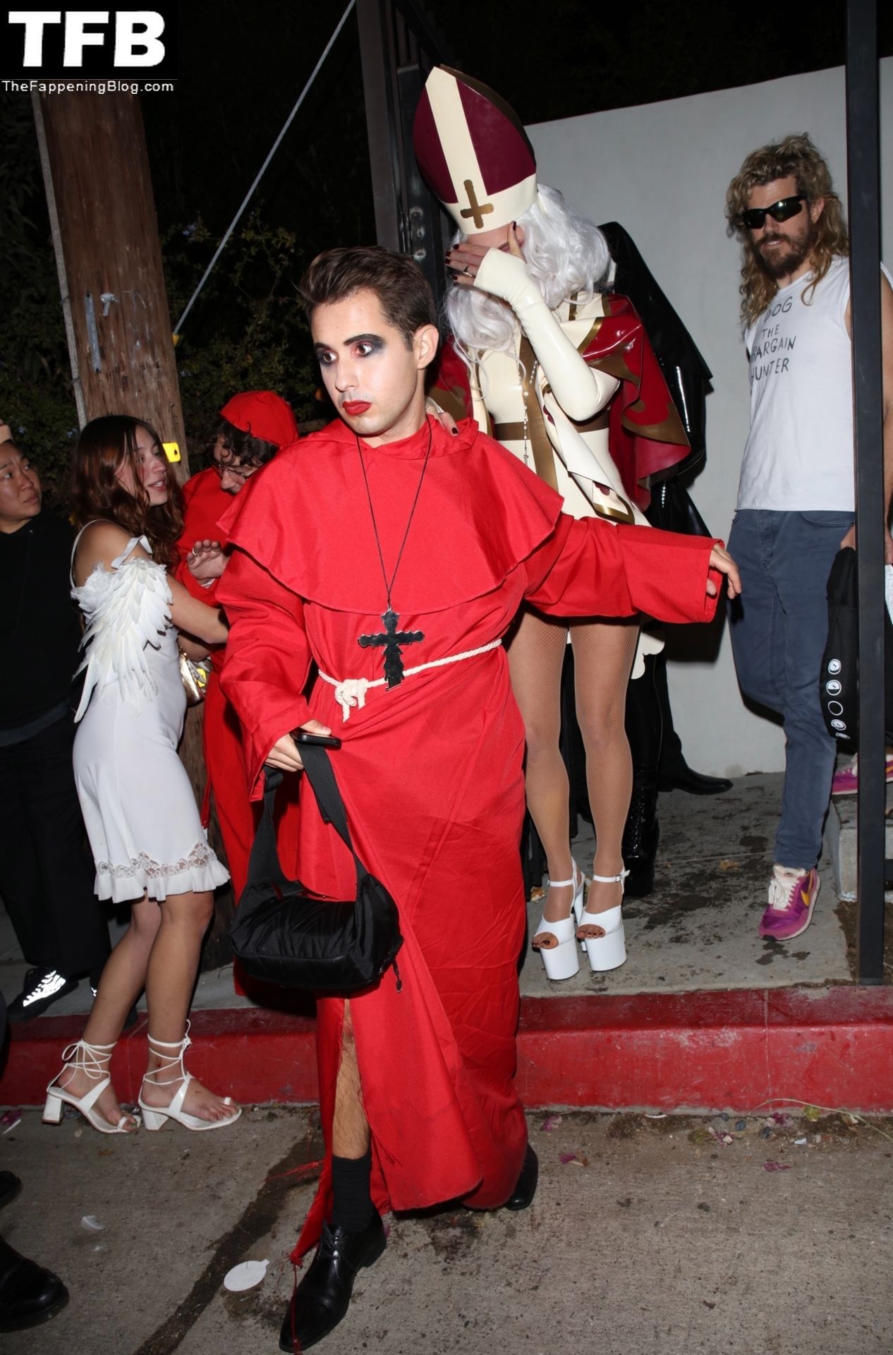 Звезда Фаппенинга и актриса Кейт Бекинсейл наряжается папой, когда она и друзья покидают вечеринку на Хэллоуин в Вест-Голливуде, 31.10.2021.