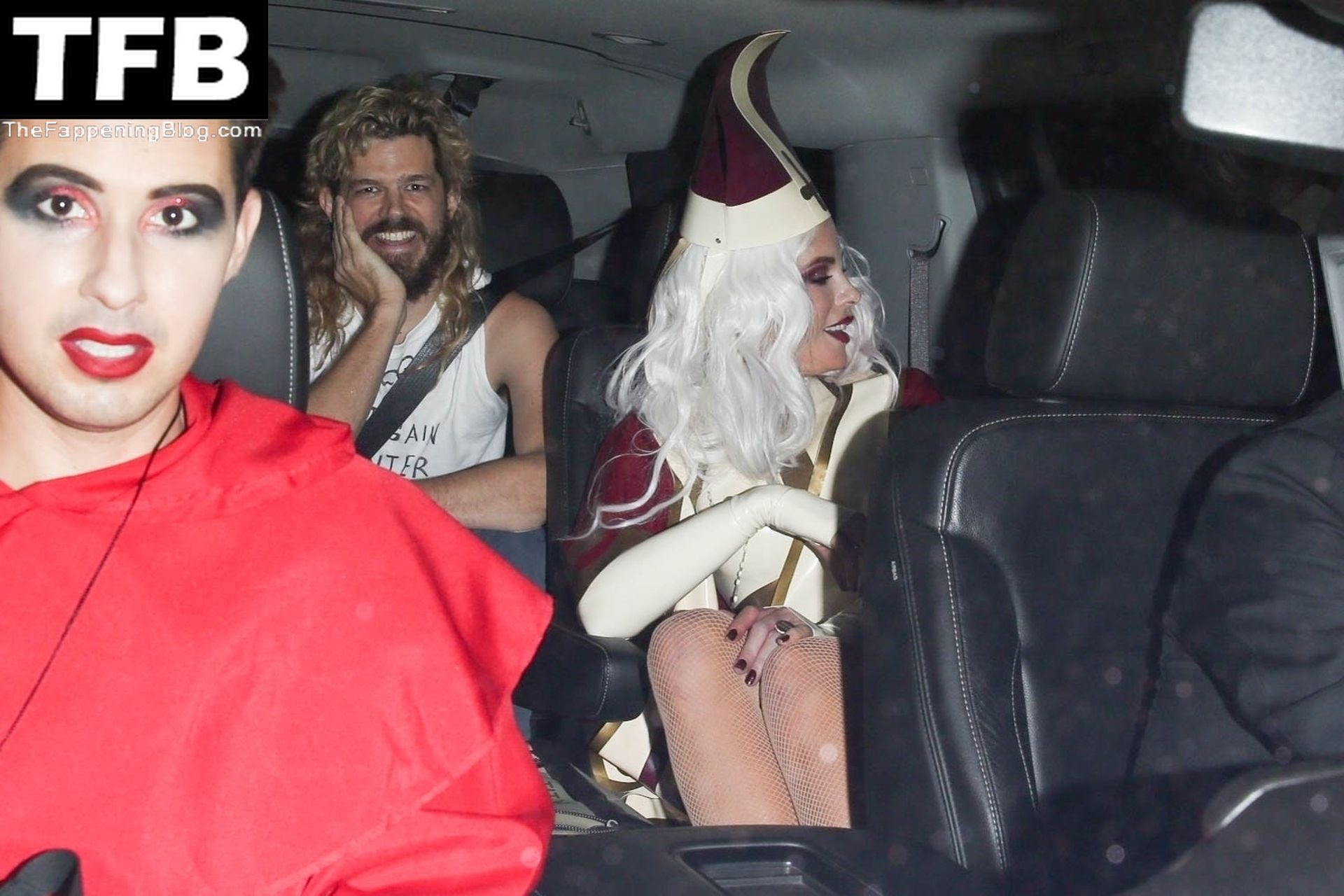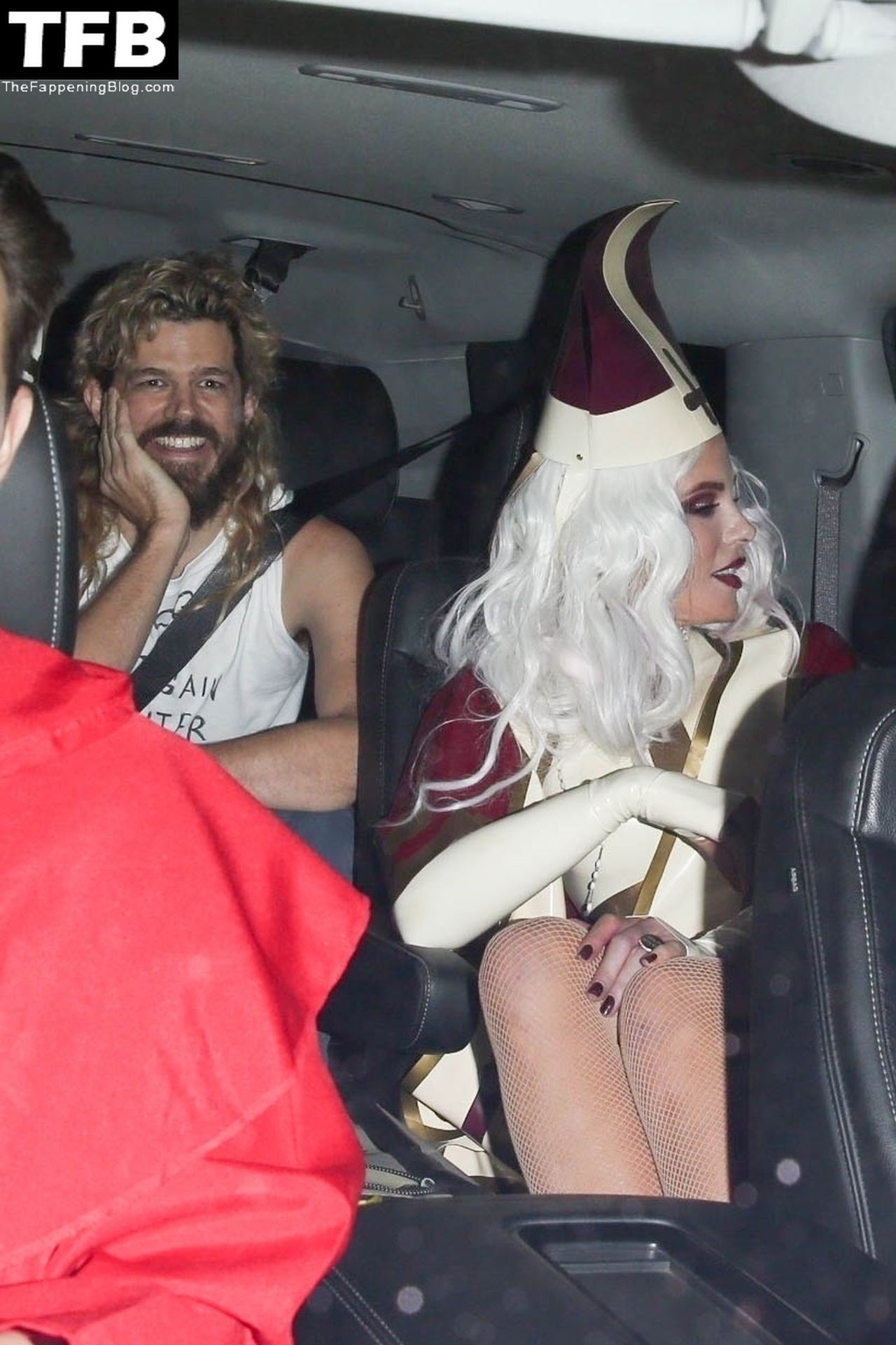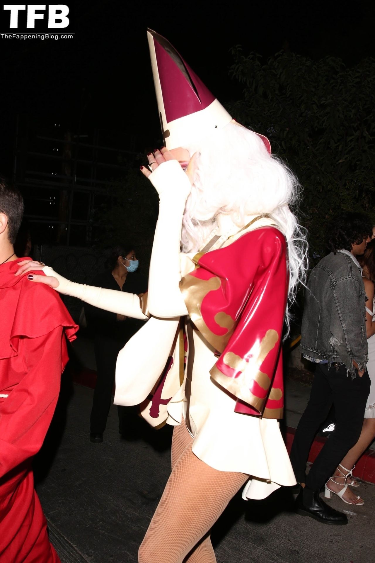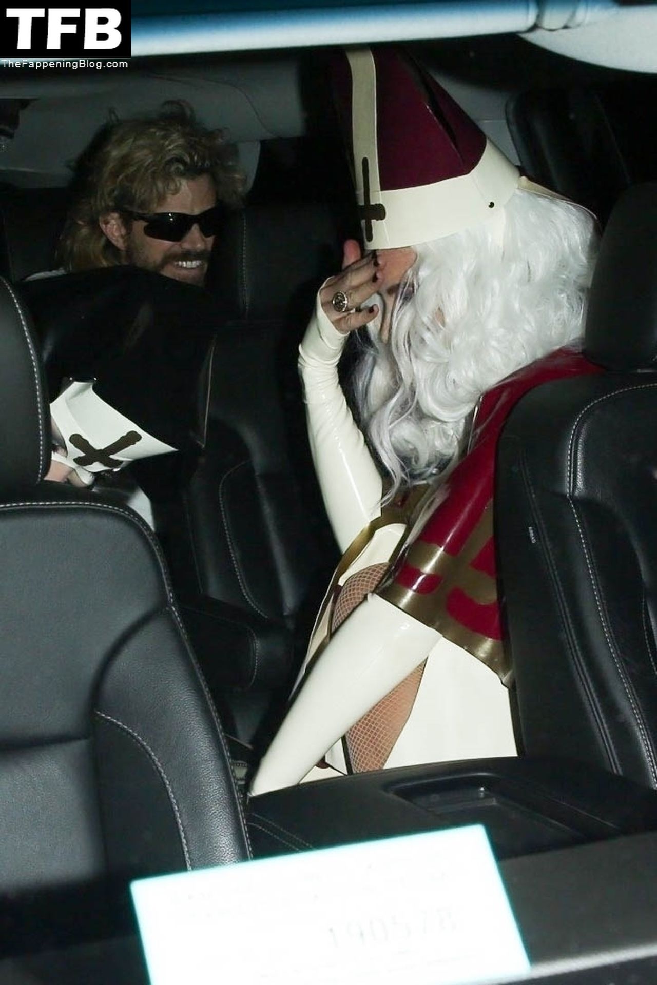 Звезда Фаппенинга и актриса Кейт Бекинсейл наряжается папой, когда она и друзья покидают вечеринку на Хэллоуин в Вест-Голливуде, 31.10.2021.