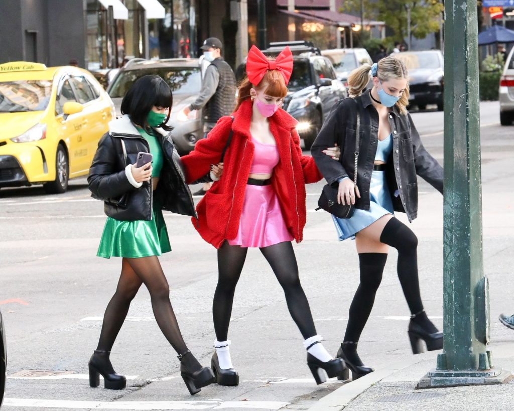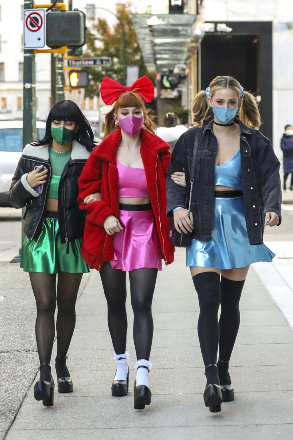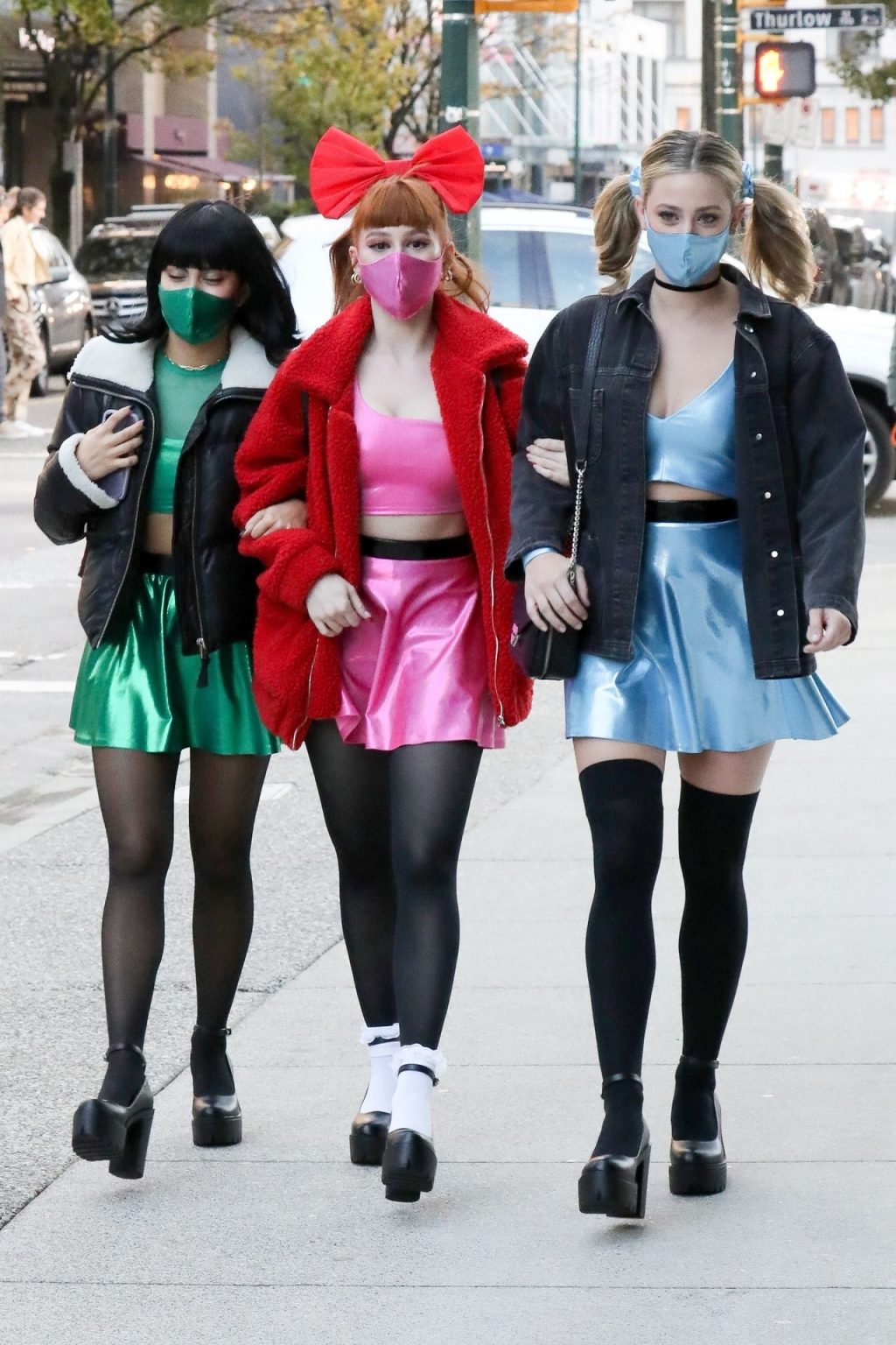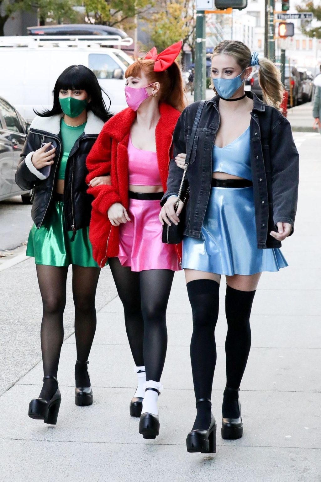 Звезды сериала Ривердейл Лили Рейнхарт, Камила Мендес и Маделайн Петч делают групповый костюм на Хэллоуин в образе Девочек-супергероинь – Ванкувер, 31.10.2020. Они направляются на детский душ Ванессы Морган.