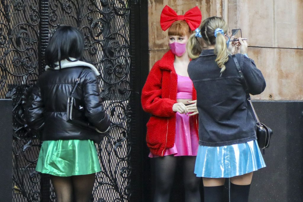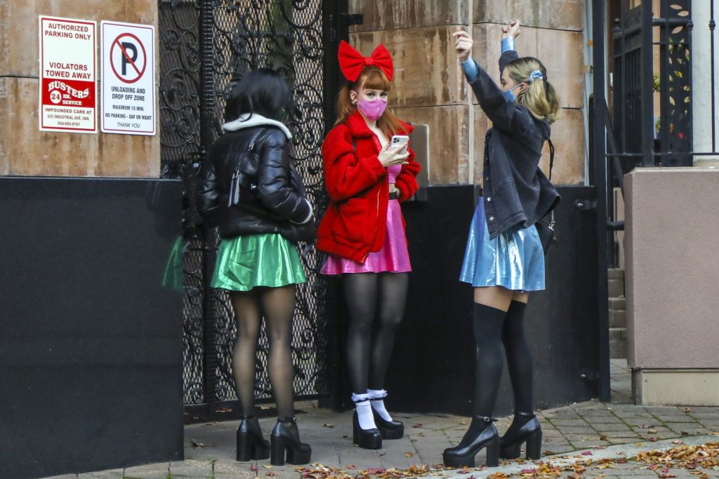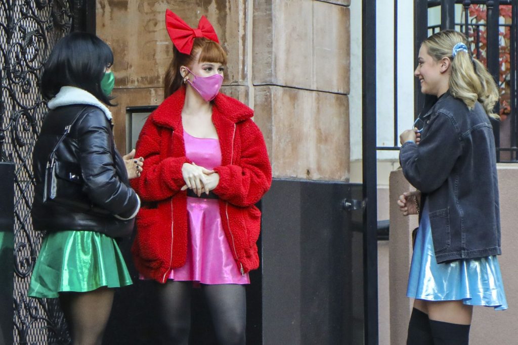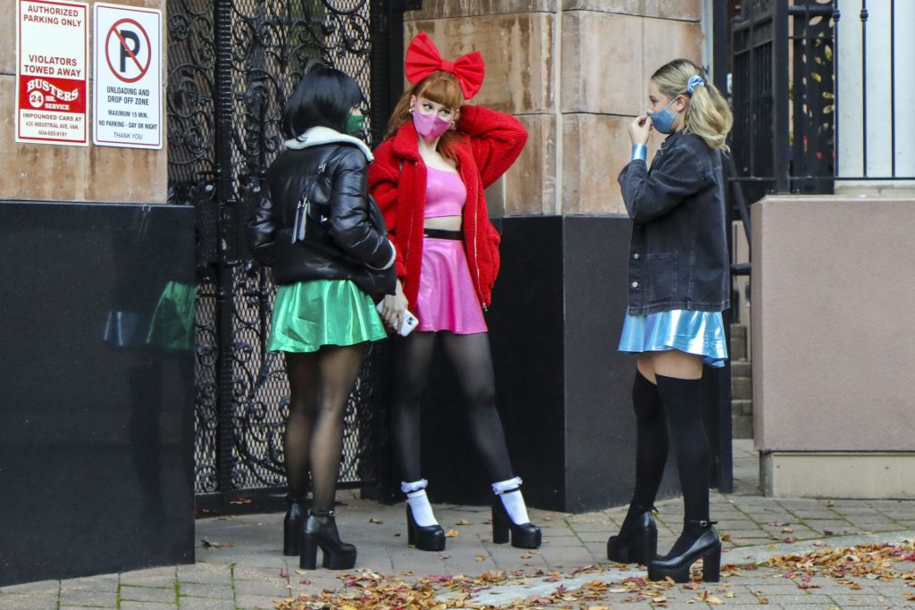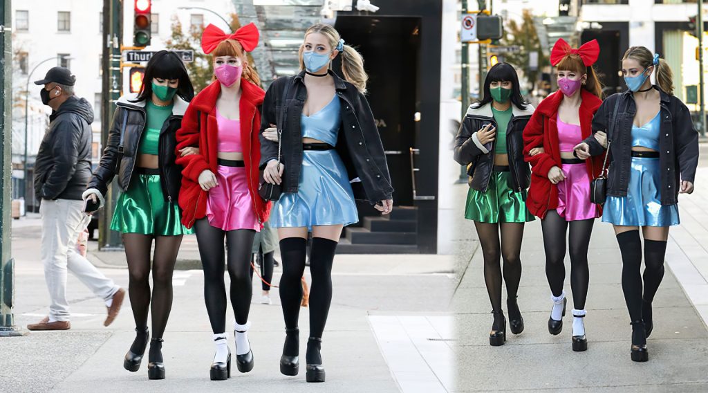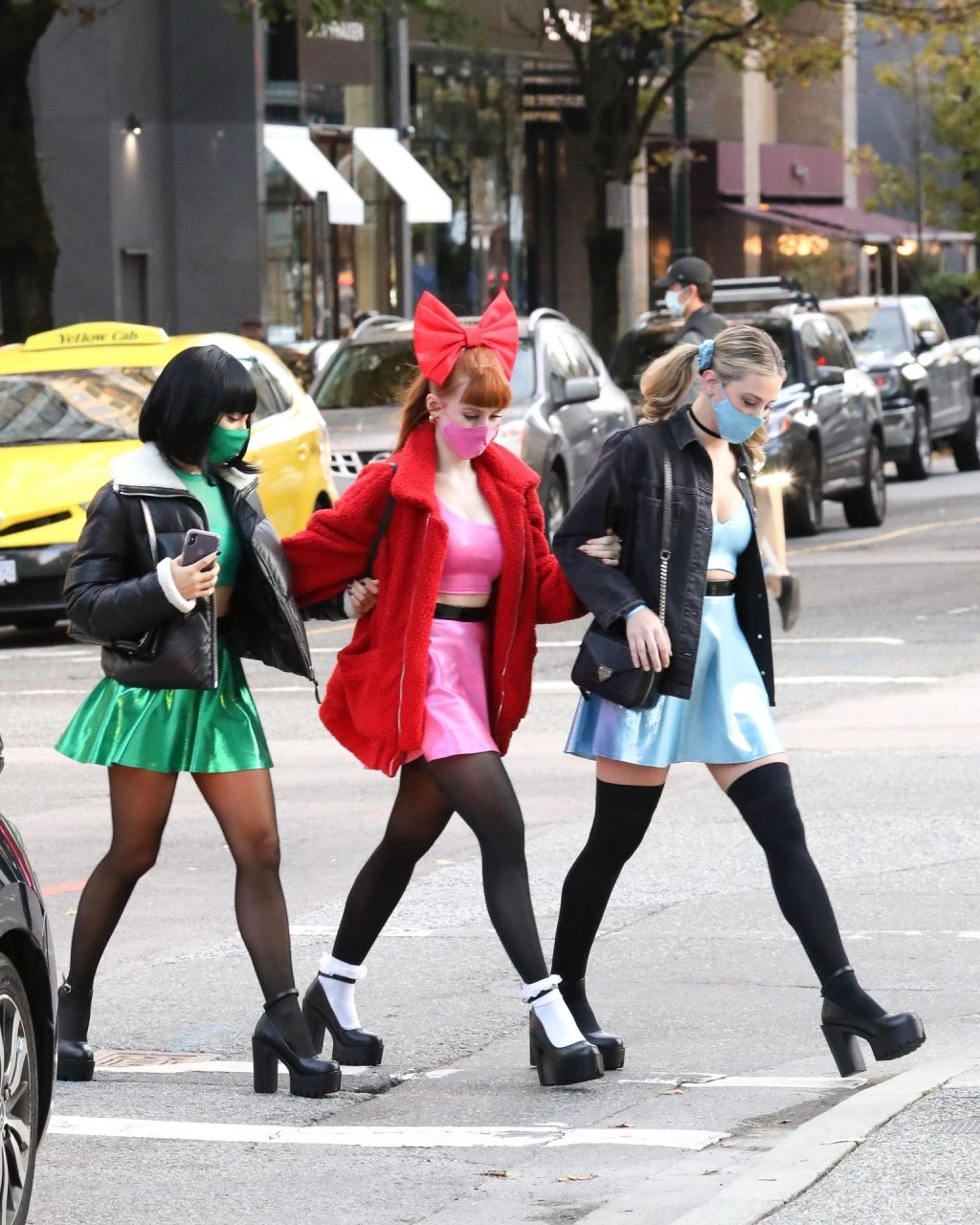 Звезды сериала Ривердейл Лили Рейнхарт, Камила Мендес и Маделайн Петч делают групповый костюм на Хэллоуин в образе Девочек-супергероинь – Ванкувер, 31.10.2020. Они направляются на детский душ Ванессы Морган.