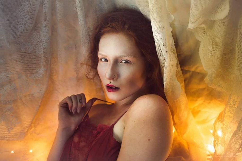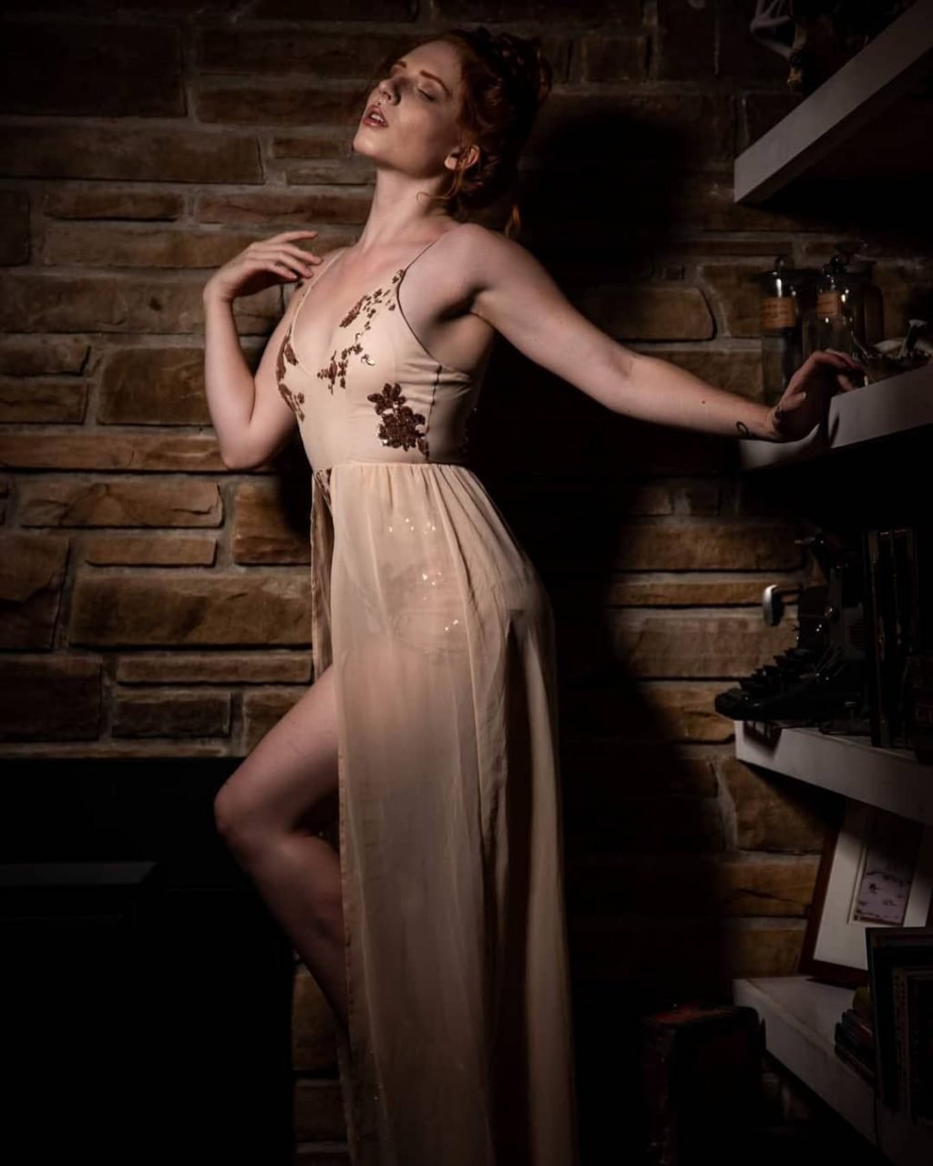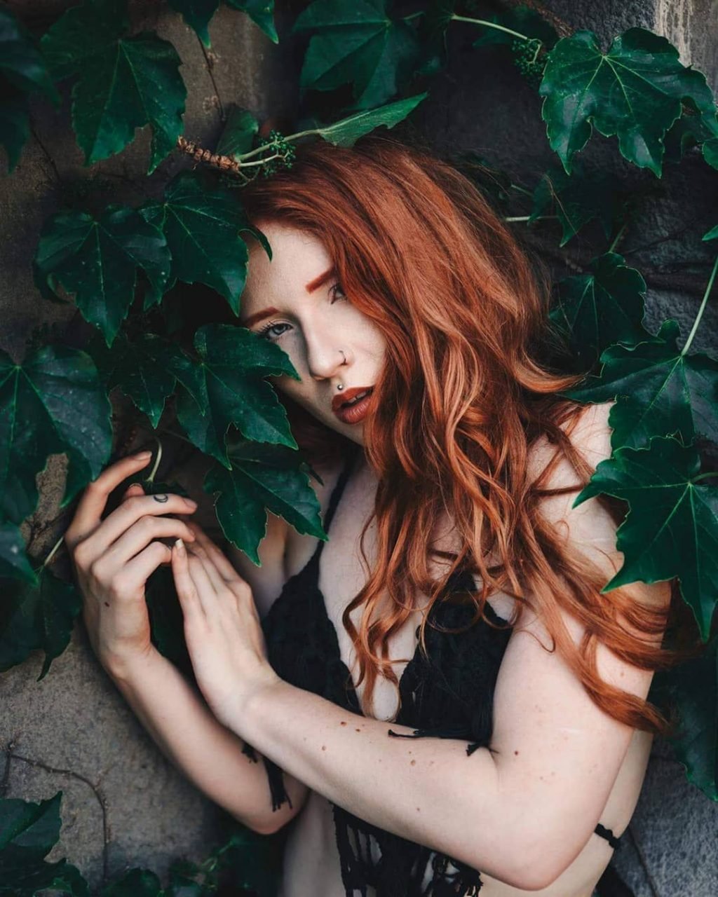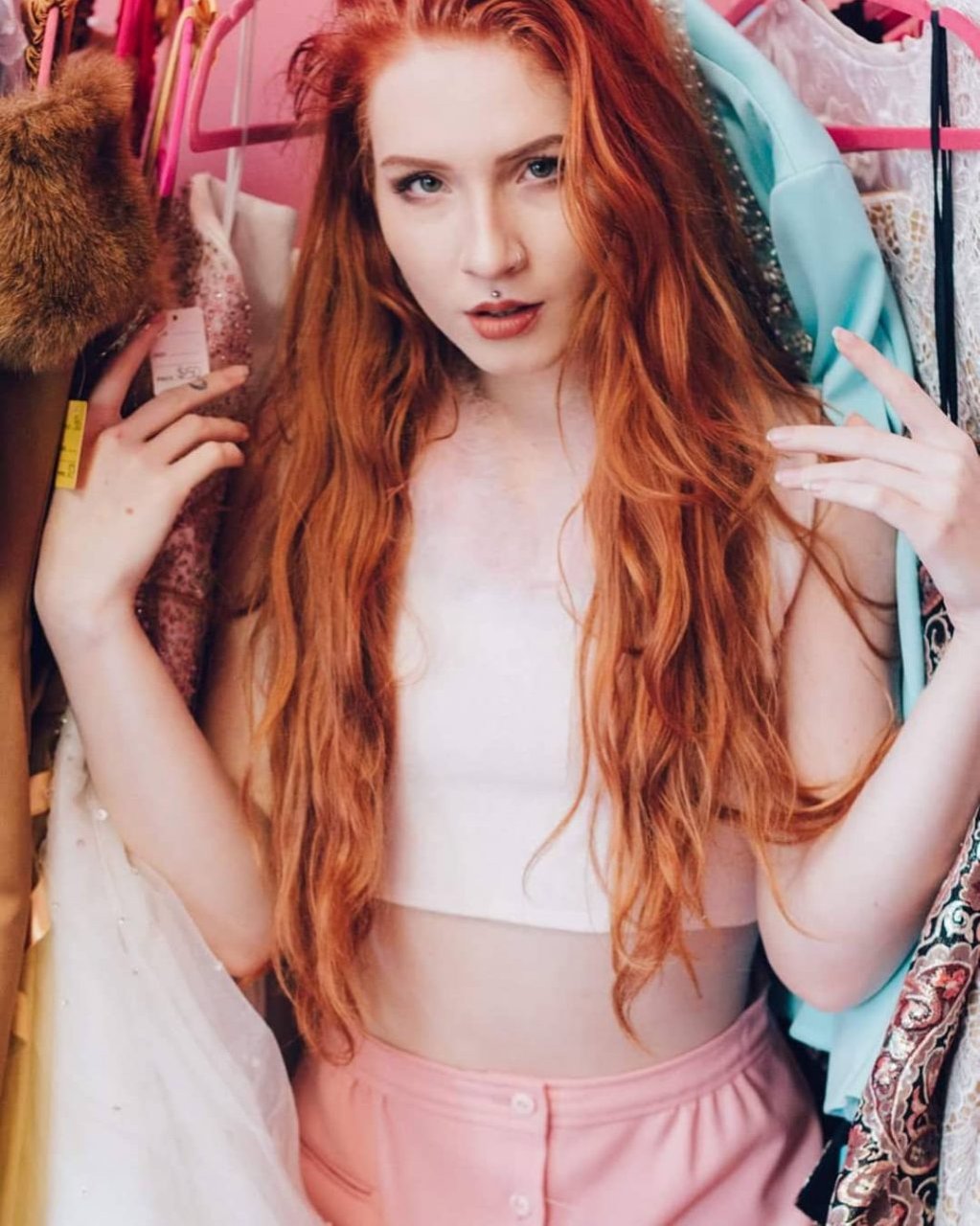 У рыжеволосой молодой девушки натуральное тело с татуировками и грудь с пирсингом на сосках. У неё есть Instagram с почти 8 тысячами подписчиков и аккаунт на Patreon с NSFW премиум-контентом.