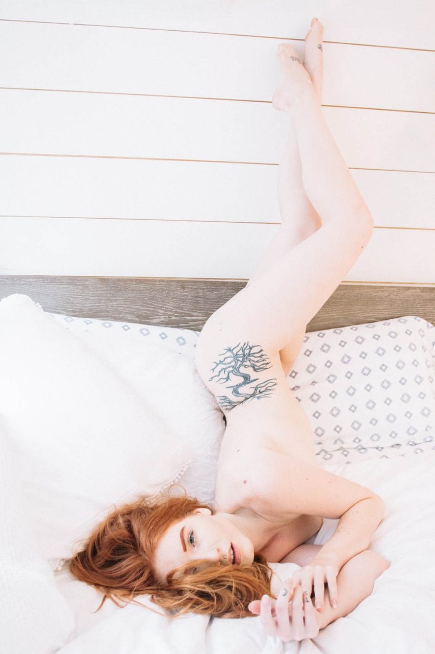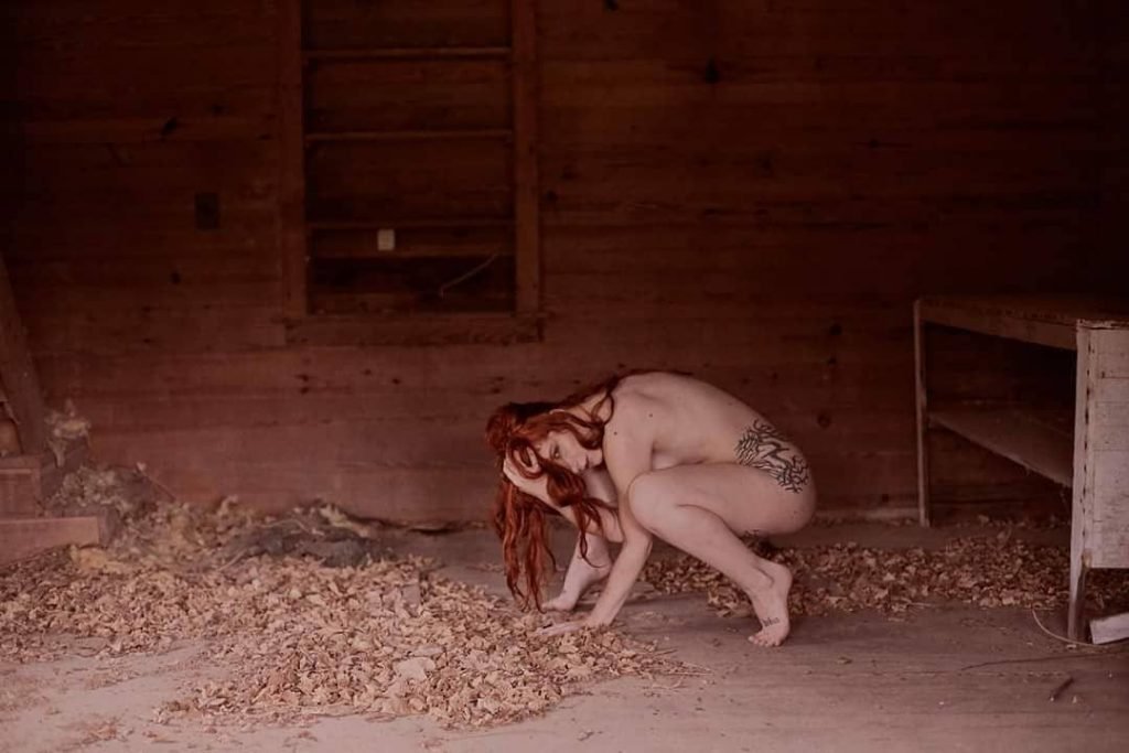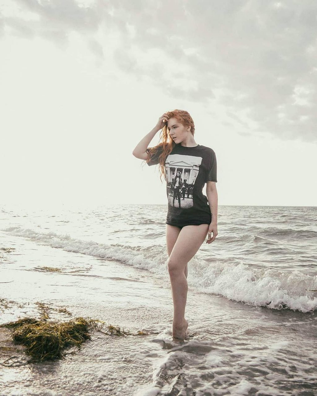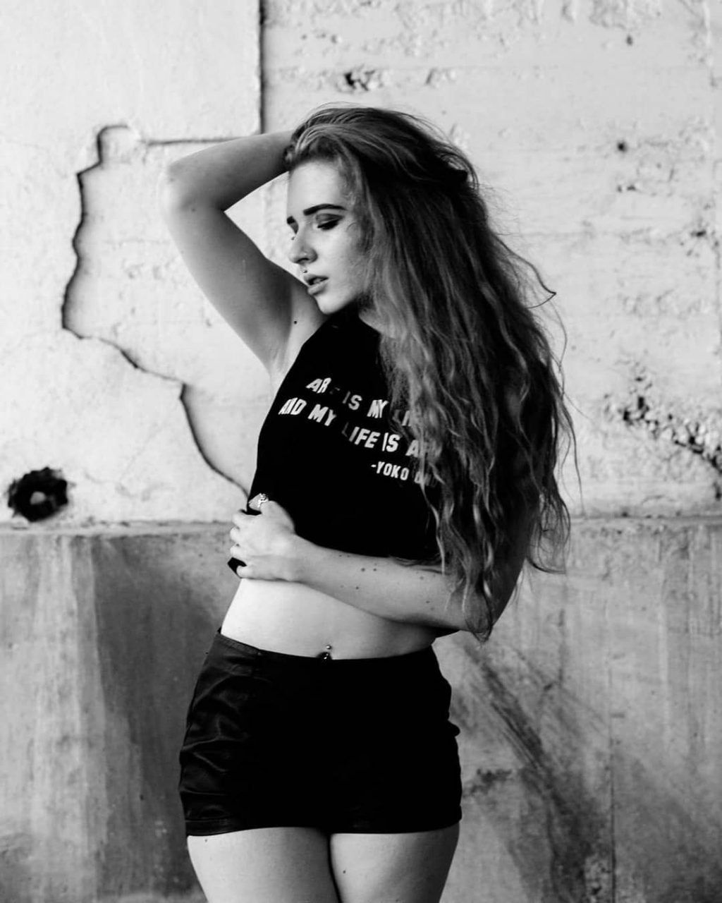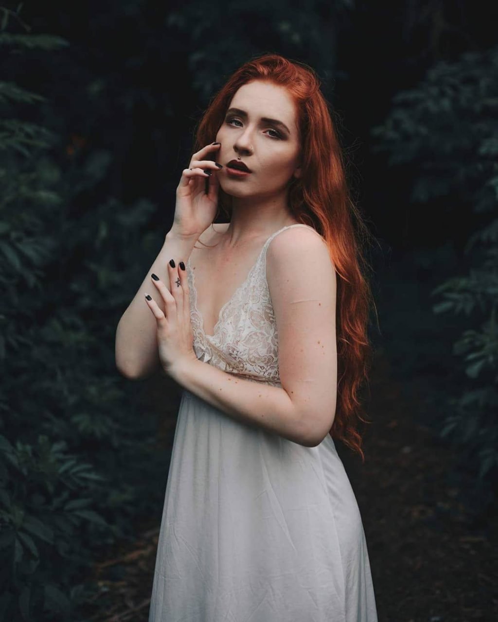 У рыжеволосой молодой девушки натуральное тело с татуировками и грудь с пирсингом на сосках. У неё есть Instagram с почти 8 тысячами подписчиков и аккаунт на Patreon с NSFW премиум-контентом.
