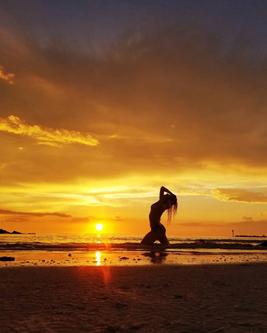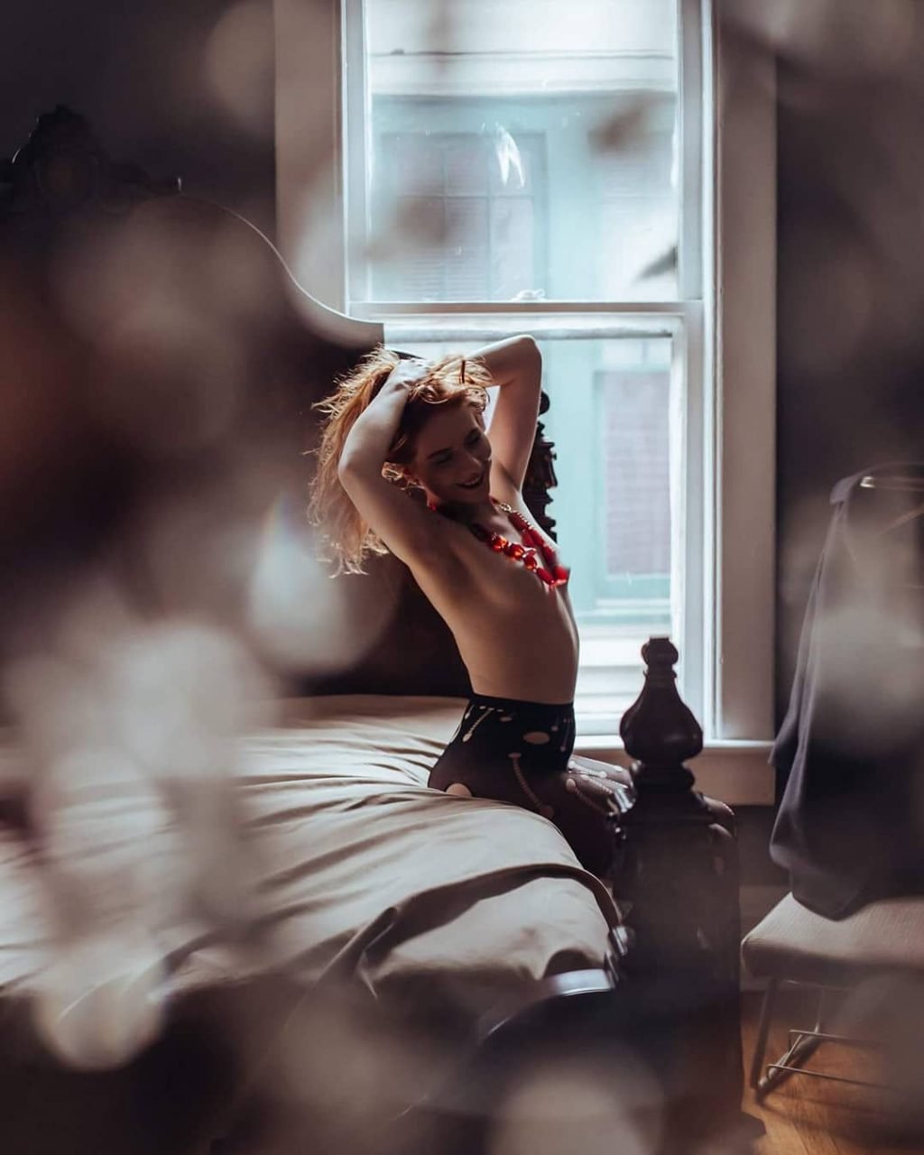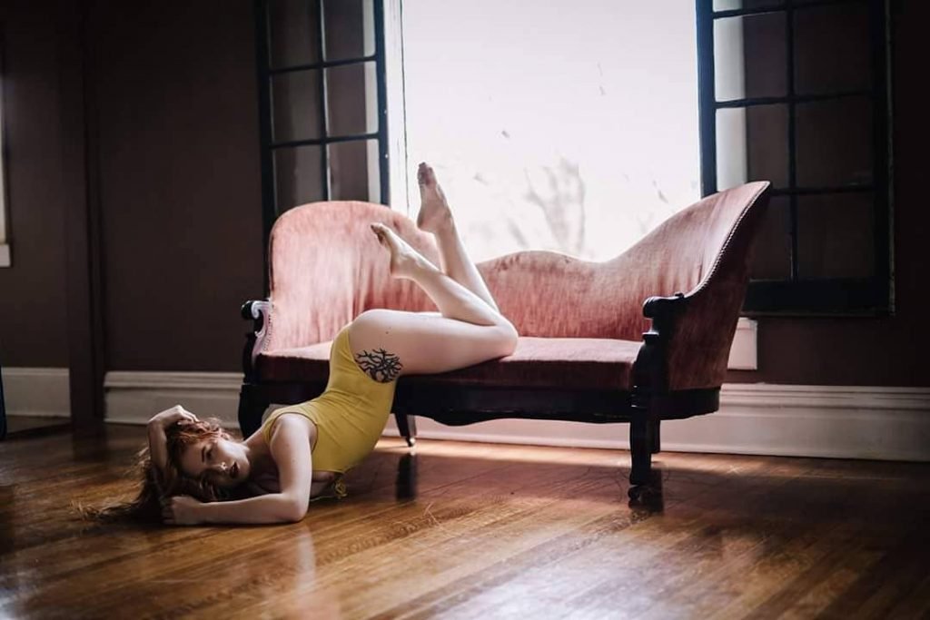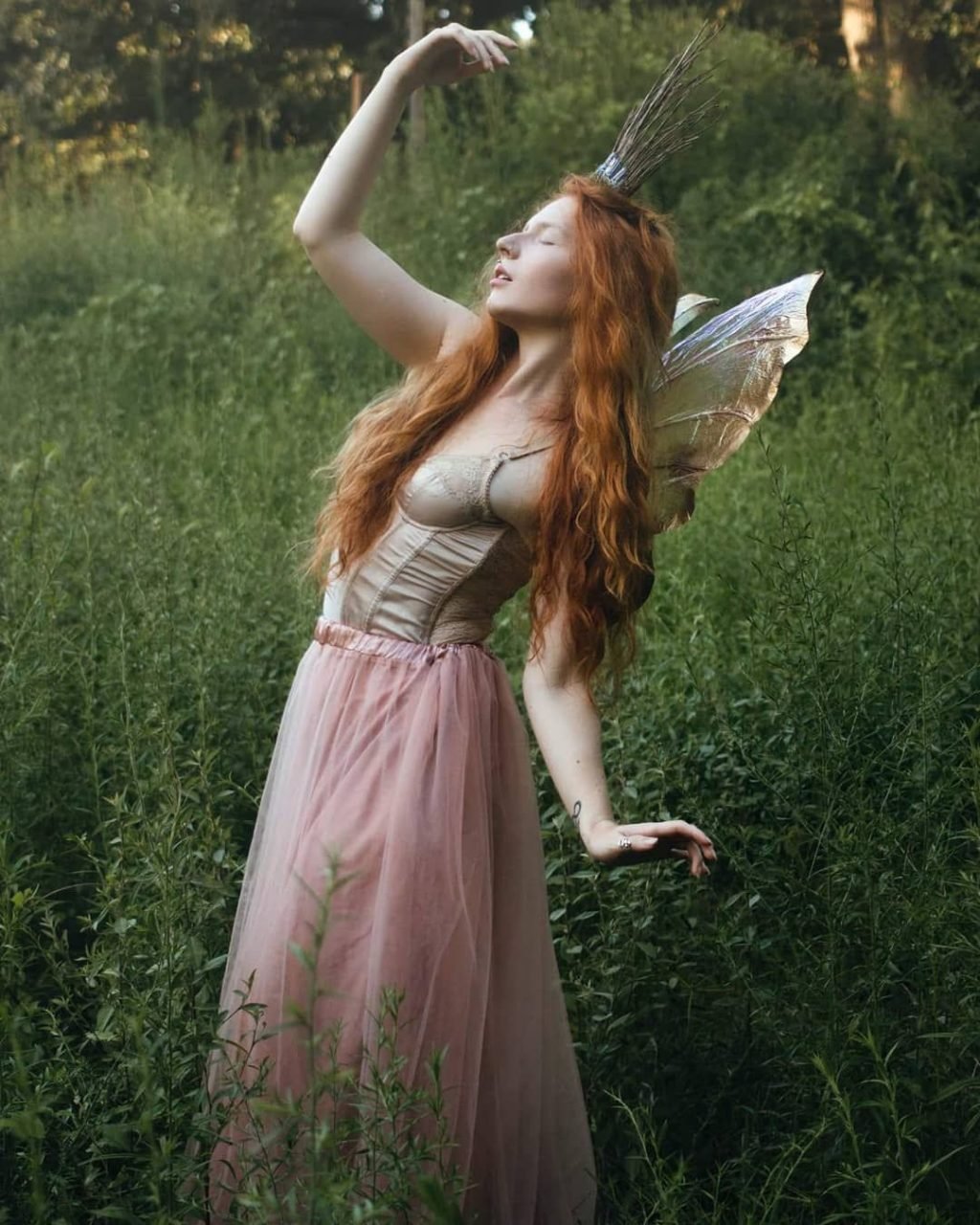 У рыжеволосой молодой девушки натуральное тело с татуировками и грудь с пирсингом на сосках. У неё есть Instagram с почти 8 тысячами подписчиков и аккаунт на Patreon с NSFW премиум-контентом.