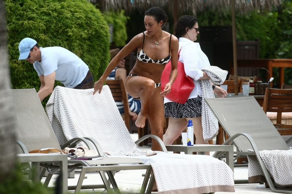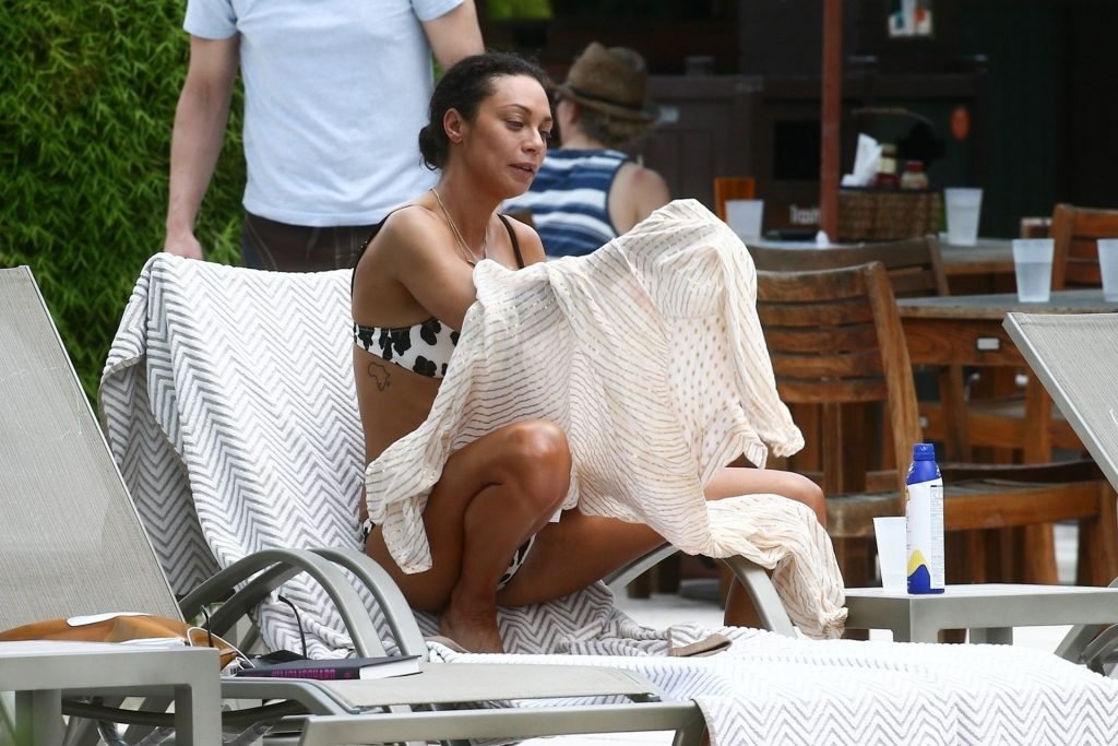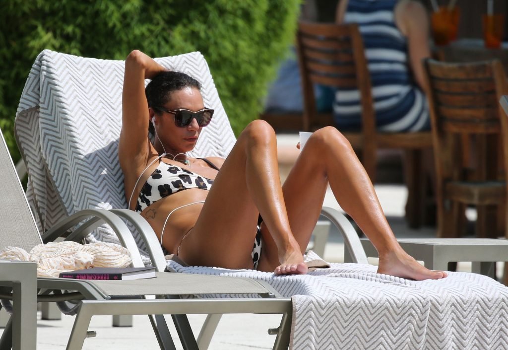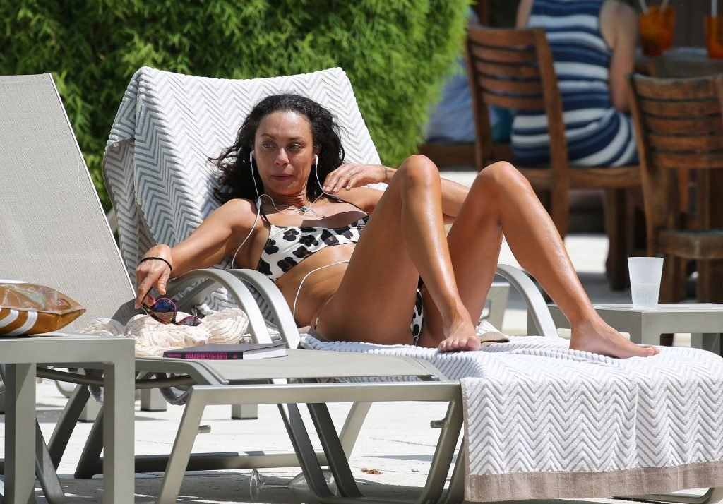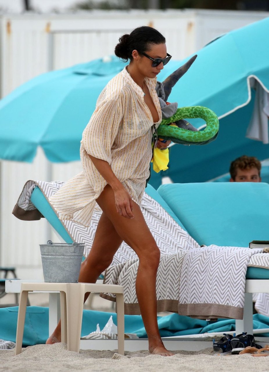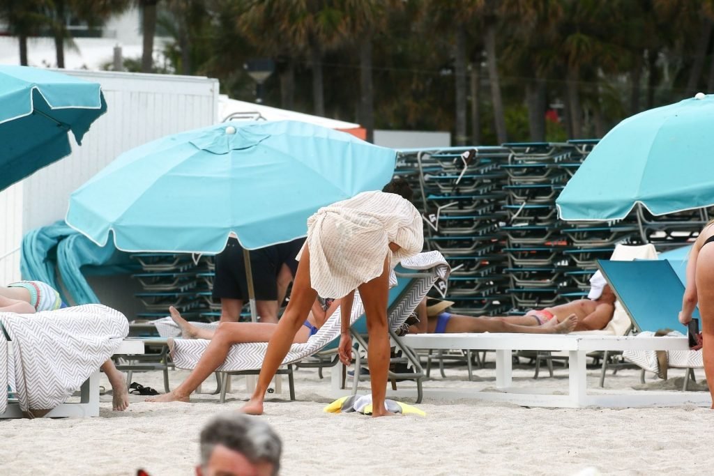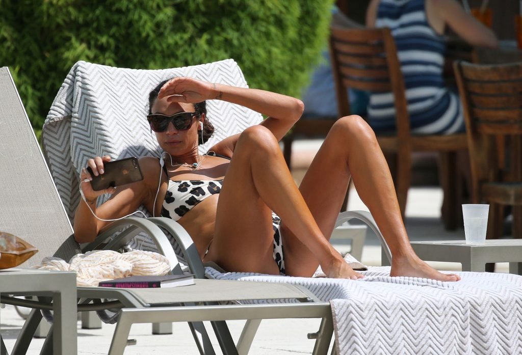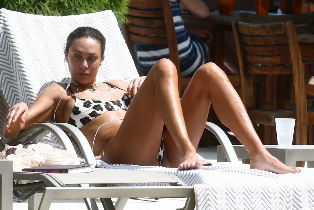 Недавно ставшая свободной Лилли Беккер загорает в бикини с животным принтом вместе со своим сыном Амадеусом Беккером на солнечном пляже Майами, 10.04.2019. Лилли наносит лосьон, в то время как её сын отдыхает на пляжном кресле.