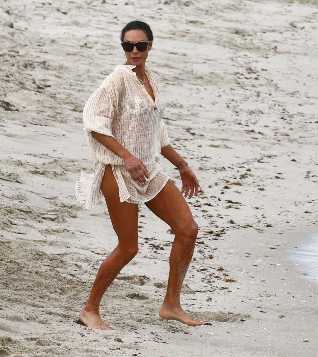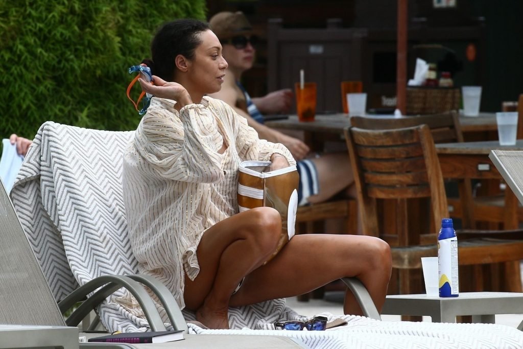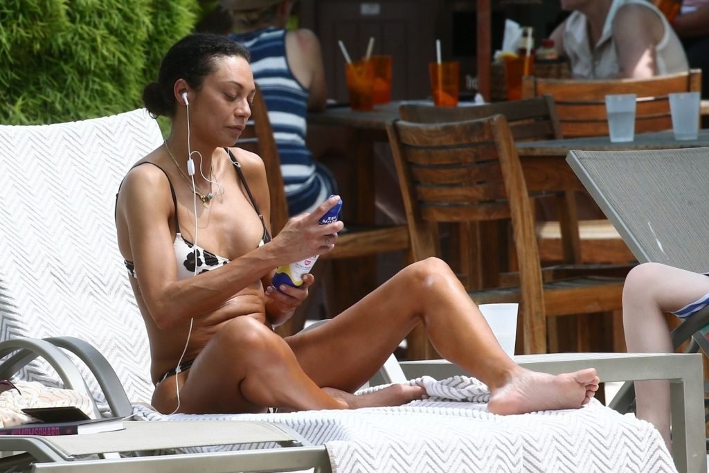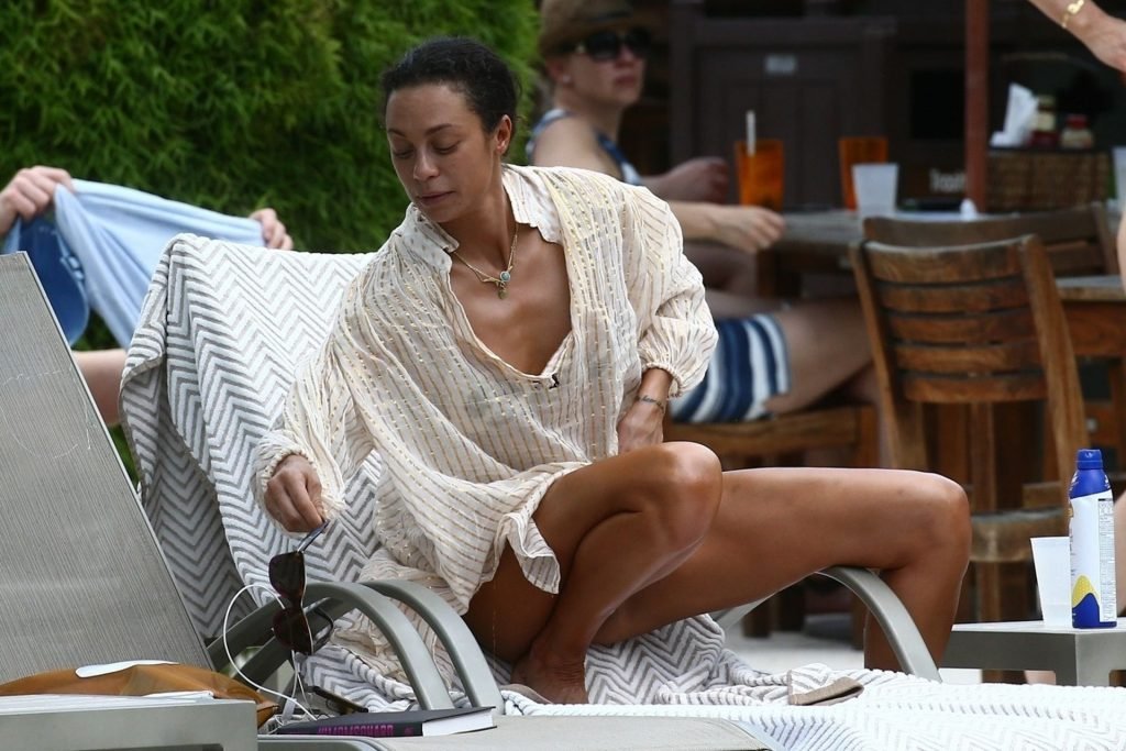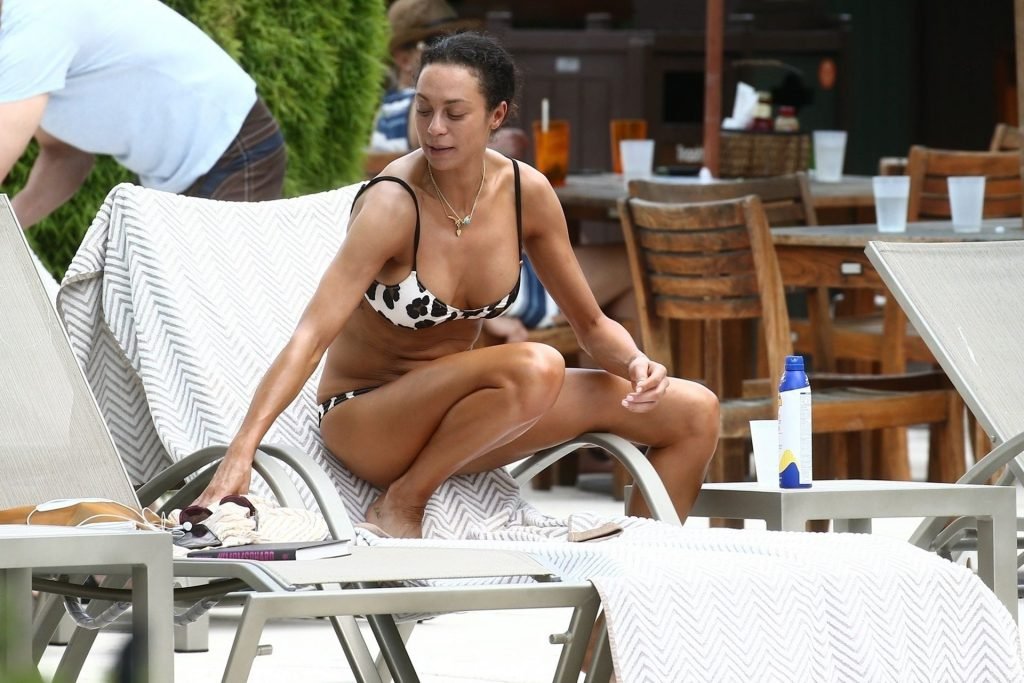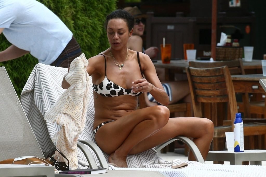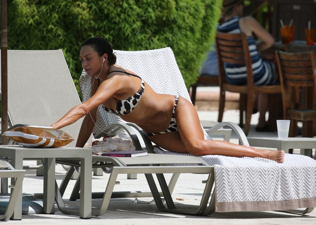 Недавно ставшая свободной Лилли Беккер загорает в бикини с животным принтом вместе со своим сыном Амадеусом Беккером на солнечном пляже Майами, 10.04.2019. Лилли наносит лосьон, в то время как её сын отдыхает на пляжном кресле.