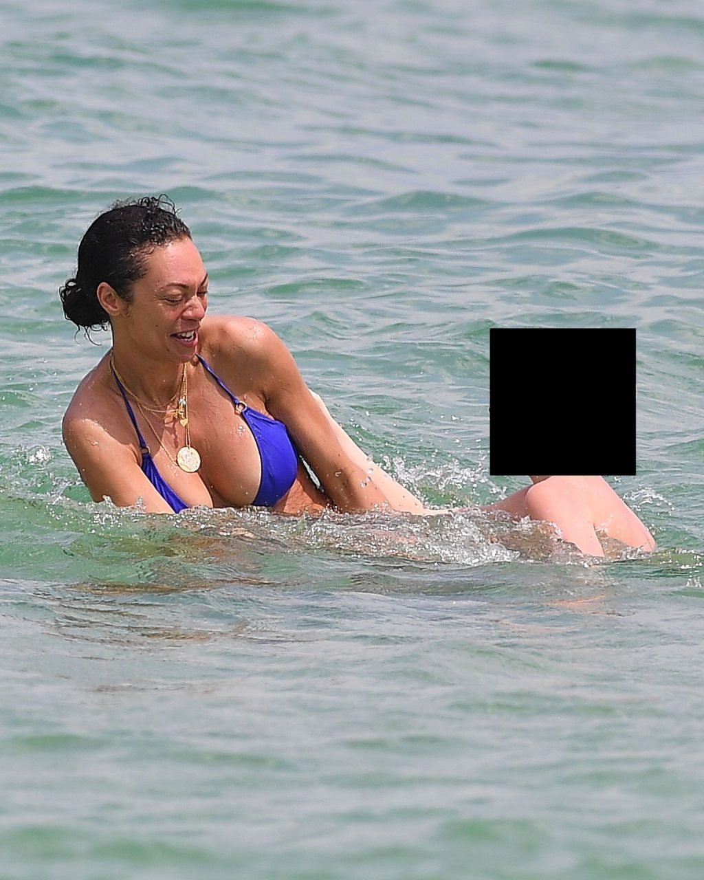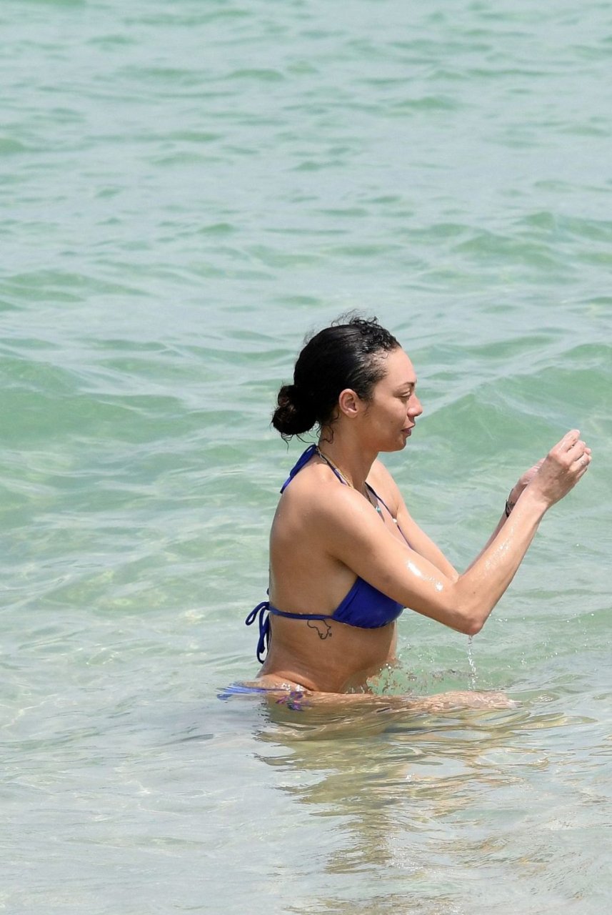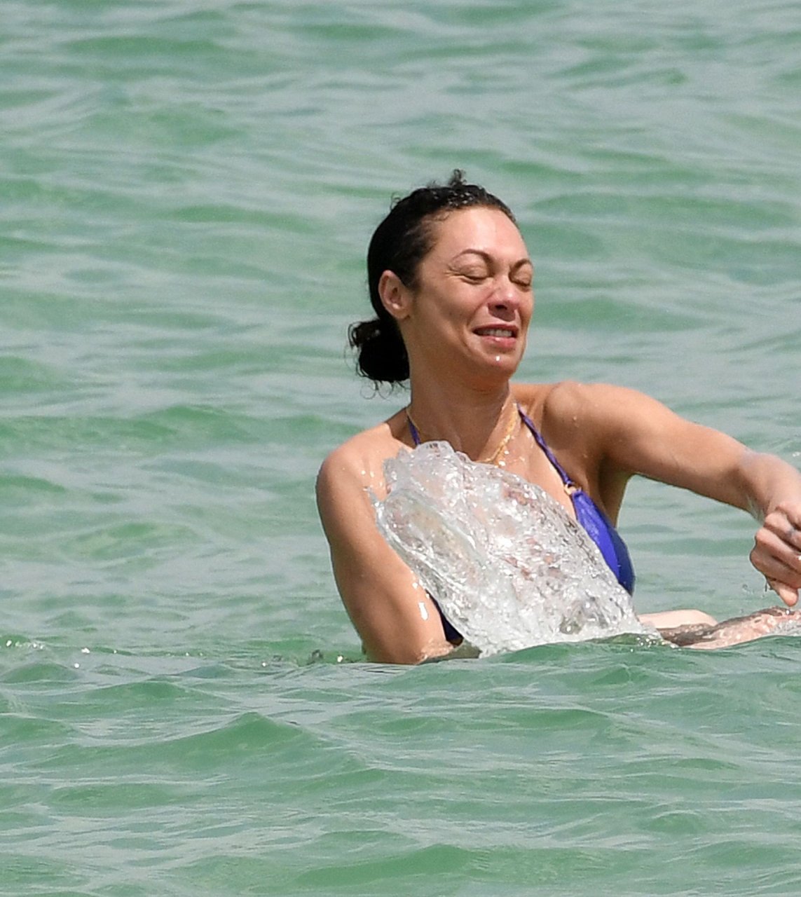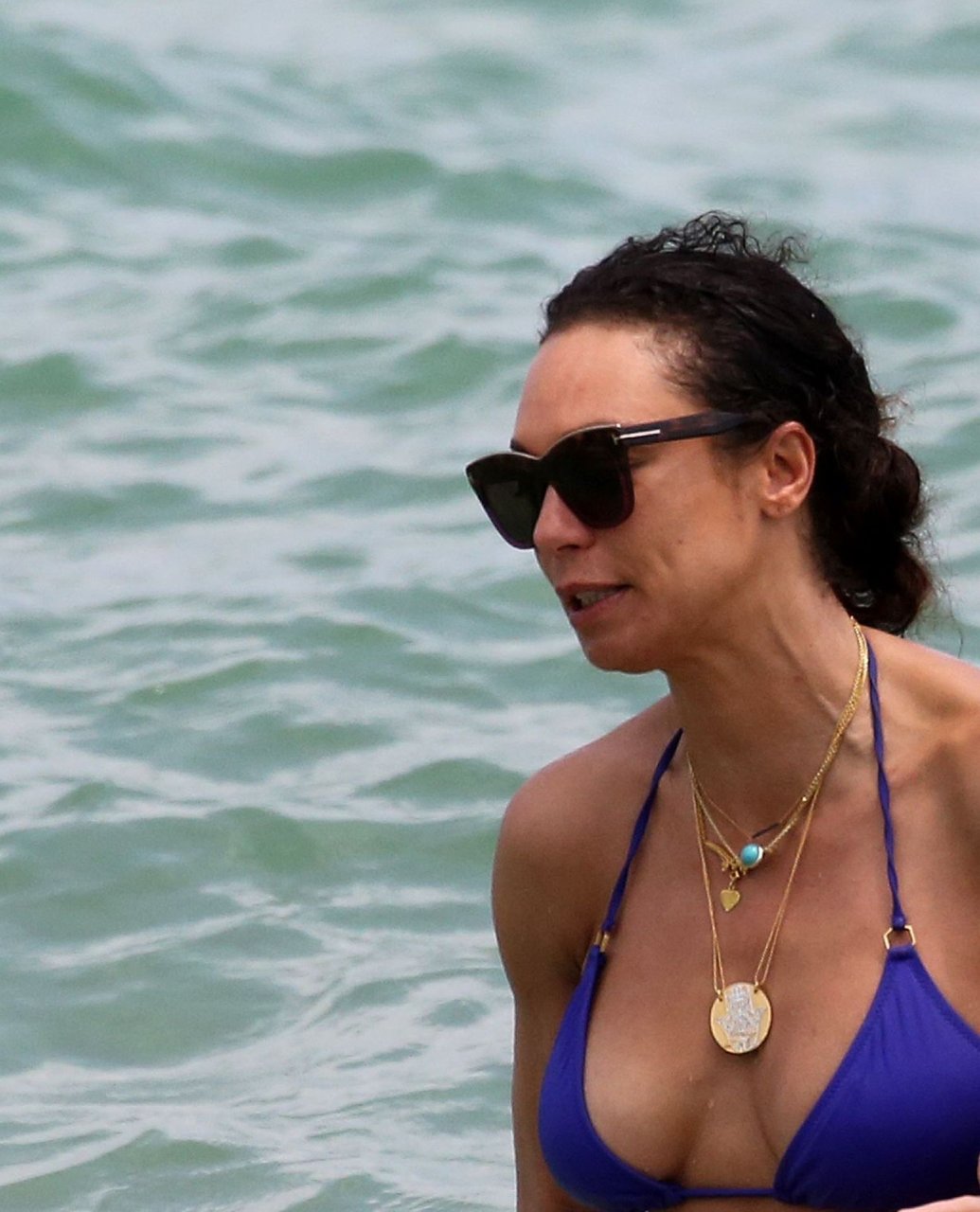 Новосвободившаяся Лилли Беккер в синем стринг-бикини наслаждается волнами вместе с сыном Амадеусом в Майами, 15.04.2019.