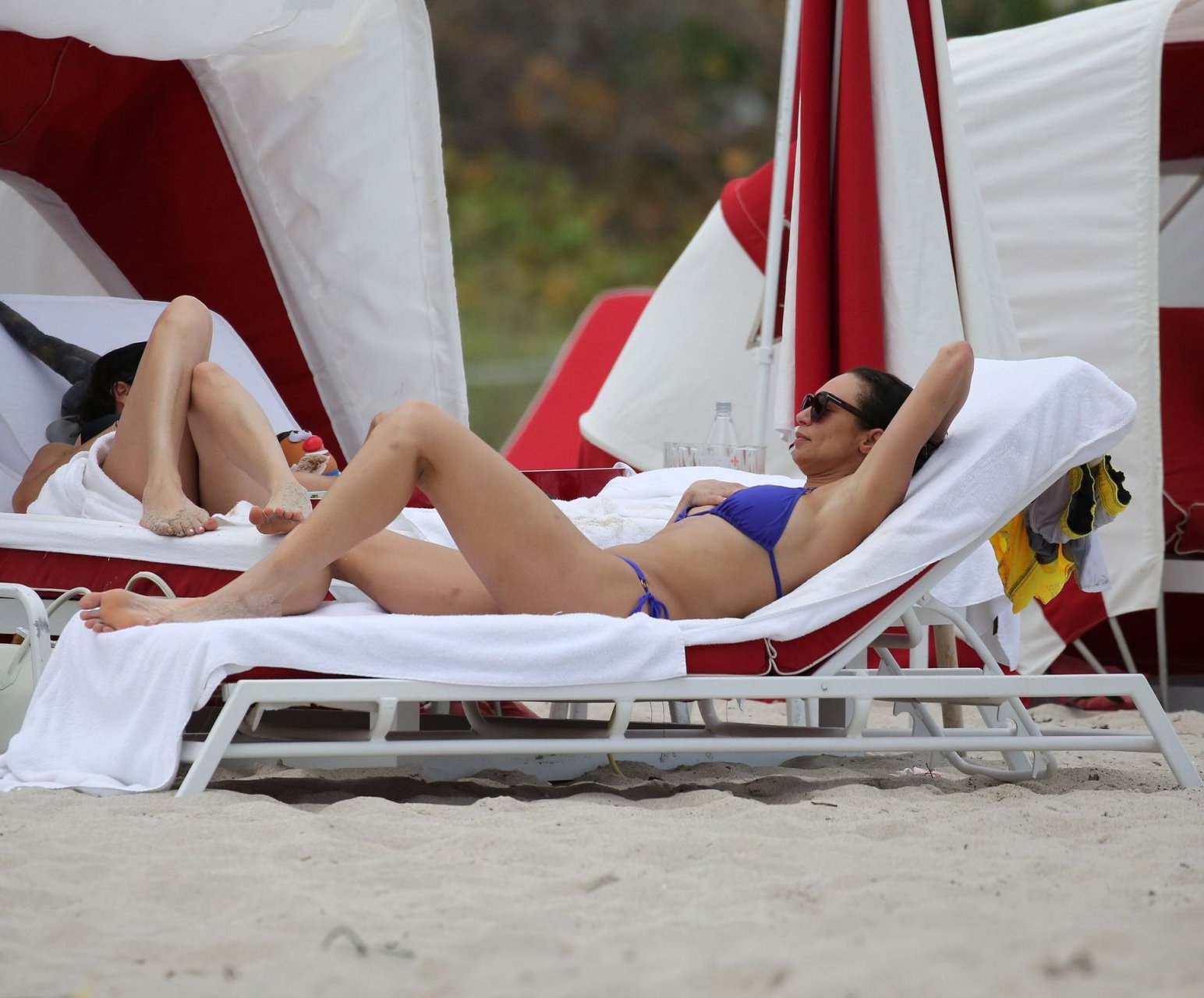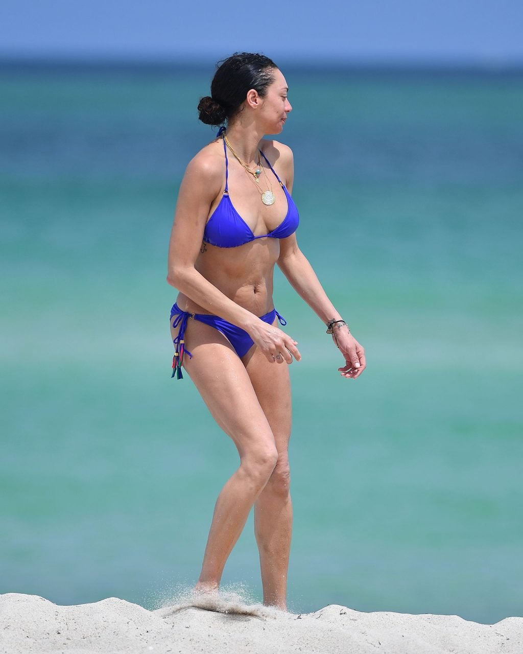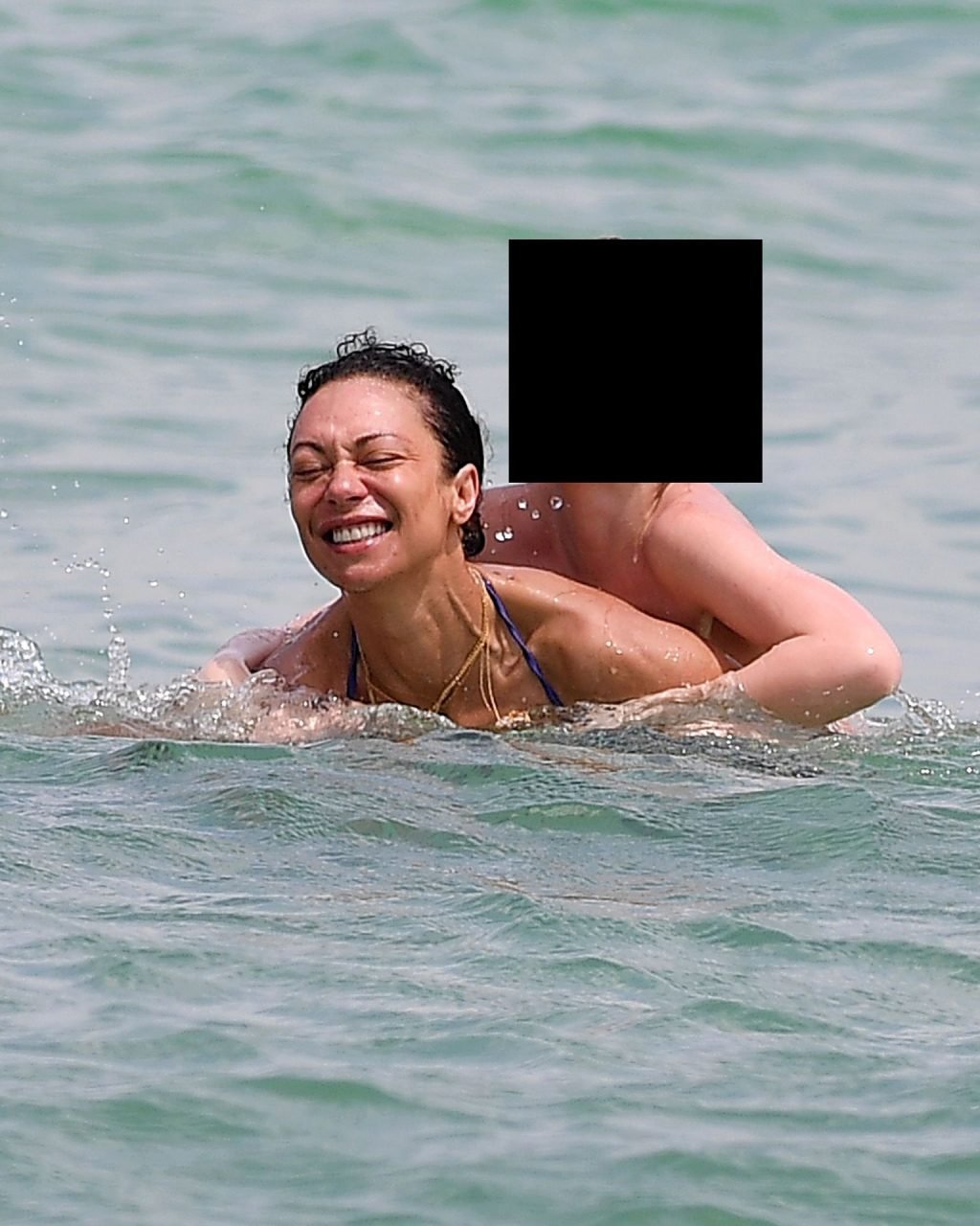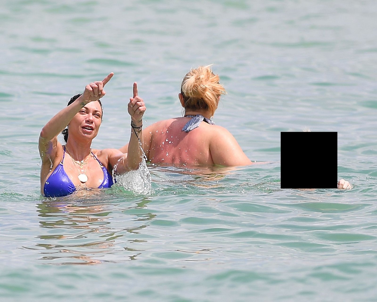 Новосвободившаяся Лилли Беккер в синем стринг-бикини наслаждается волнами вместе с сыном Амадеусом в Майами, 15.04.2019.