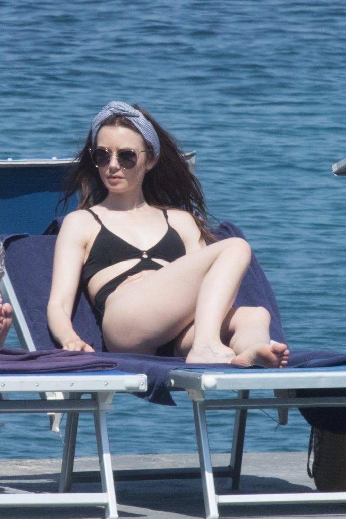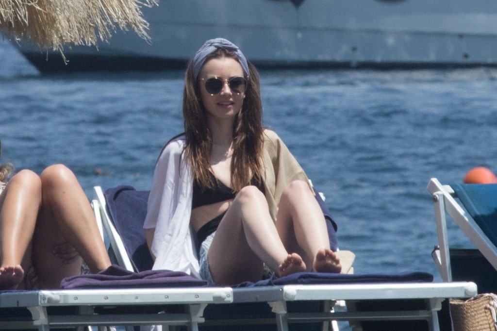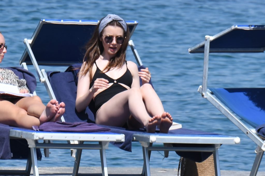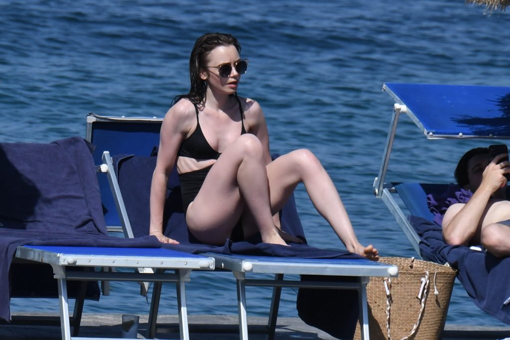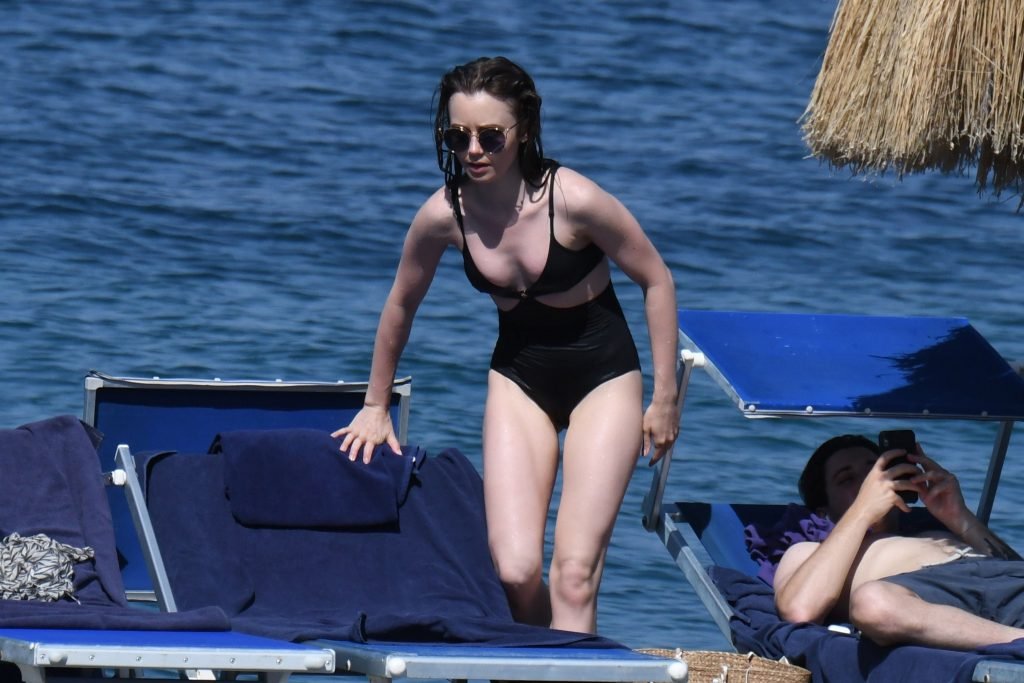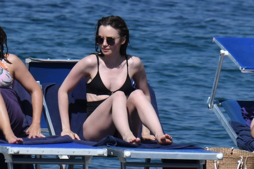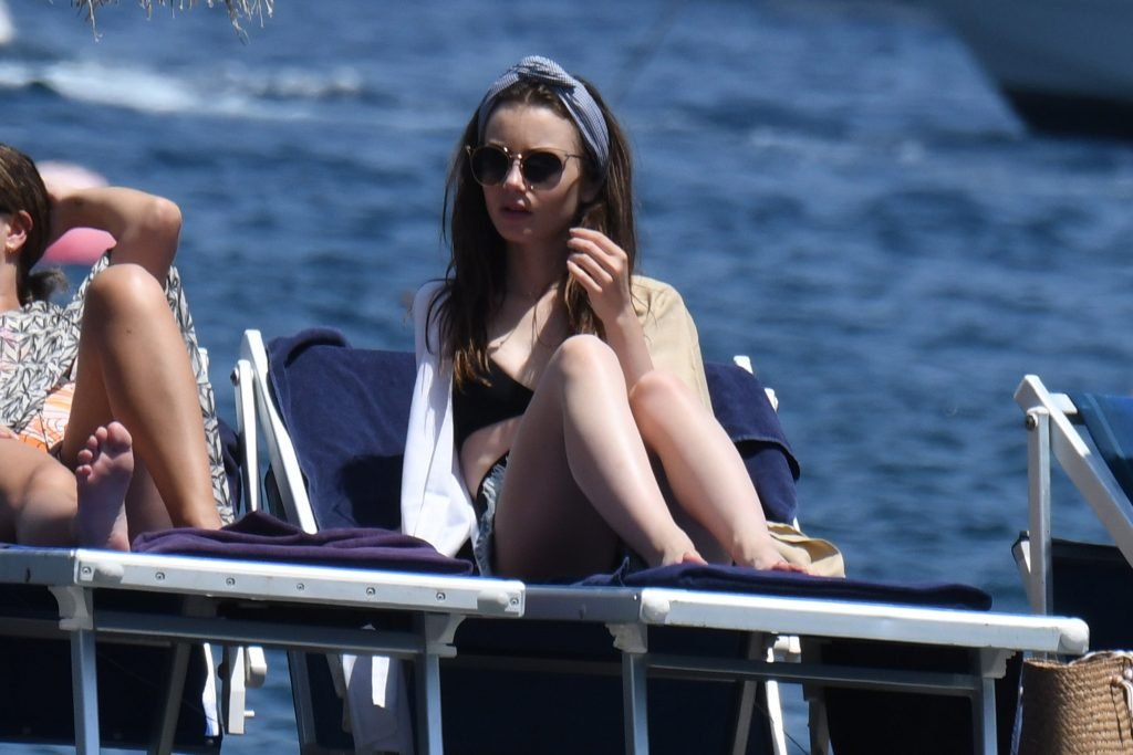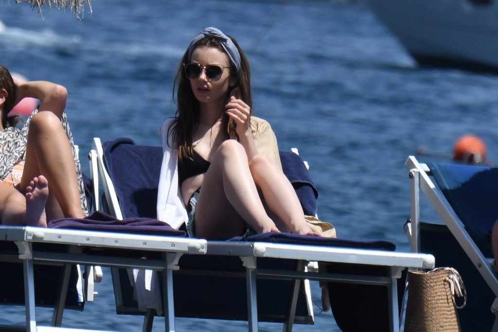 Lily Collins была замечена отдыхающей в отеле Regina Isabella в Искья Порто, Италия, 15.07.2018. 29-летняя актриса была одета в черный цельный купальник.