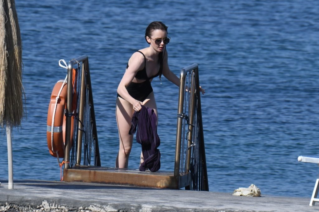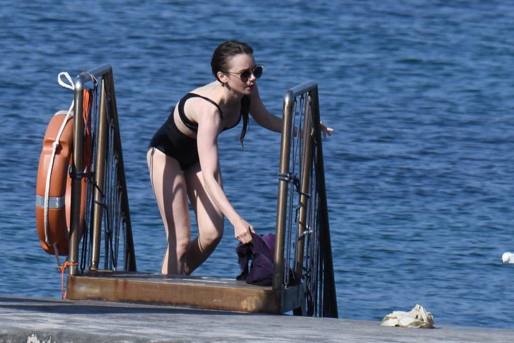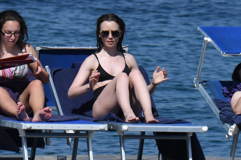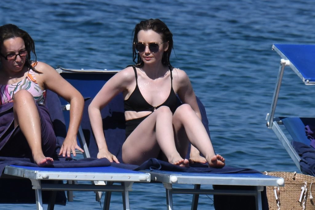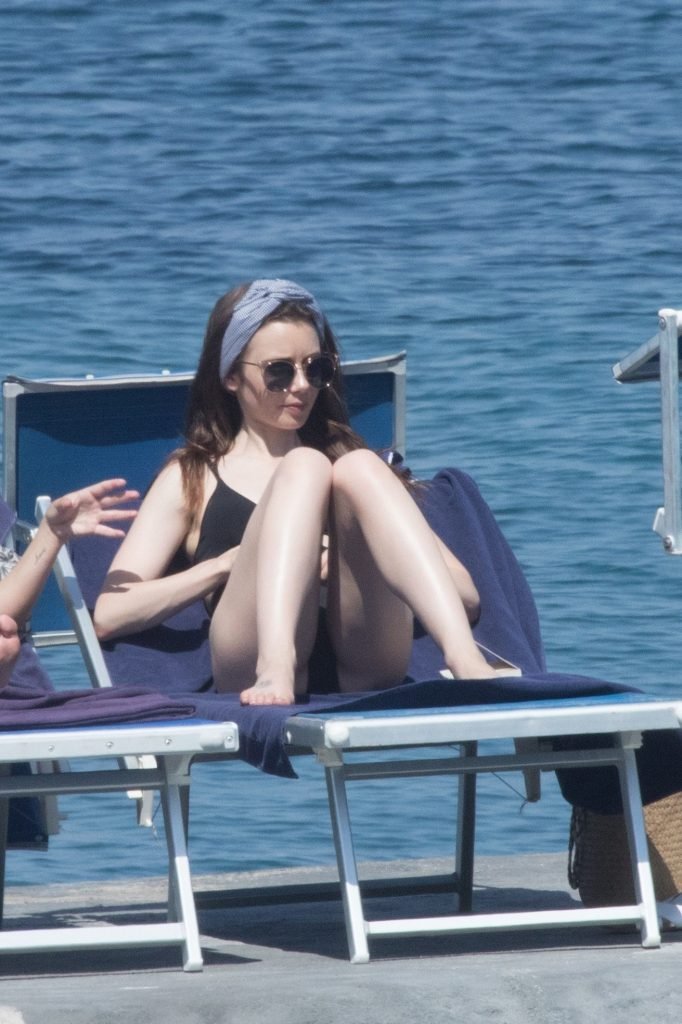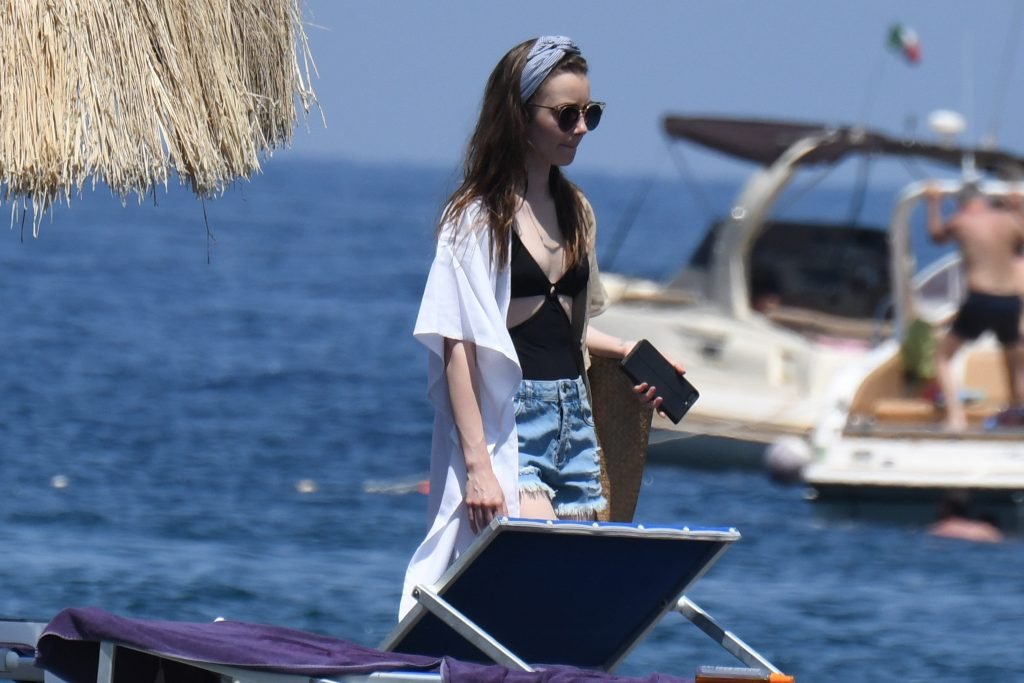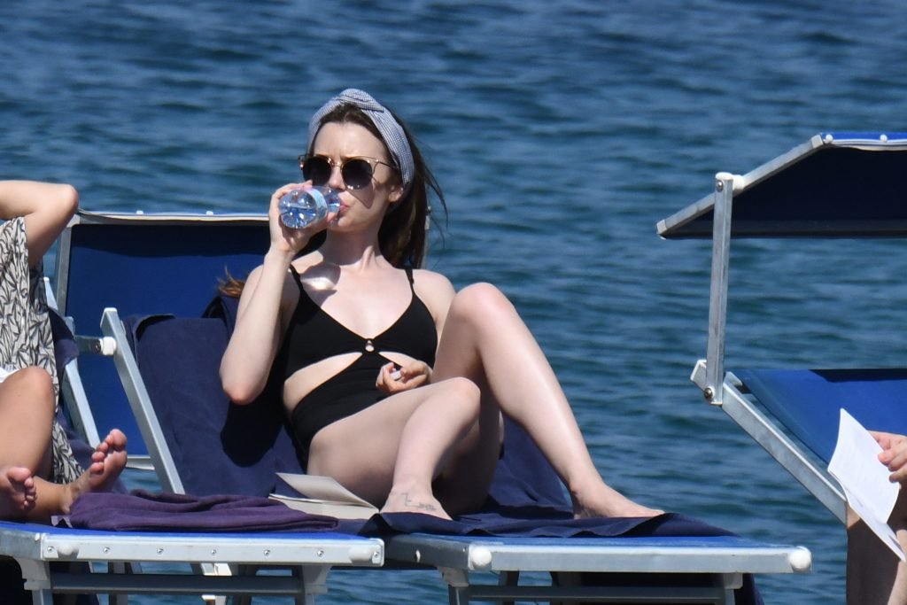 Lily Collins была замечена отдыхающей в отеле Regina Isabella в Искья Порто, Италия, 15.07.2018. 29-летняя актриса была одета в черный цельный купальник.