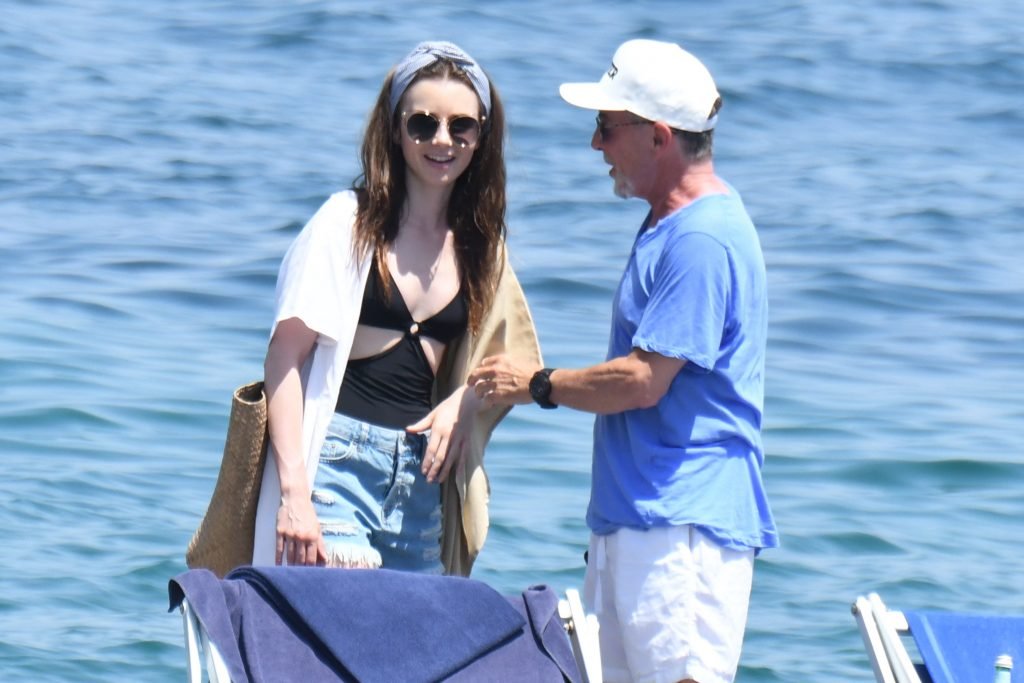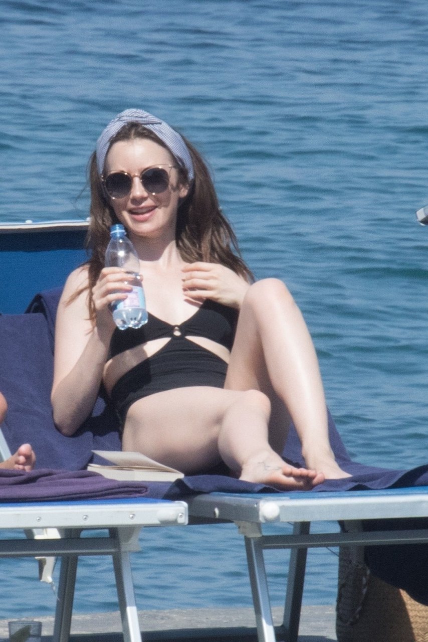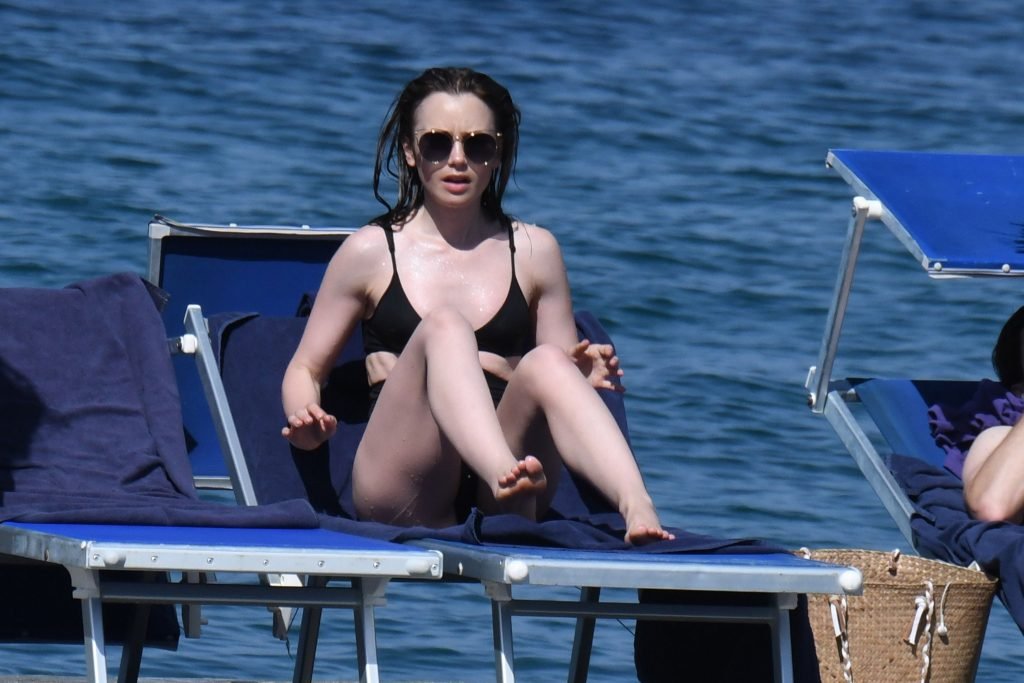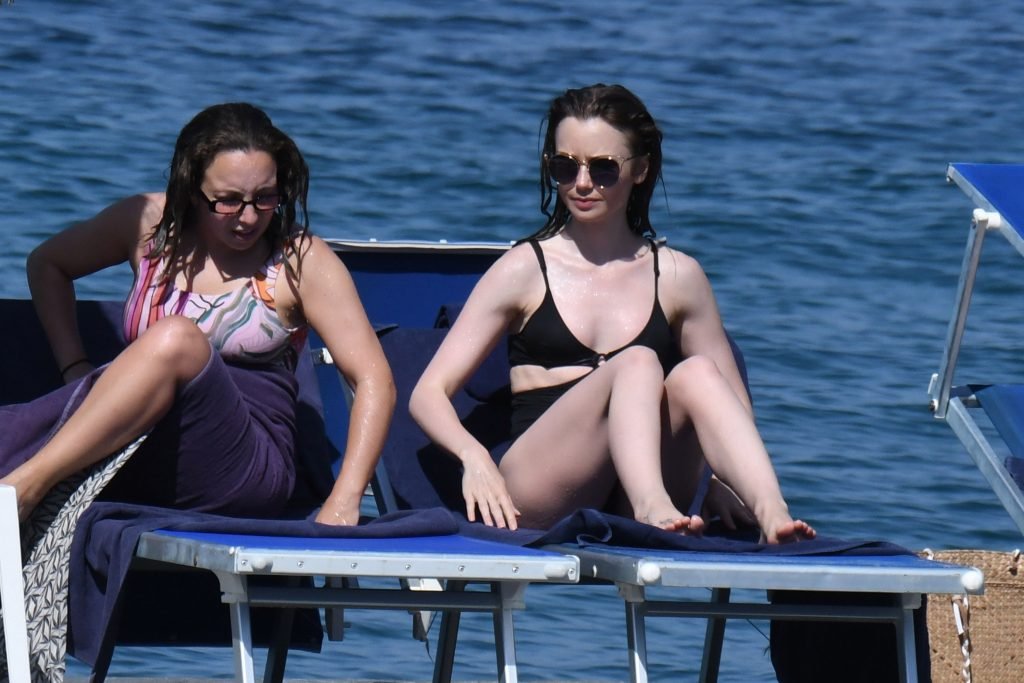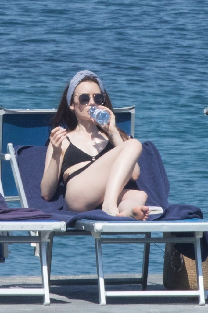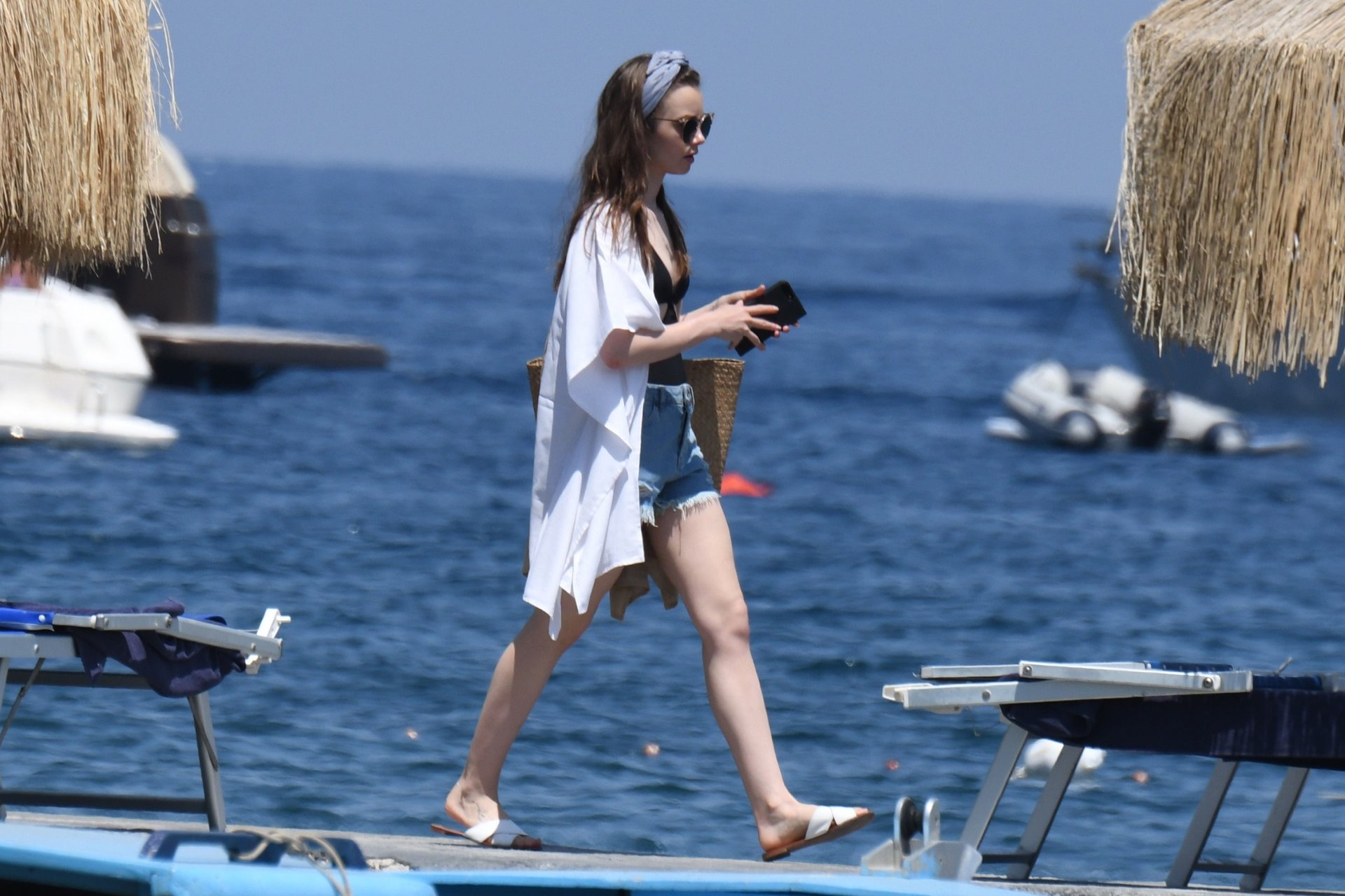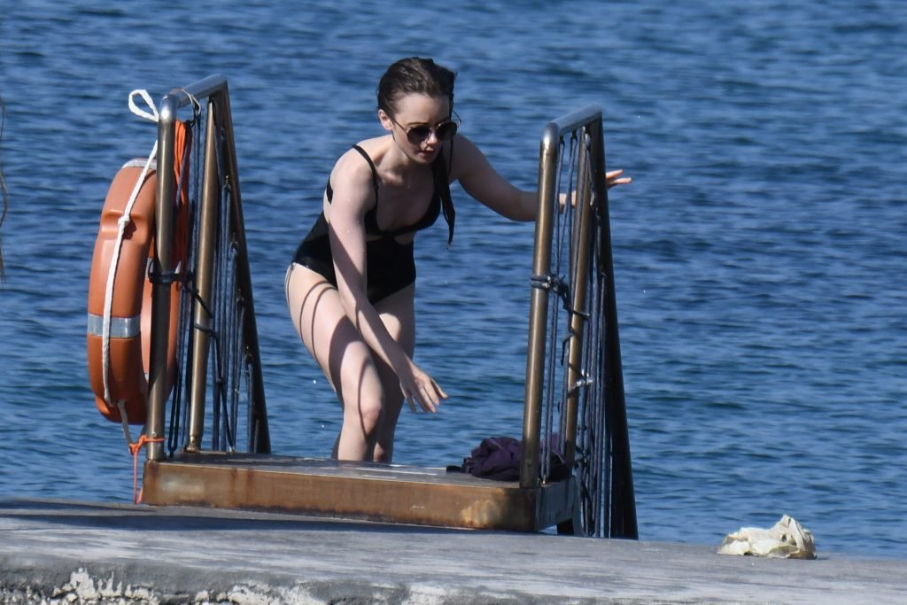 Lily Collins была замечена отдыхающей в отеле Regina Isabella в Искья Порто, Италия, 15.07.2018. 29-летняя актриса была одета в черный цельный купальник.