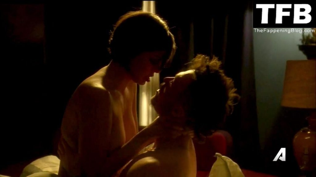 Лина Эско демонстрирует много декольте, будучи топлесс сверху на парне, с сосками чуть вне поля зрения, пока она едет на нём в этой секс-сцене.
