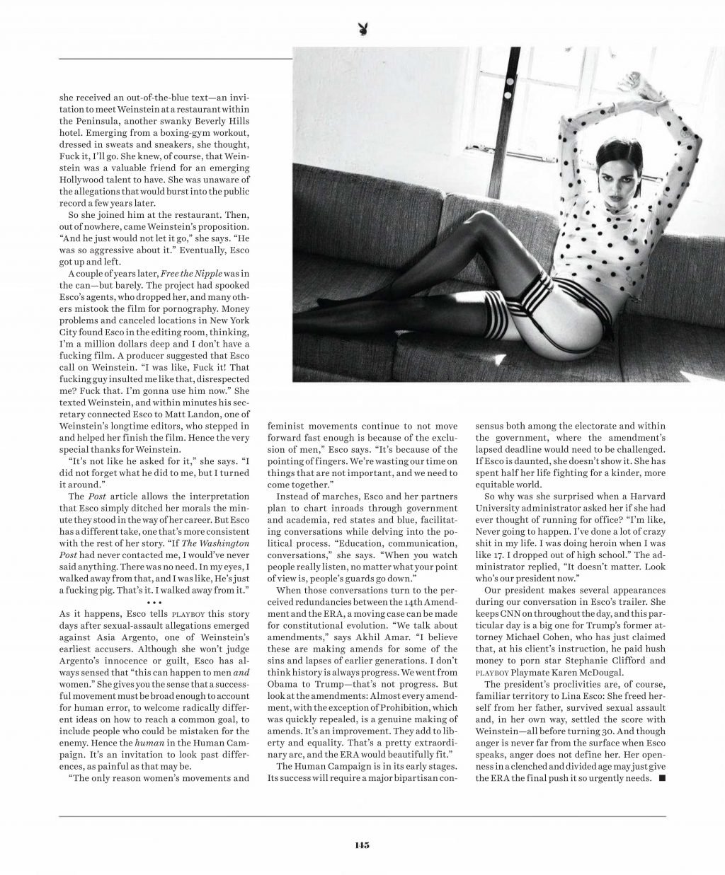 Лина Эско демонстрирует свои груди в фотосессии для журнала Playboy (ноябрь 2018). Лина Эско — 33-летняя американская актриса и активистка. Она стала известна в 2007 году, сыграв роль дочери Джимми Смита в драматическом сериале «Cane». Также она снималась в голливудских фильмах, таких как «London» (2005), «Kingshighway» (2010) и «LOL» (2012). Она также известна ролями в фильме «Free the Nipple» (2014) и телесериалах «Flaked» (2016) и «Kingdom» (2016).