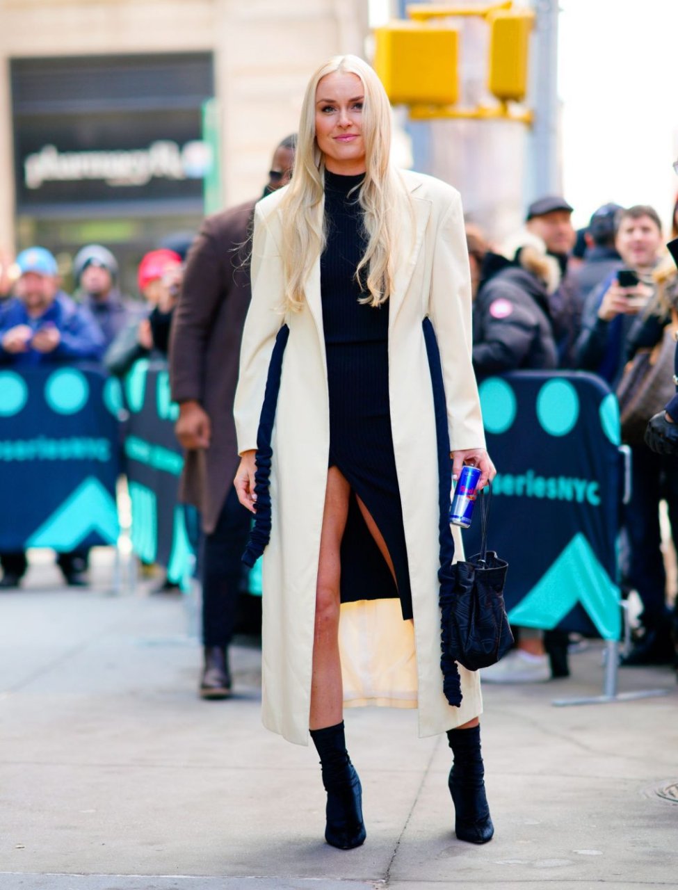 Американская олимпийская лыжница Линдси Вонн покидает студию AOL Build Series после участия в шоу, на котором в её чёрном платье с разрезом видно, по-видимому, её нижнее бельё в Нью-Йорке, 21.02.2019.