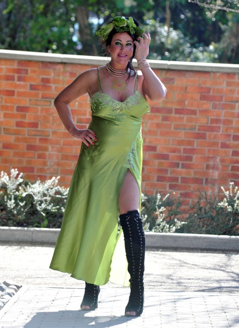 Бывшая звезда “Большого Брата” Лиза Эпплтон одета полностью в зелёное с сексуальными сапогами до колена, демонстрируя тело, пока направляется на Ladies Day в Эйнтри, Ливерпуль, 04/05/2019.