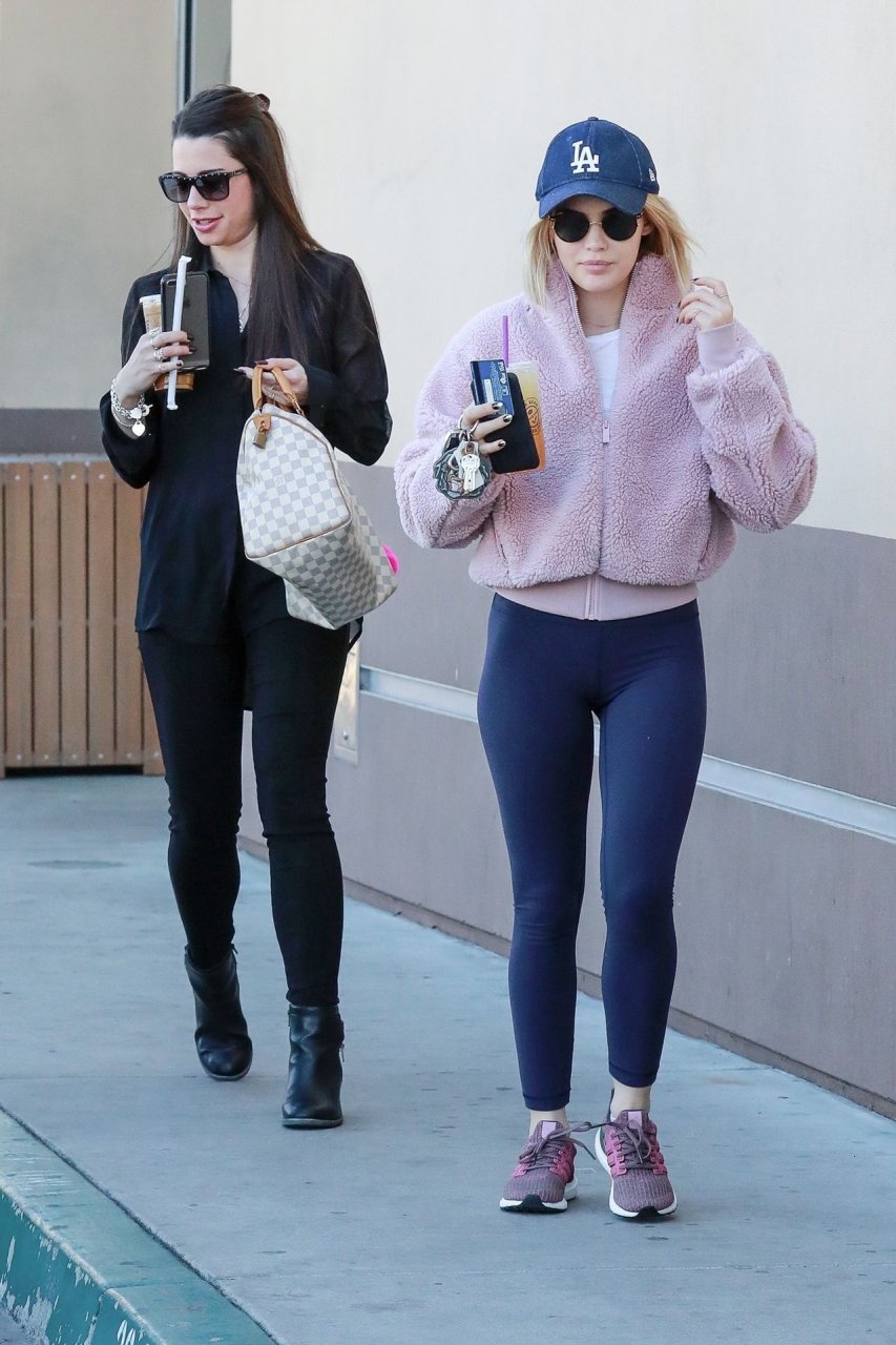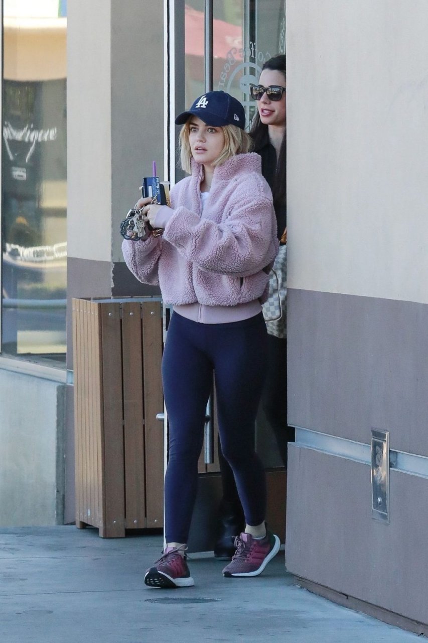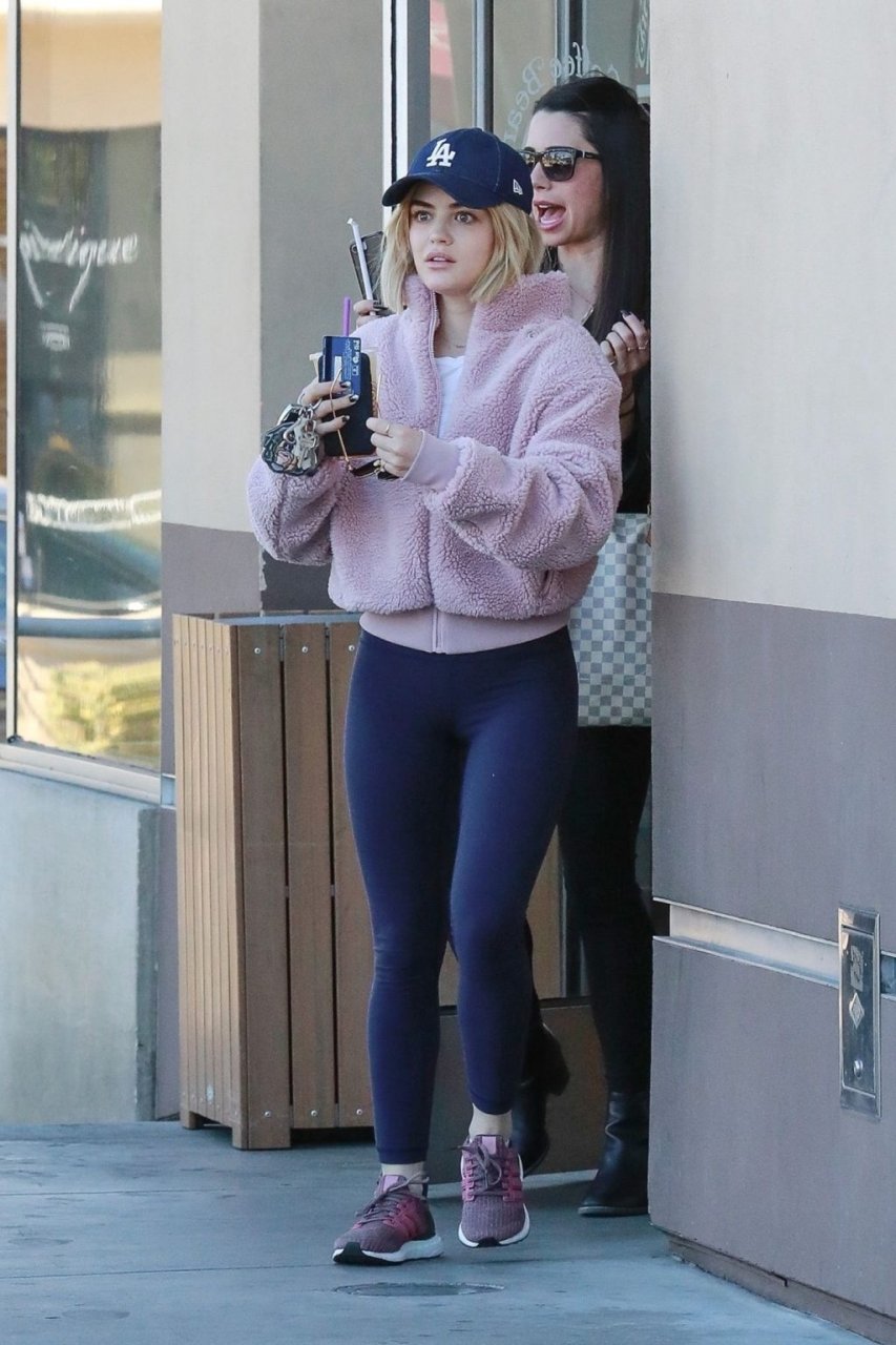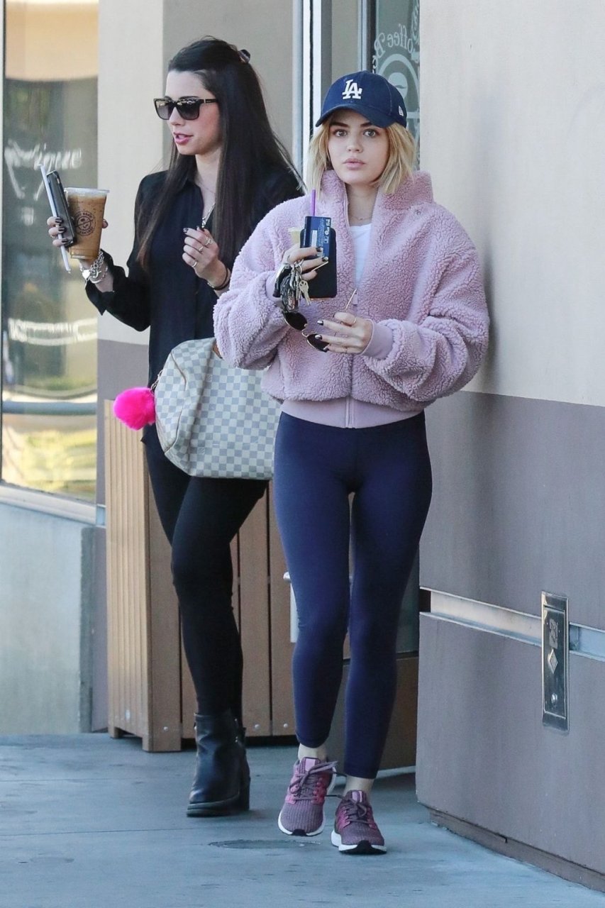 Люси Хейл зашла в свою любимую кофейню, чтобы взять напиток с собой, общаясь с подругой в Студио-Сити, 01.04.2019. 29-летняя актриса была в облегающем спандексе, подчеркивающем её привлекательную фигуру.