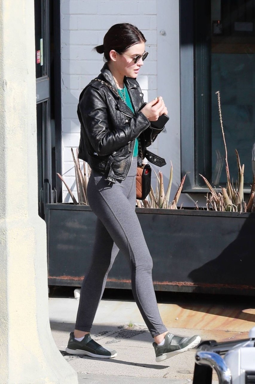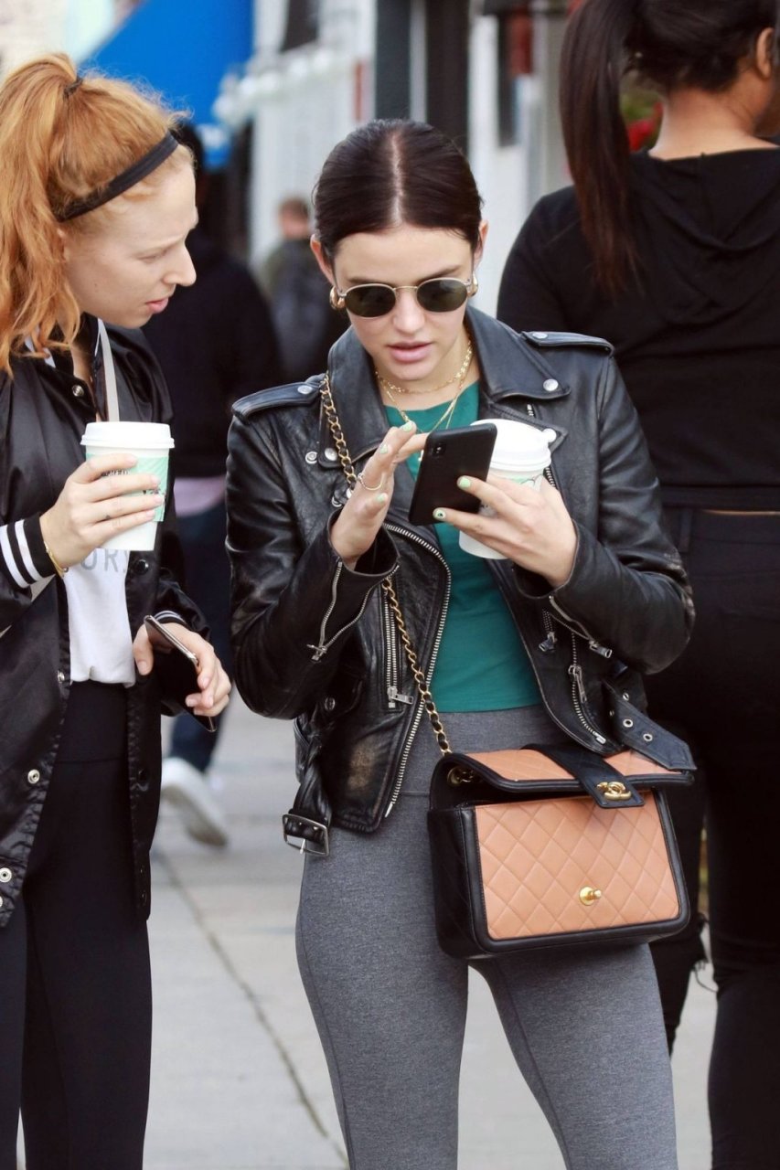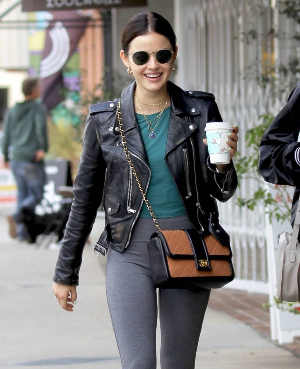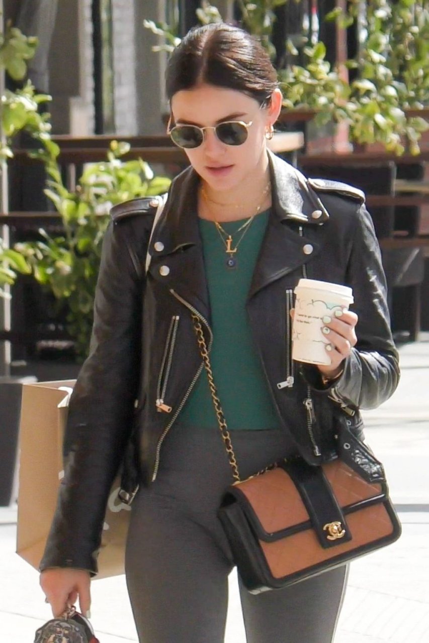 Актриса Люси Хейл демонстрирует сумку Chanel, обтягивающие леггинсы и кожаную мотоциклетную куртку в Alfred Coffee в Студио-Сити, 05.04.2019. Шов на правильном месте!