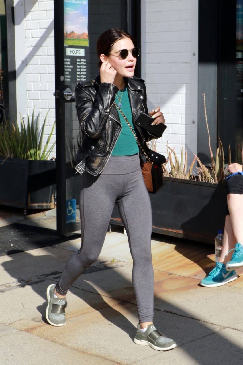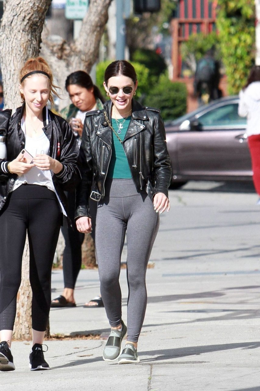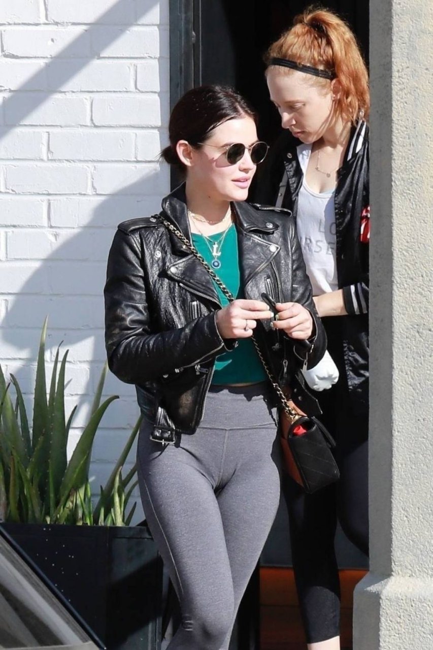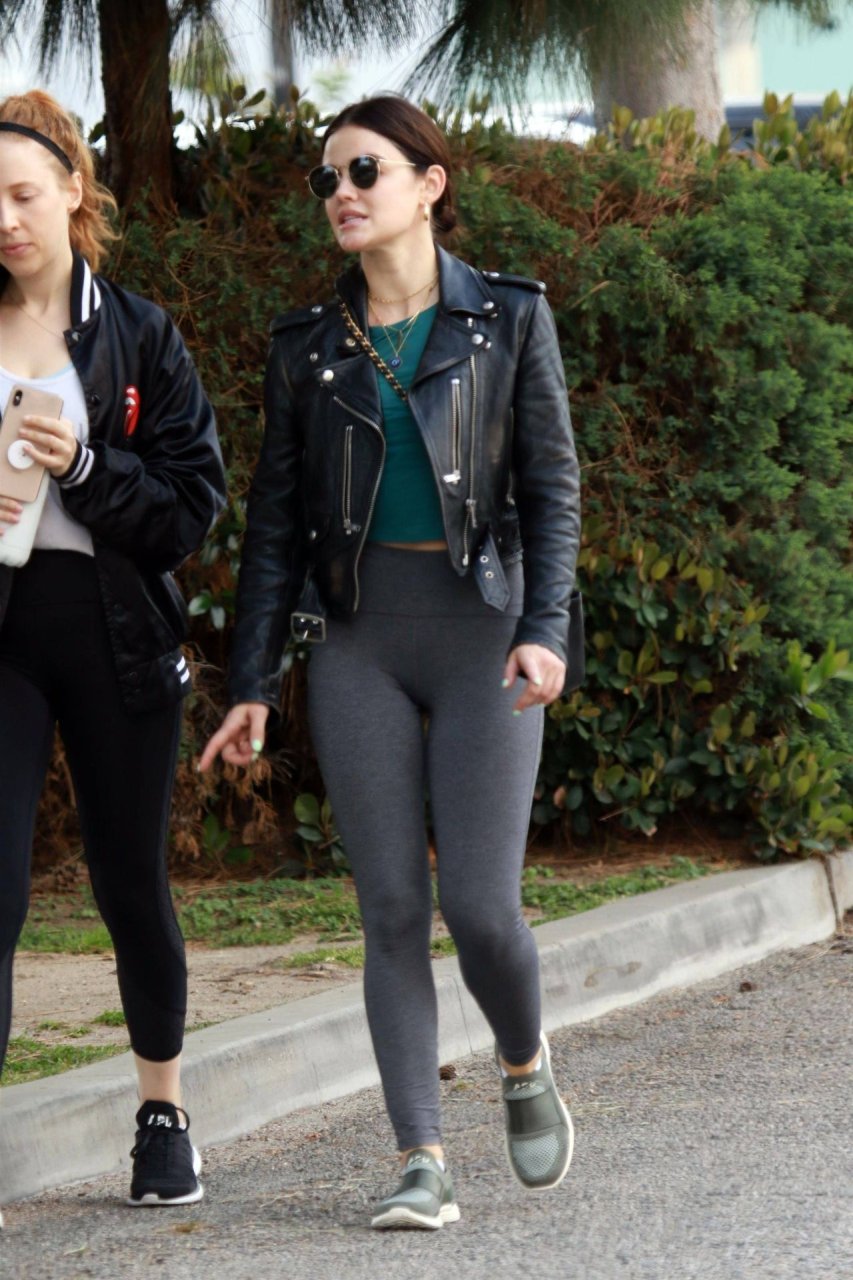 Актриса Люси Хейл демонстрирует сумку Chanel, обтягивающие леггинсы и кожаную мотоциклетную куртку в Alfred Coffee в Студио-Сити, 05.04.2019. Шов на правильном месте!
