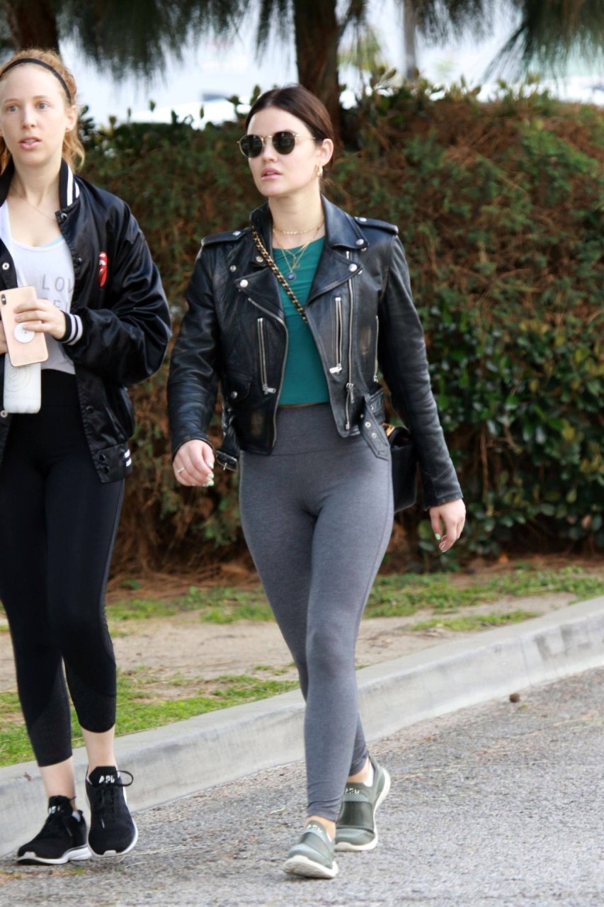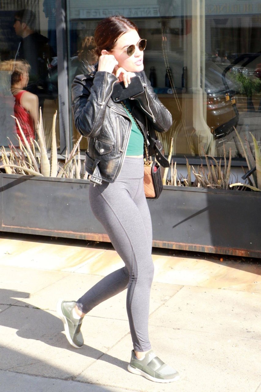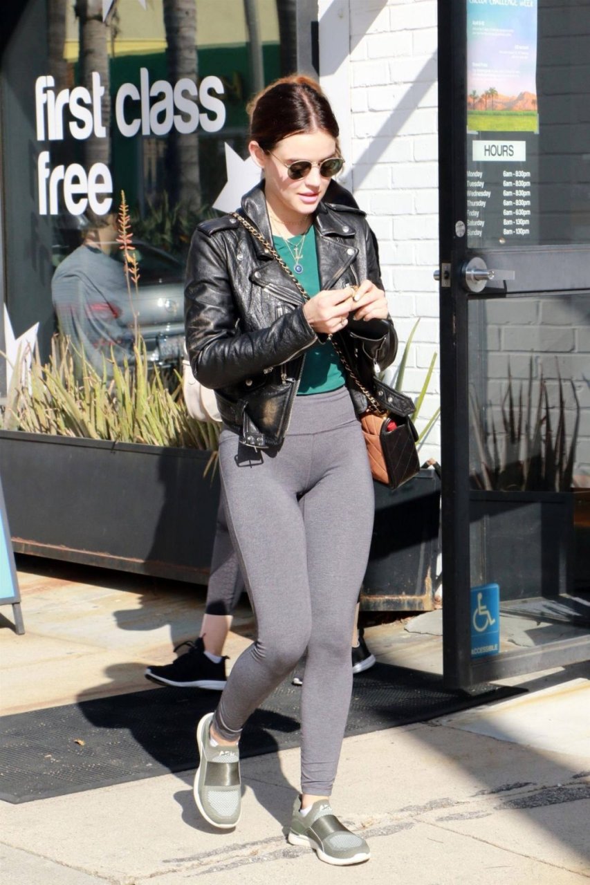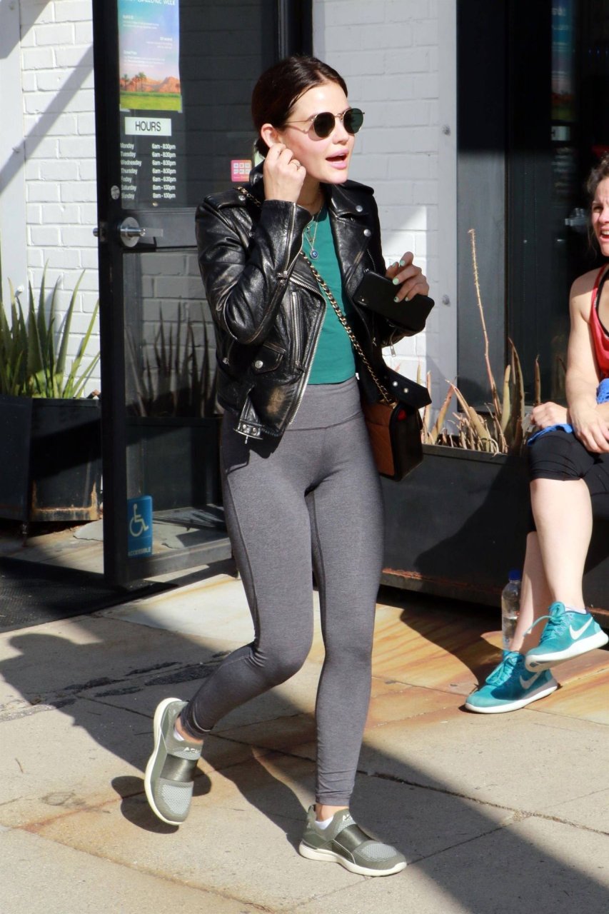 Актриса Люси Хейл демонстрирует сумку Chanel, обтягивающие леггинсы и кожаную мотоциклетную куртку в Alfred Coffee в Студио-Сити, 05.04.2019. Шов на правильном месте!